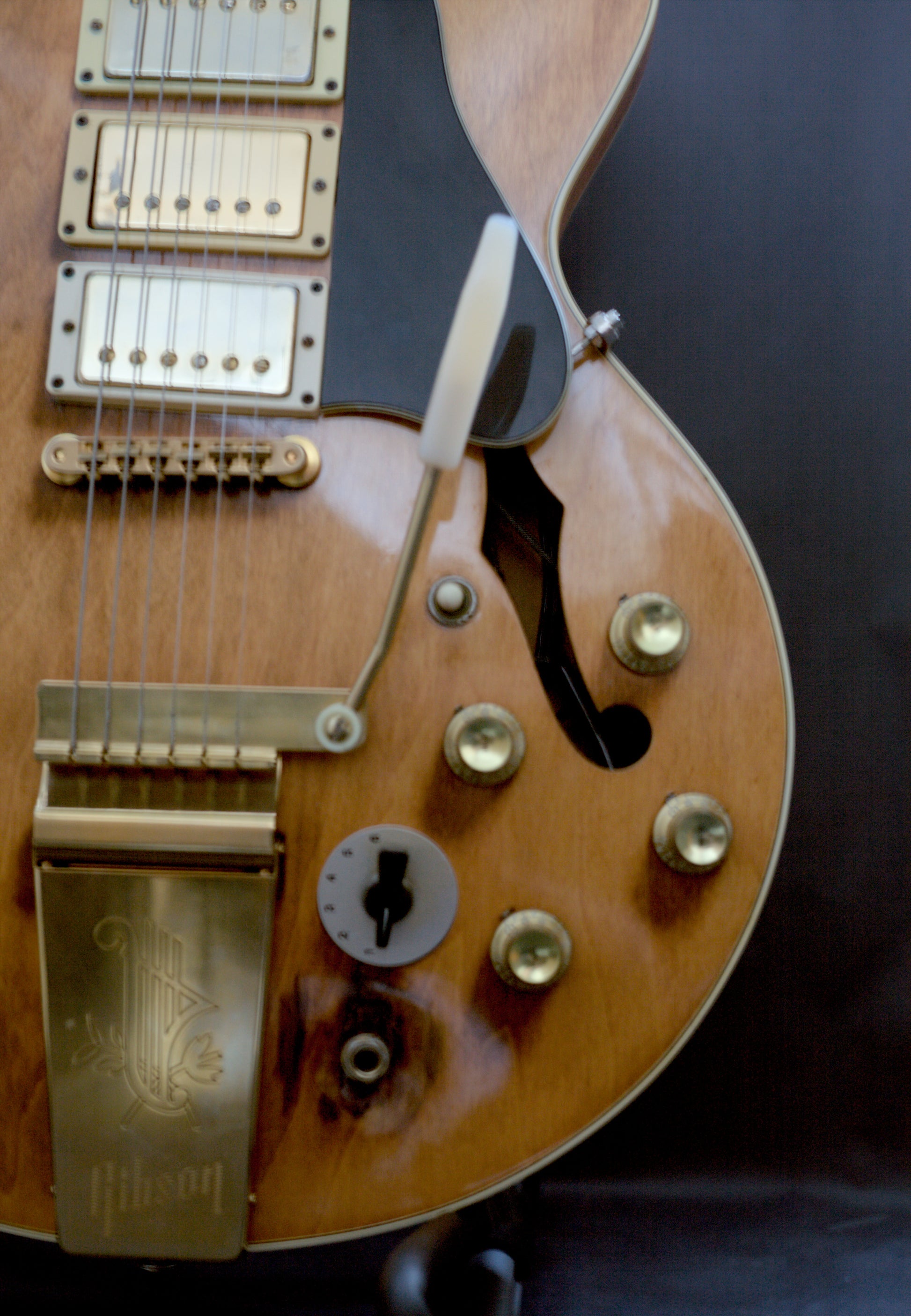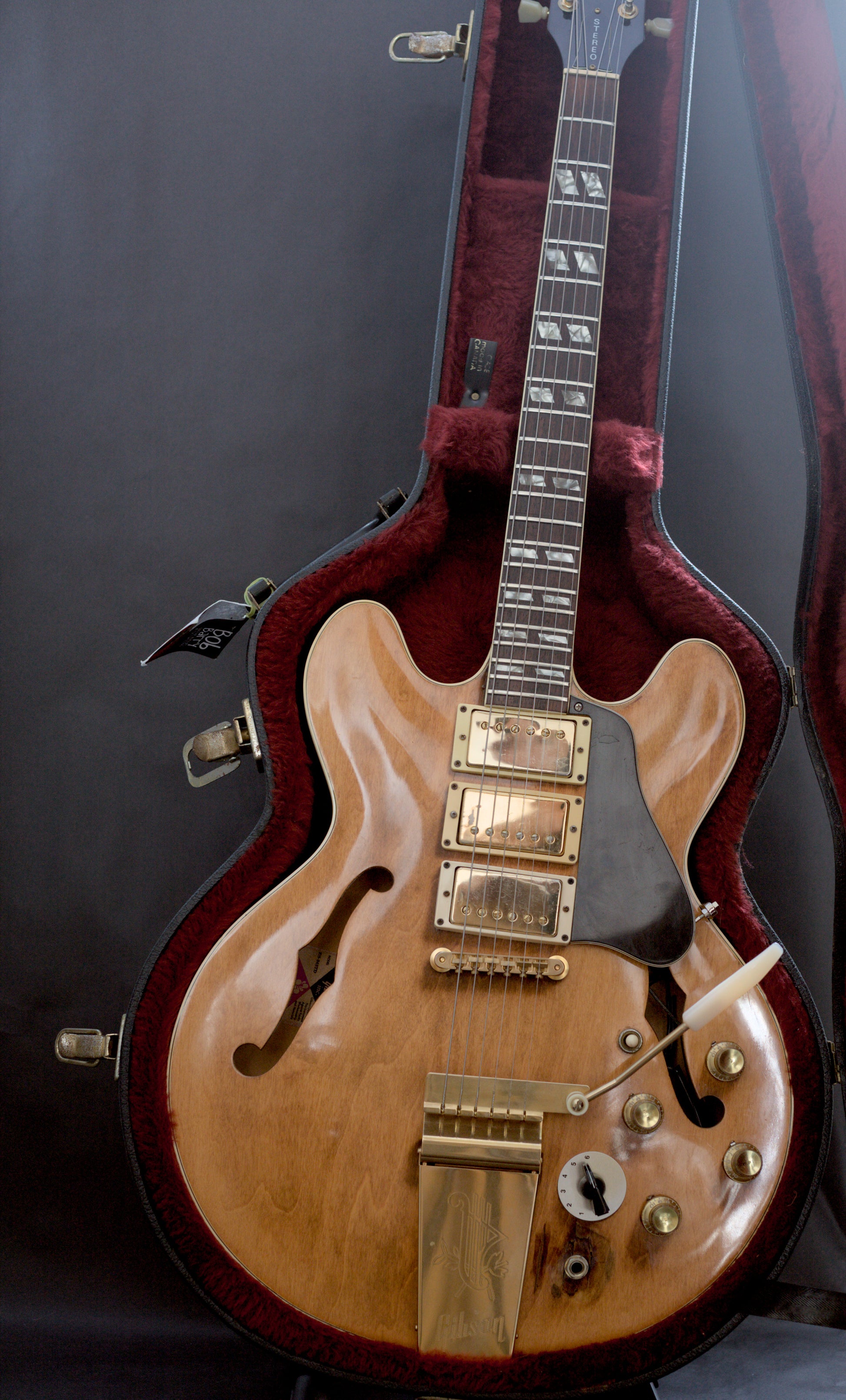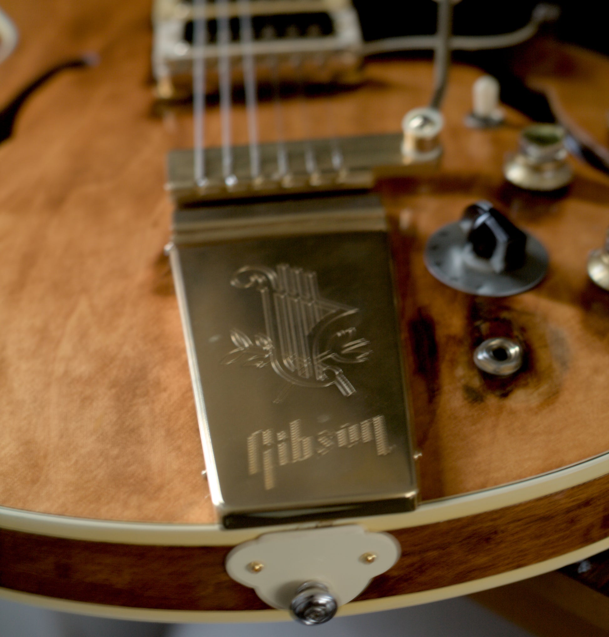 This beautiful example has had some modifications over the years. A Tim Shaw pickup was added to the middle position at some time during the '80s. The original tuners have been replaced with Gibson Deluxes. The varitone switch has been deactivated, but the choke is included in the case if you want to wire it back up,. Most recently, it has been fitted with a super cool Gibson Maestro Vibrola tailpiece, which really elevates the look.