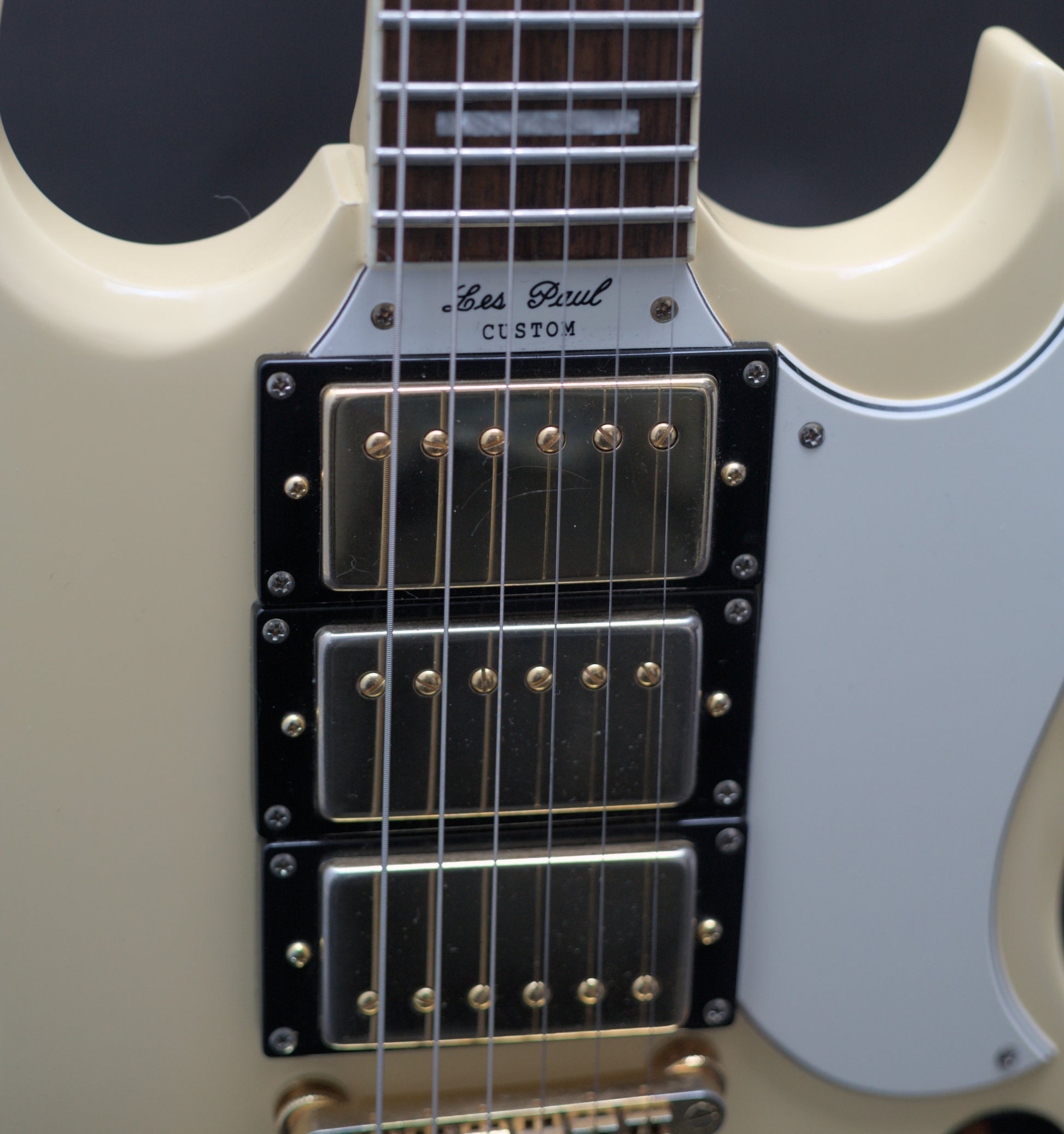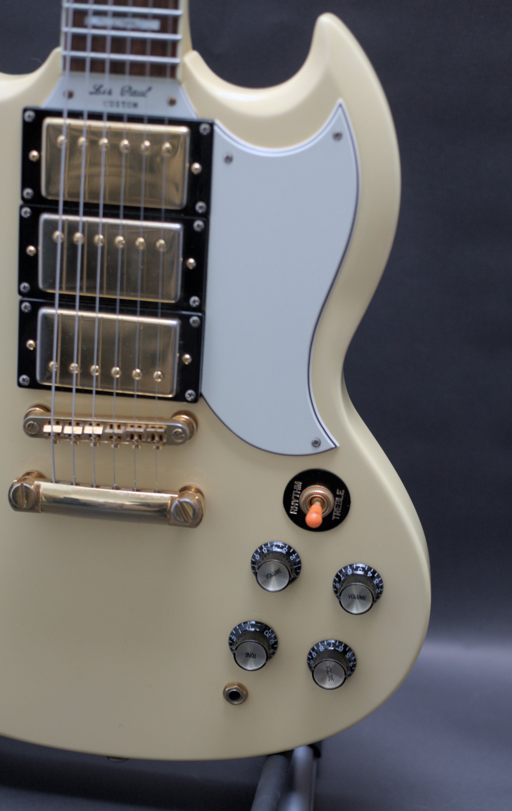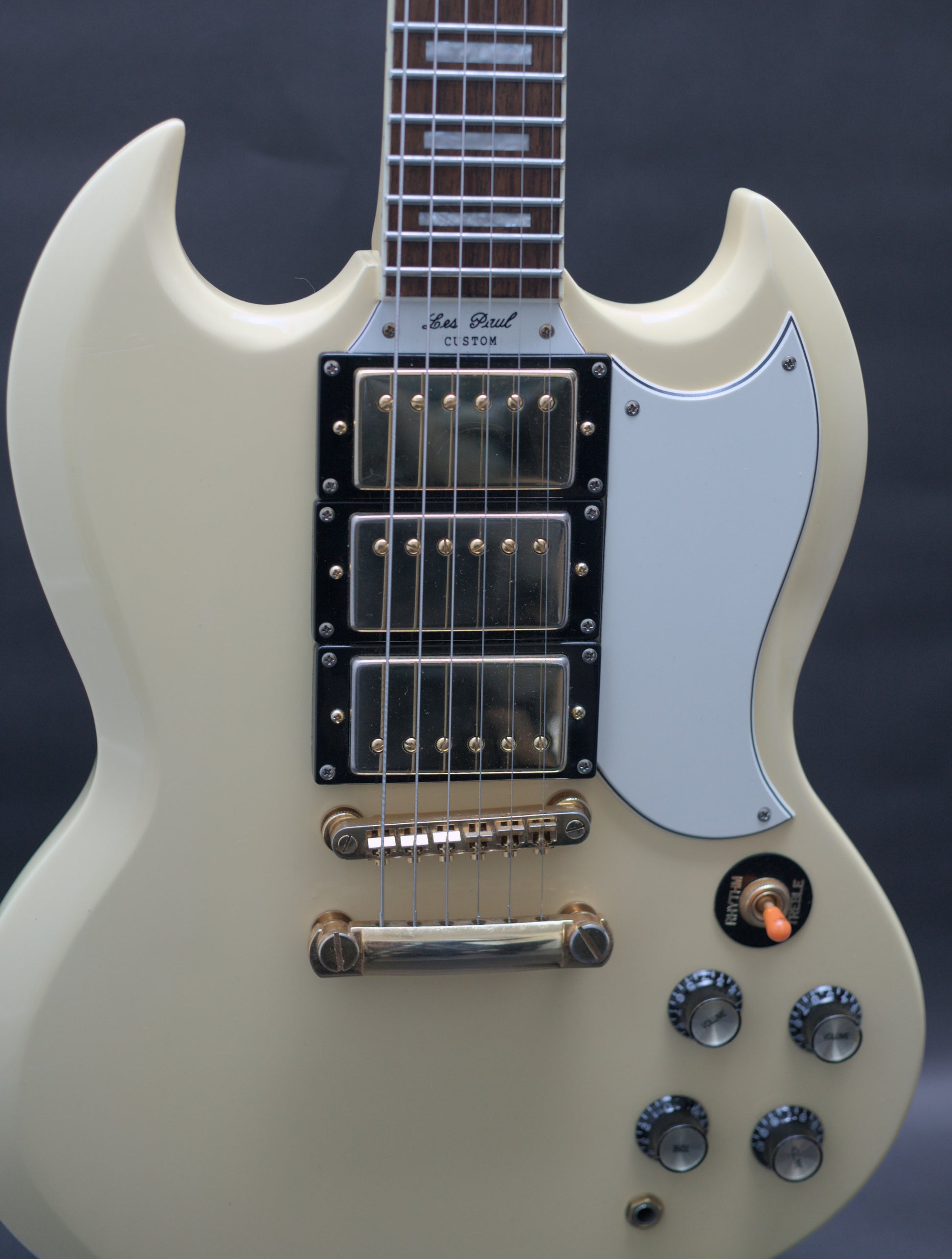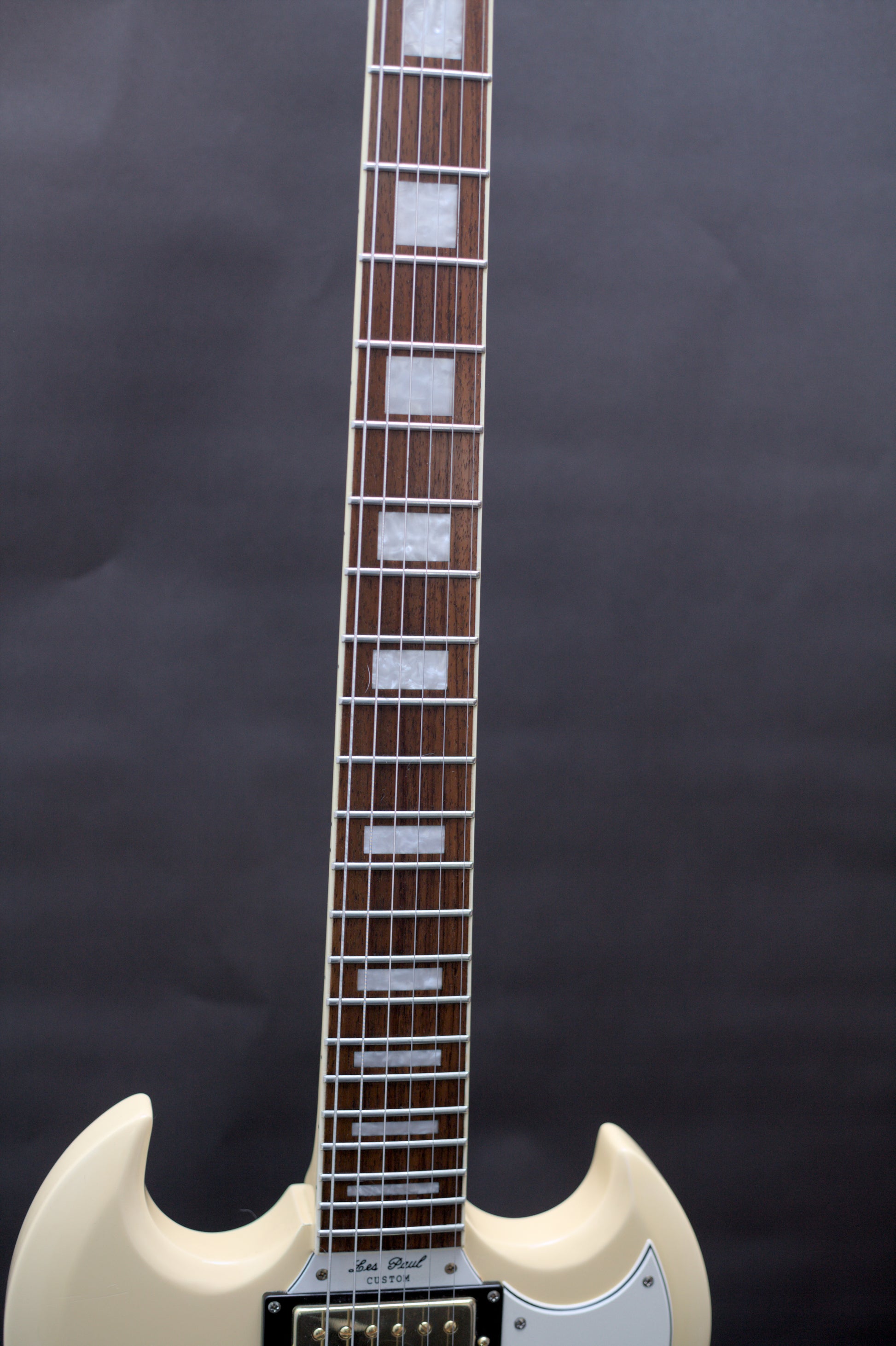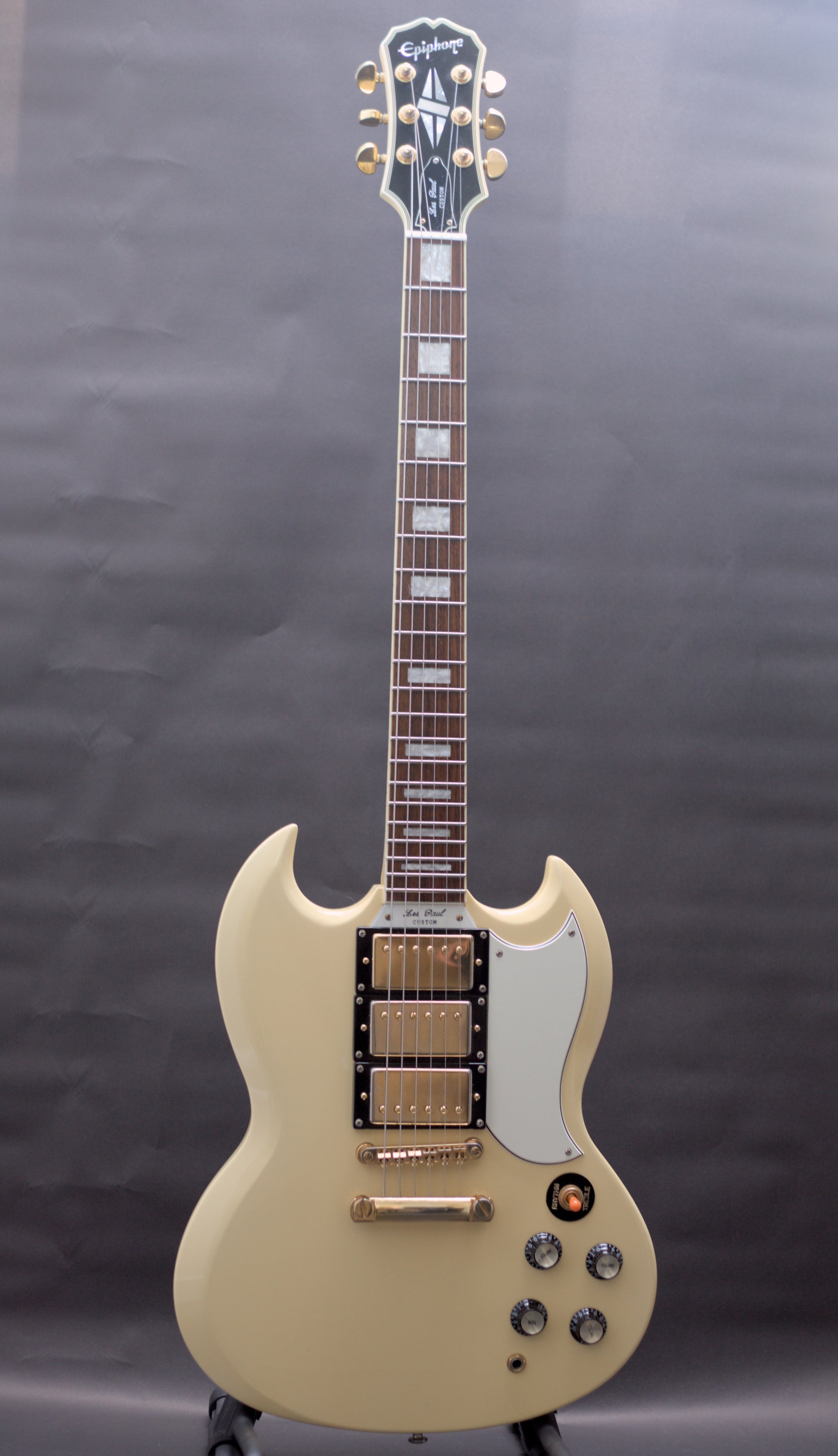 How good does the 3 pickup SG Custom look in Ivory? A stunning guitar, and this one is an excellent player. Being a Korean-made model, it is a step above the Chinese Epiphones in respect to build quality.