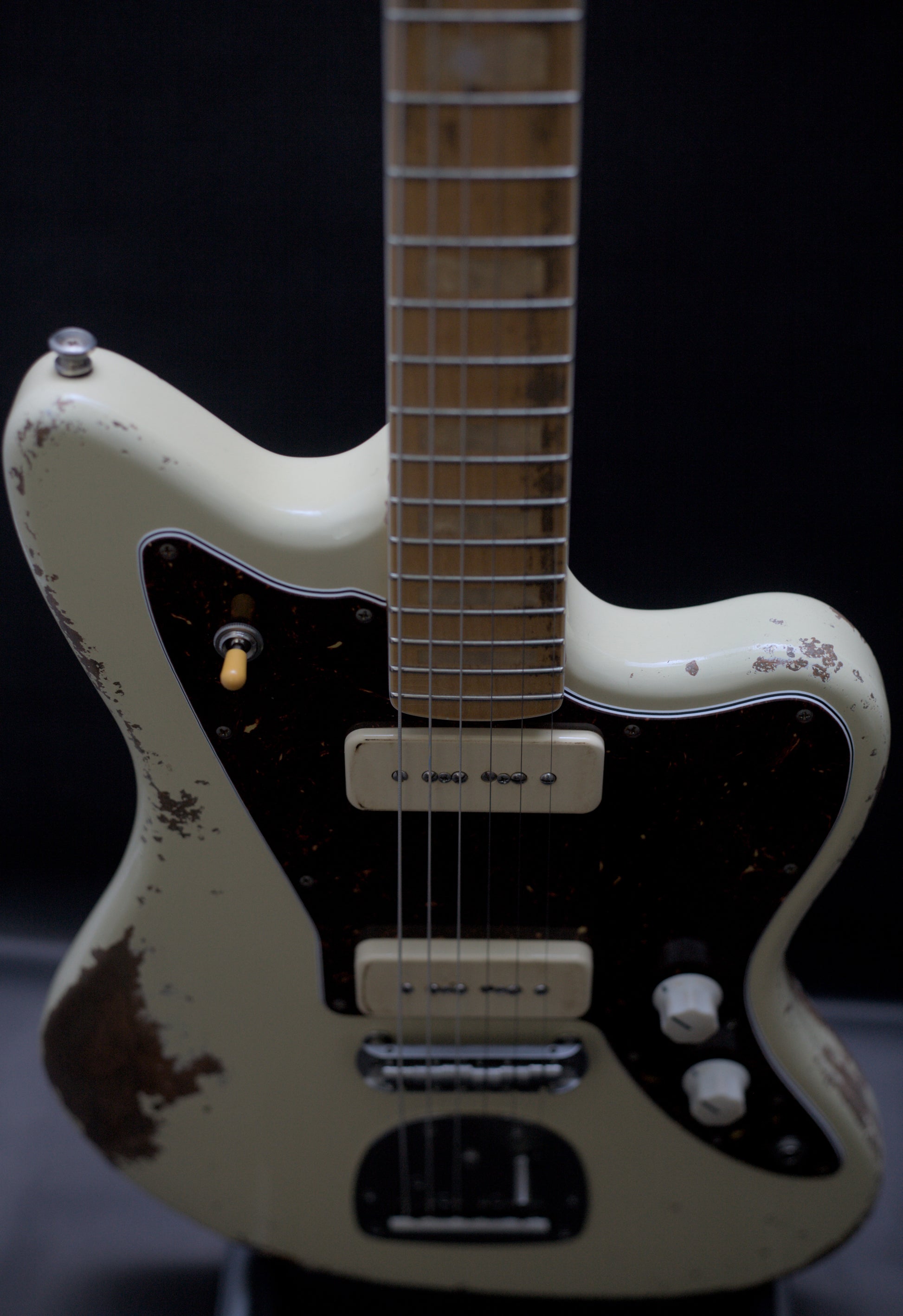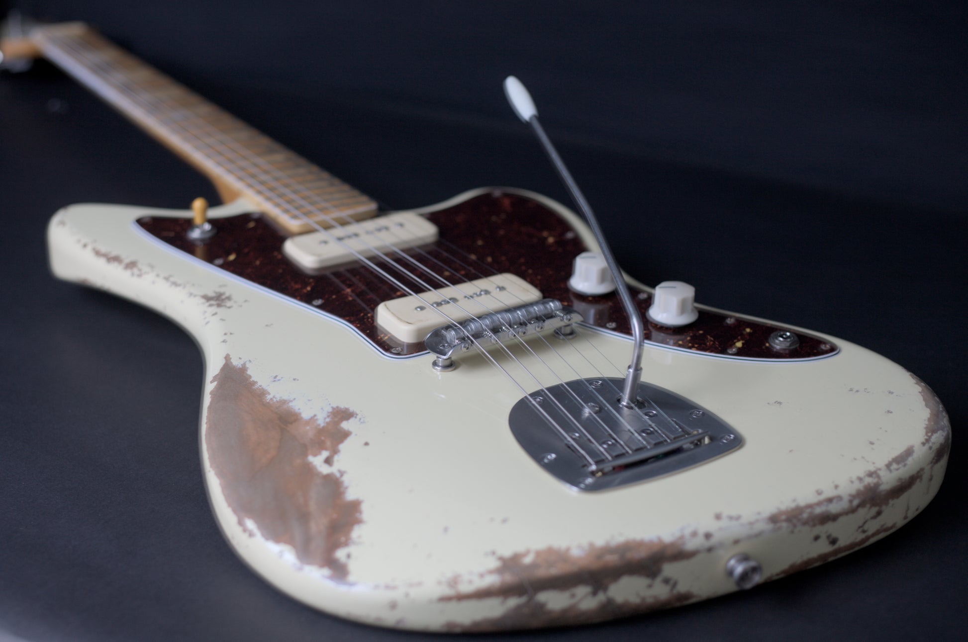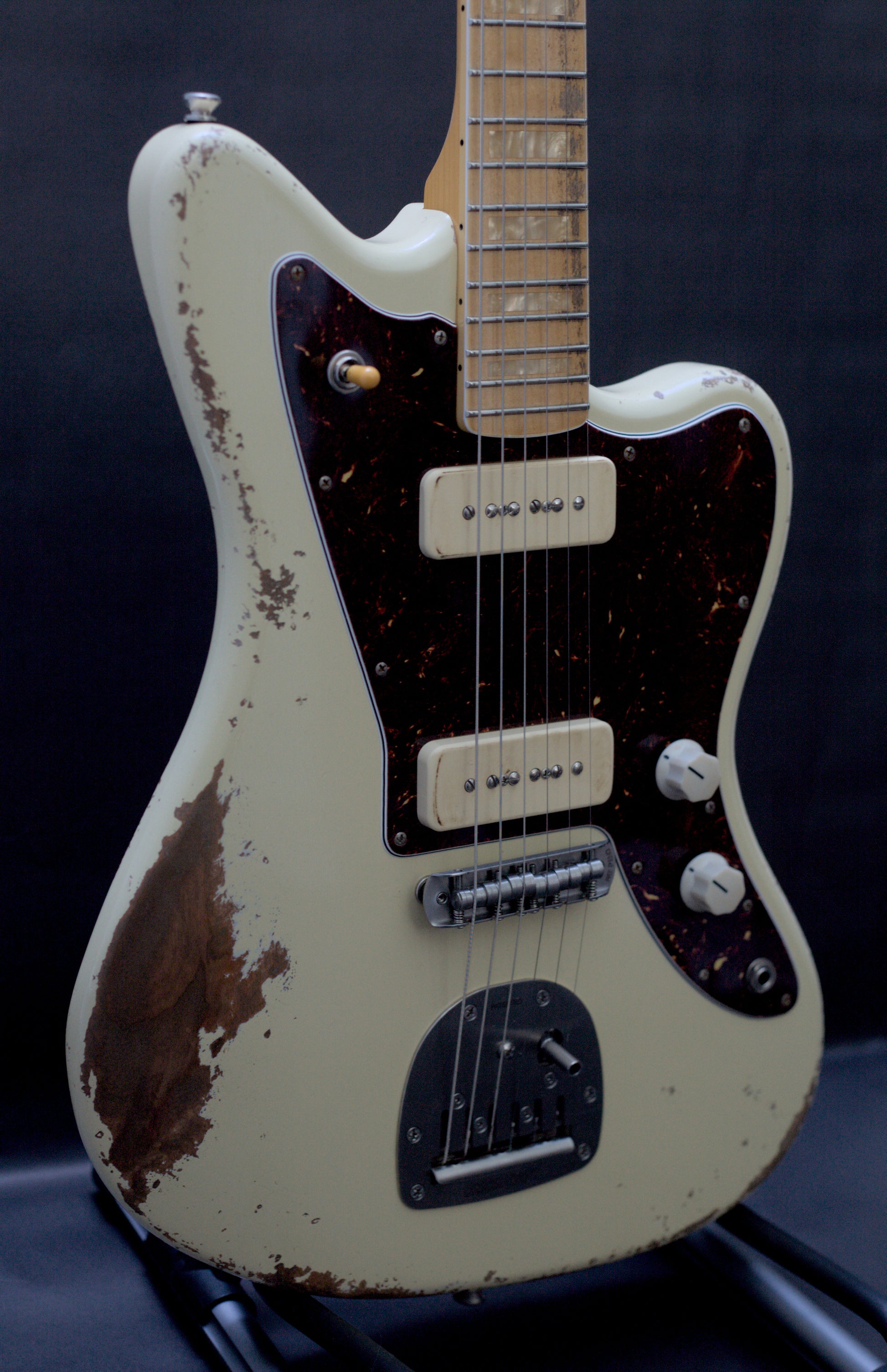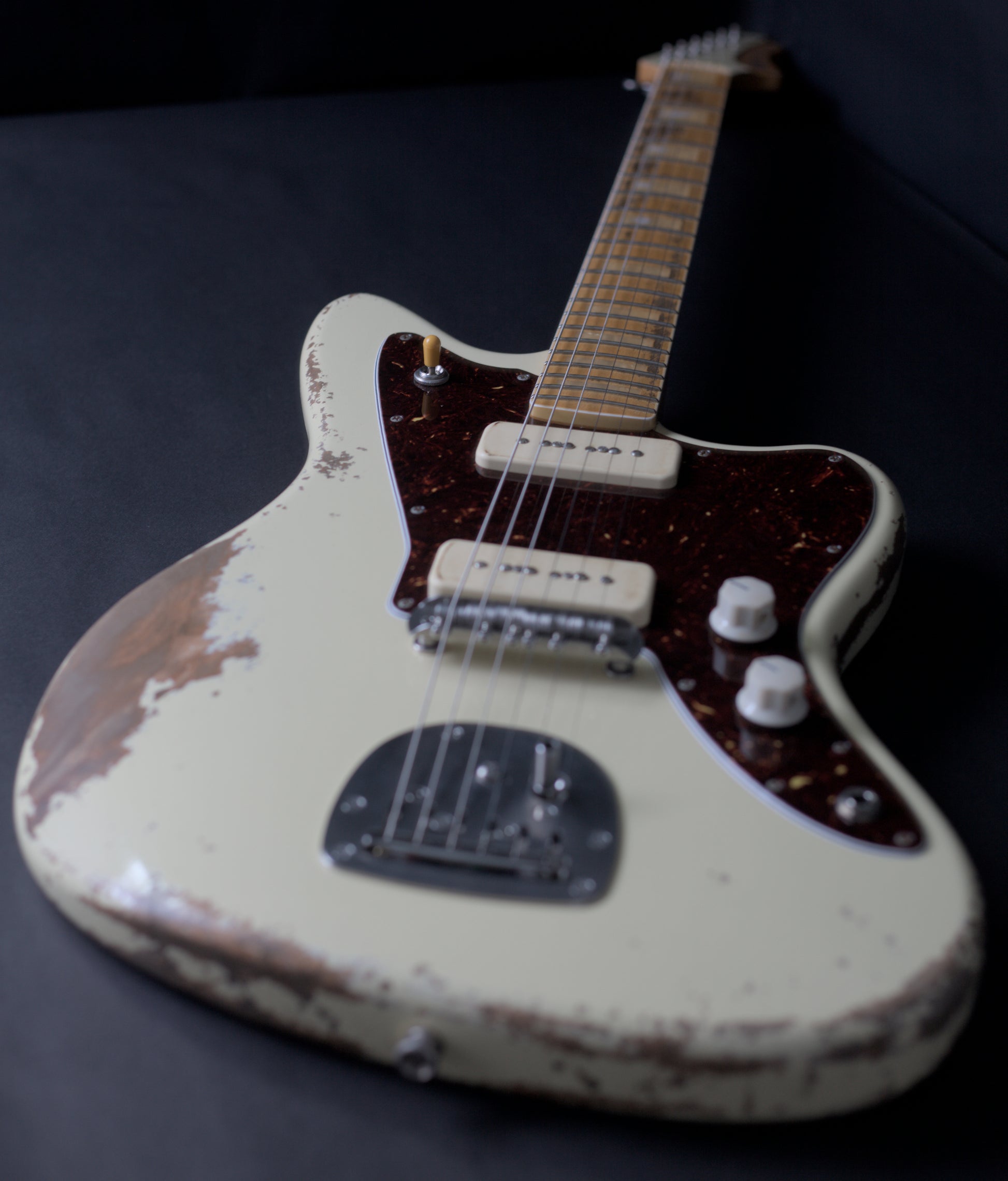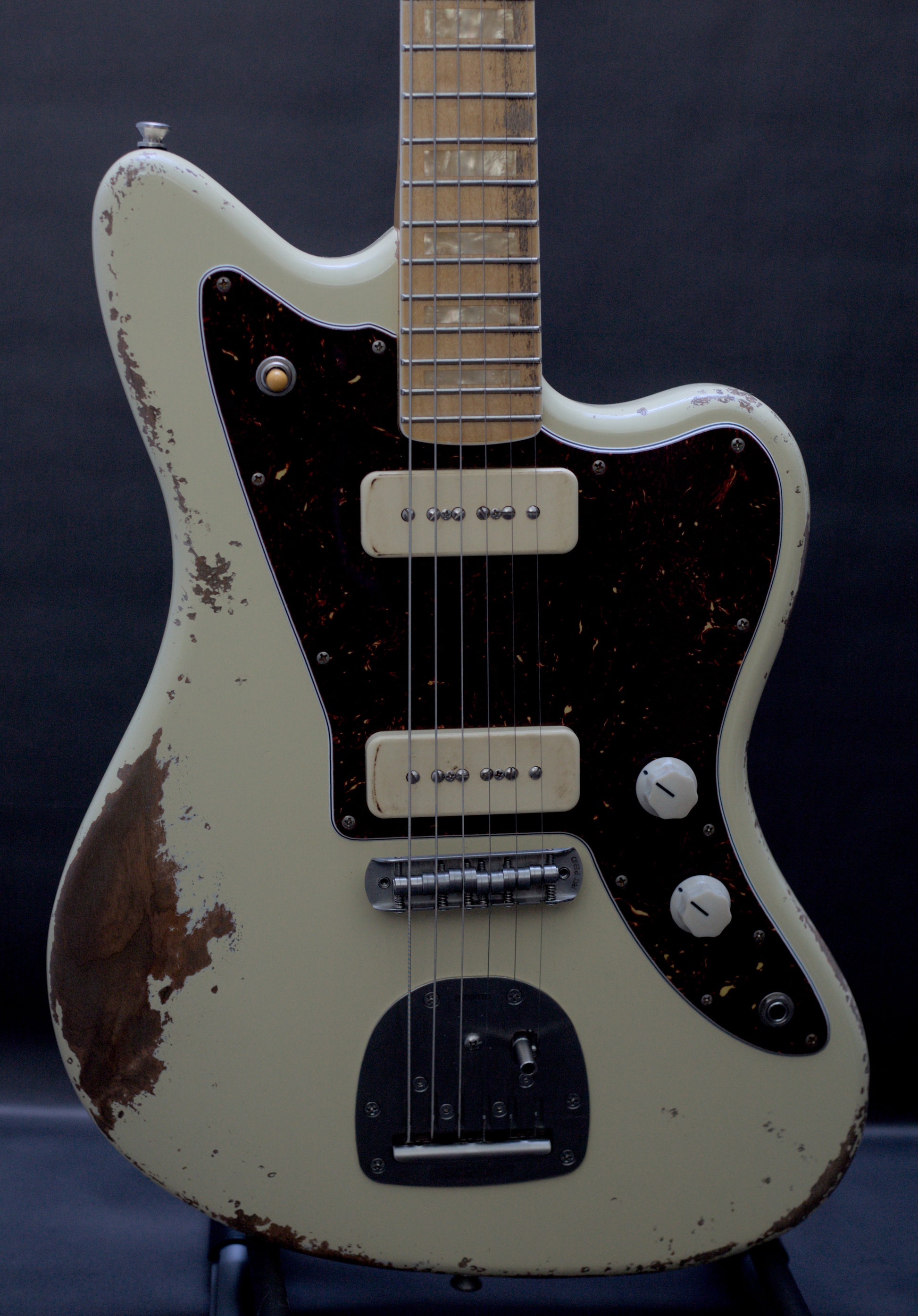 This incredible Alt De Facto JM6 has an Alder body, 25.5" scale Maple neck and Rosewood Fingerboard. It is fitted with a Descendent bridge and vibrato, and a pair of Bare Knuckle Blue Note P90 Pickups.