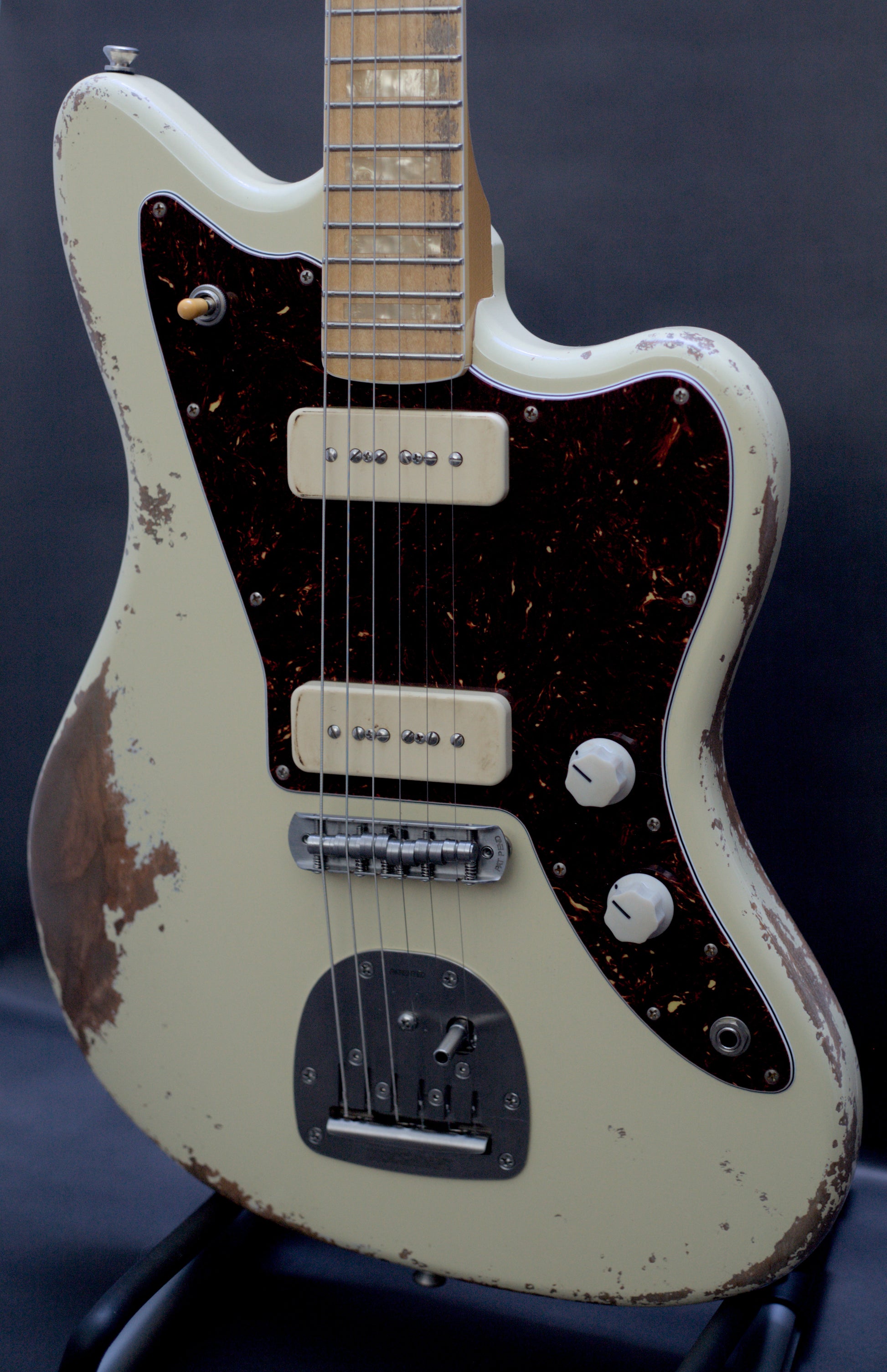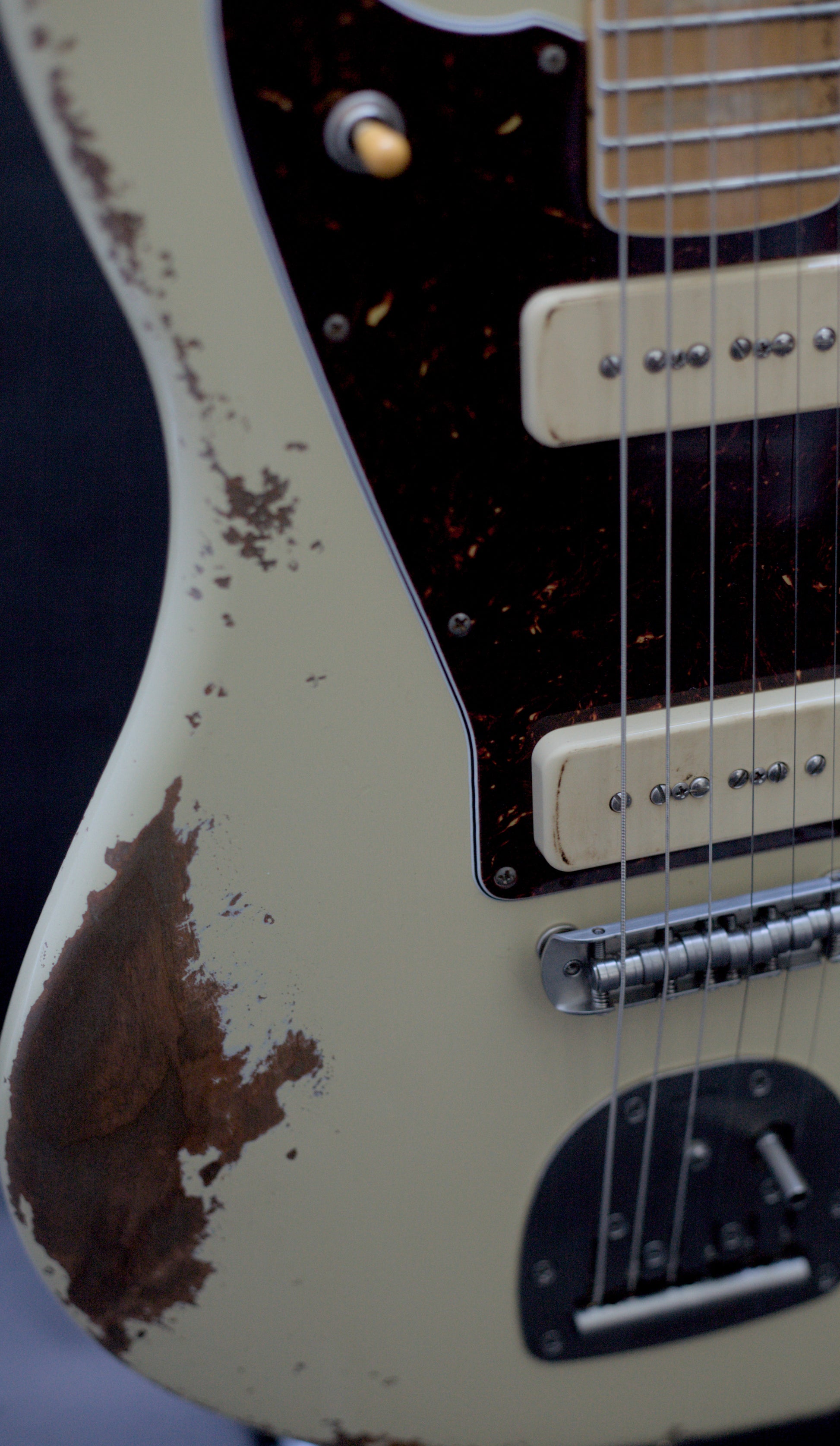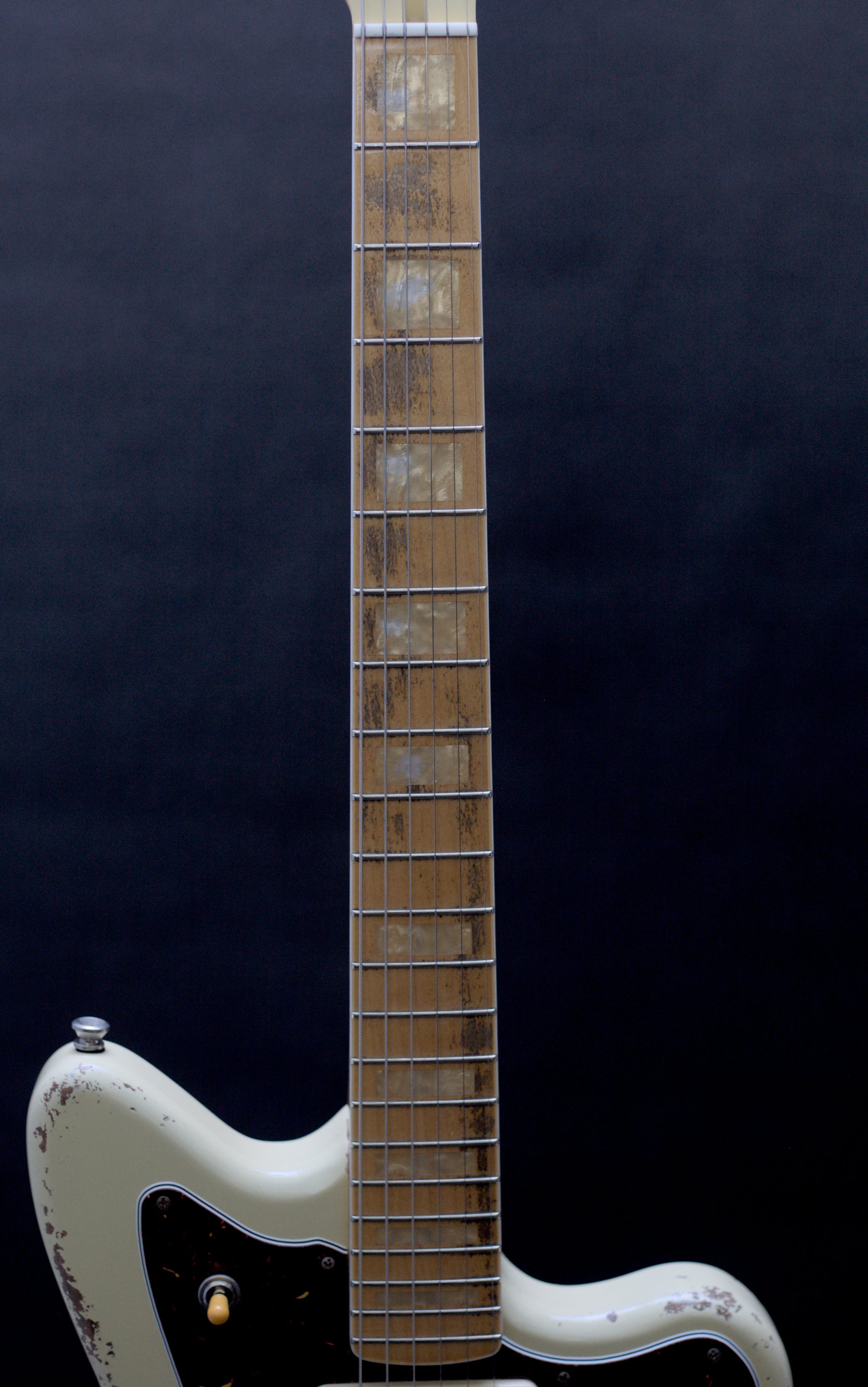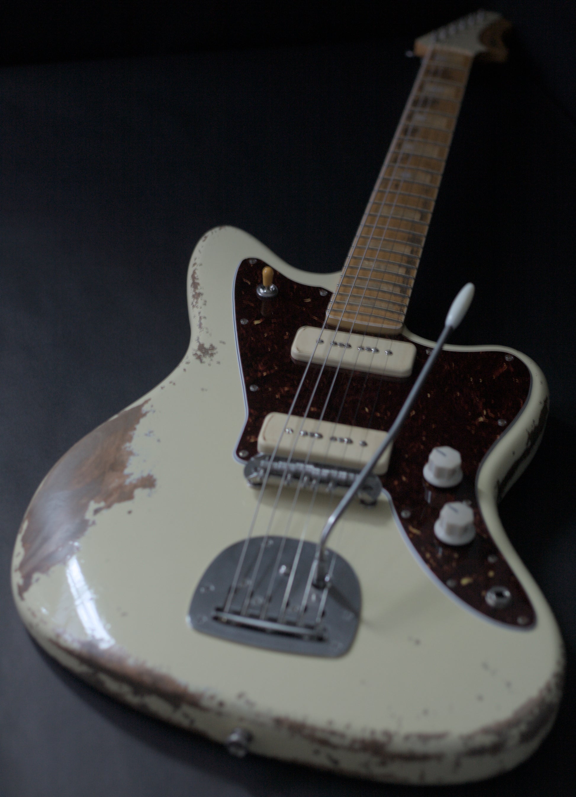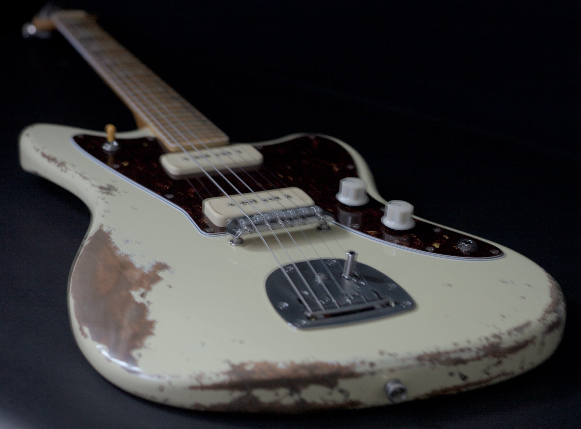 This incredible Alt De Facto JM6 has an Alder body, 25.5" scale Maple neck and Rosewood Fingerboard. It is fitted with a Descendent bridge and vibrato, and a pair of Bare Knuckle Blue Note P90 Pickups.
