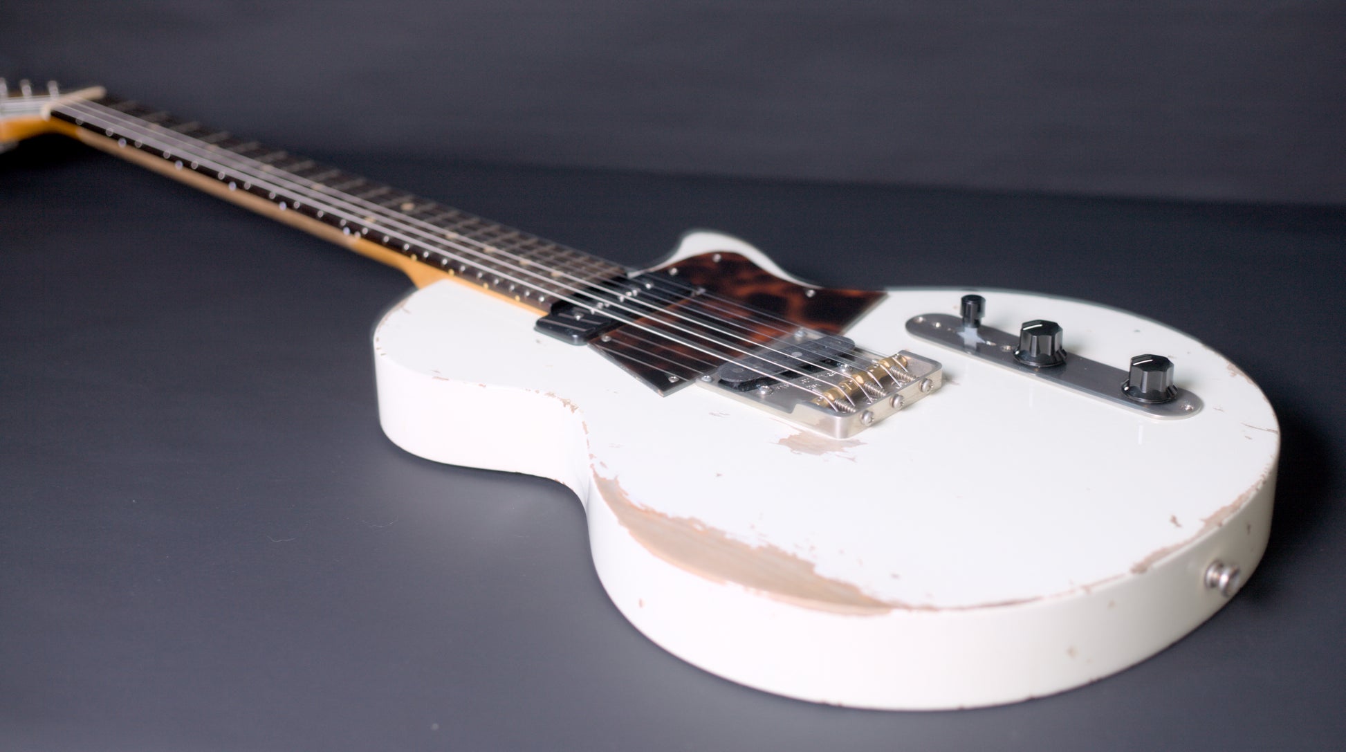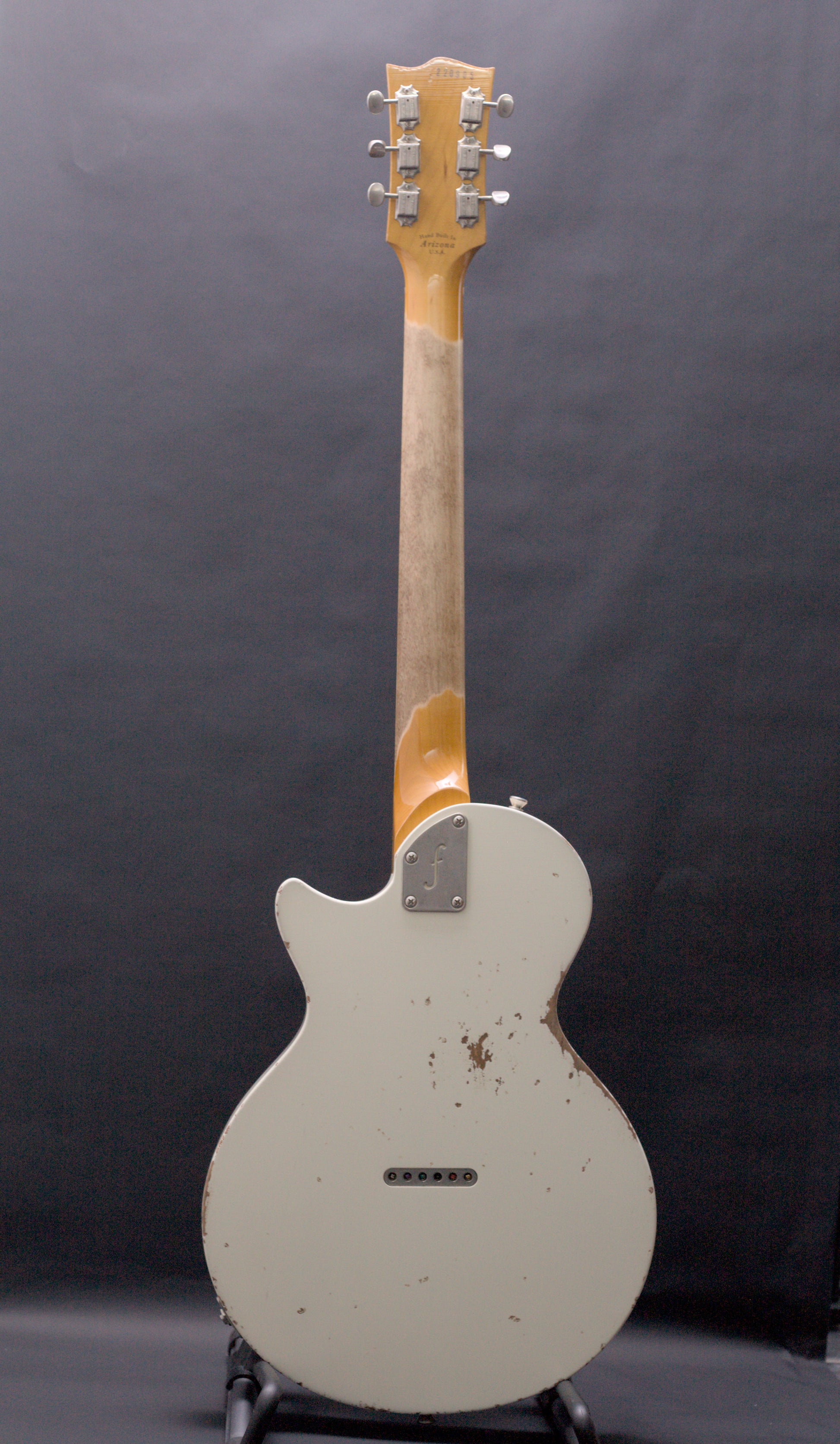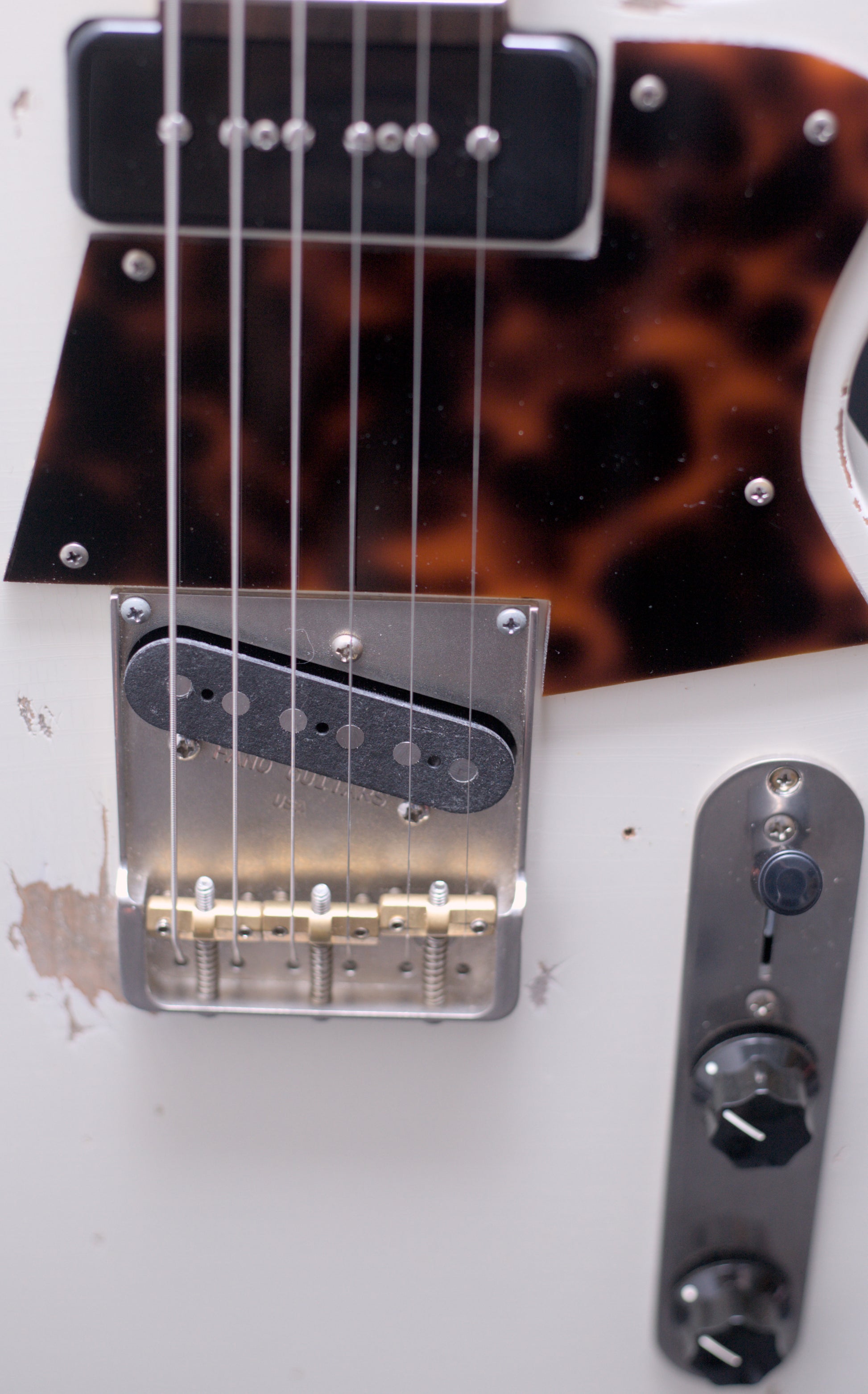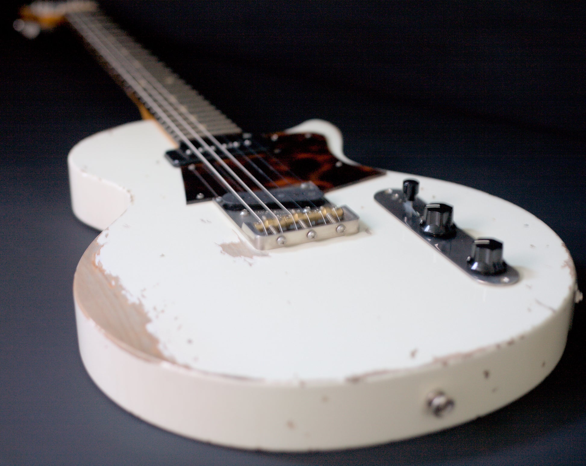 The Fano SP6 combines elements of a Les Paul Special and a Telecaster into one cunning and effective instrument. It features a full Gibson-inspired neck with 24.75” scale length, and a custom T-style bridge loaded with a slightly overwound Tele pickup to deliver plenty of snap and grunt. The string-thru bridge utilizes a solid block in the back of the body rather than individual string ferrules, giving a bit more punch and sustain than your standard fare T-style build.
