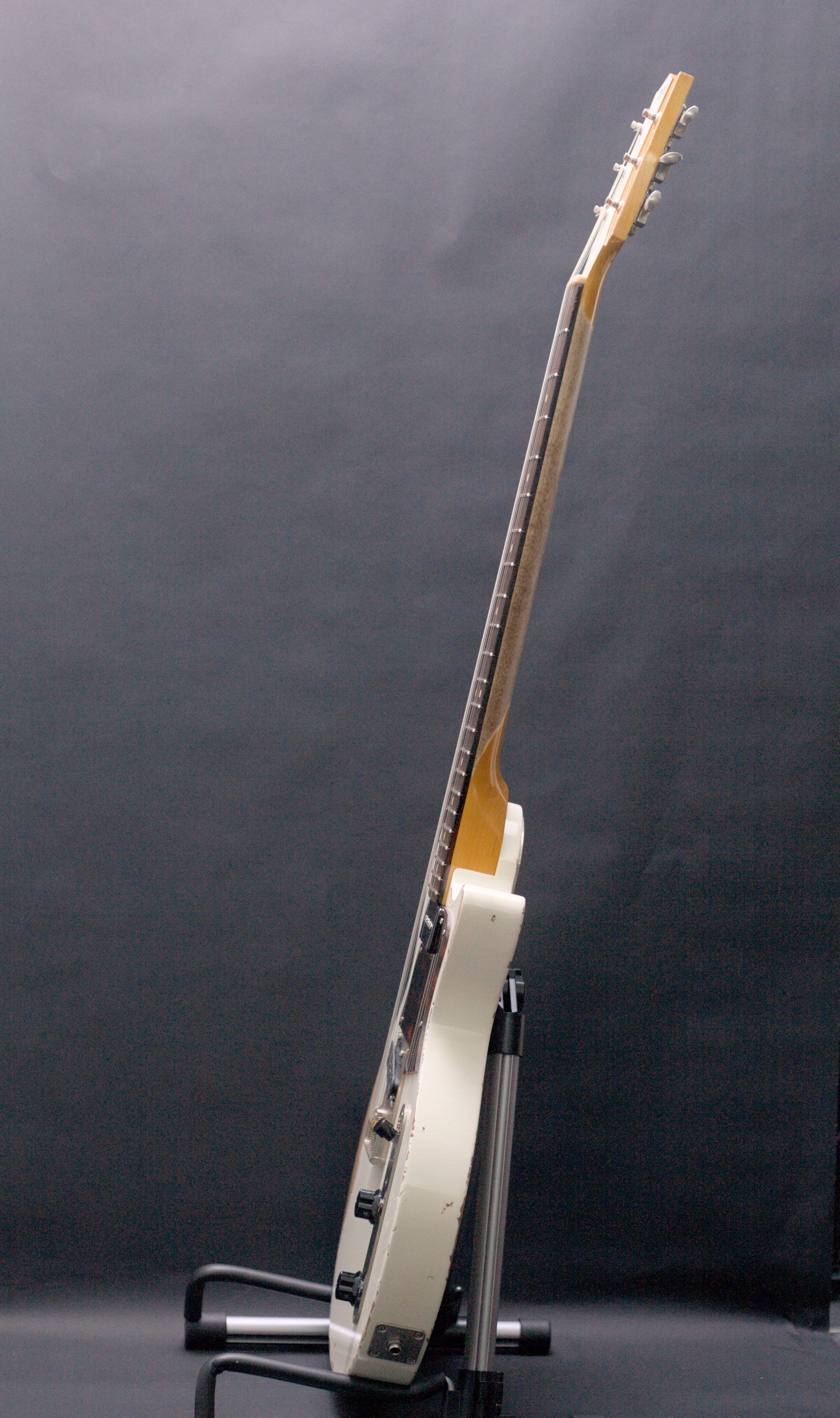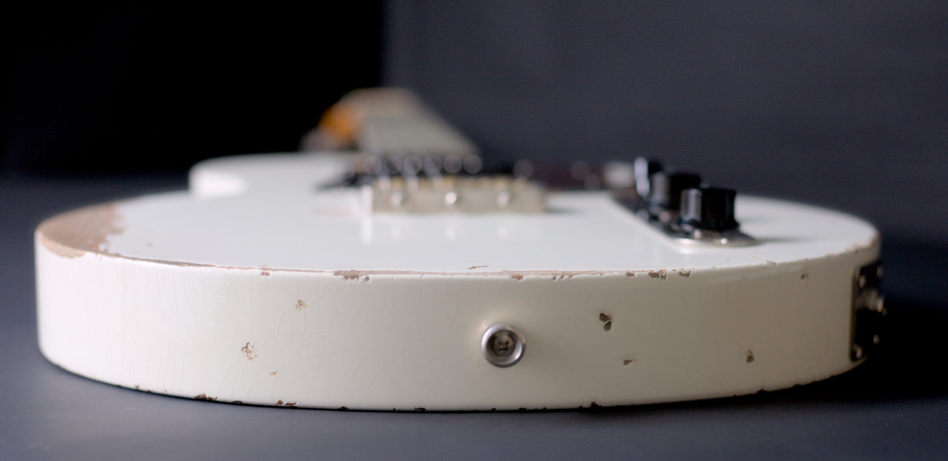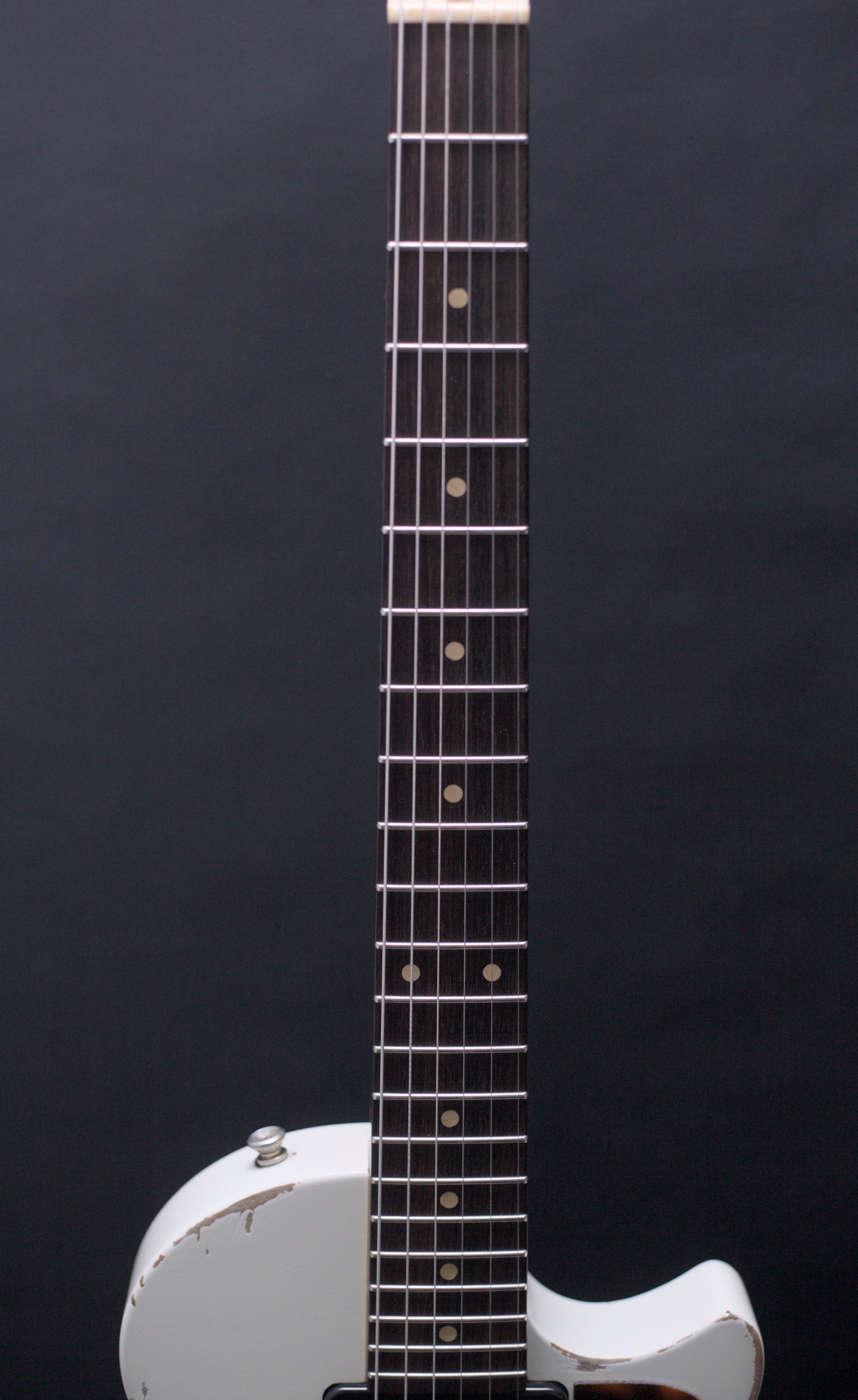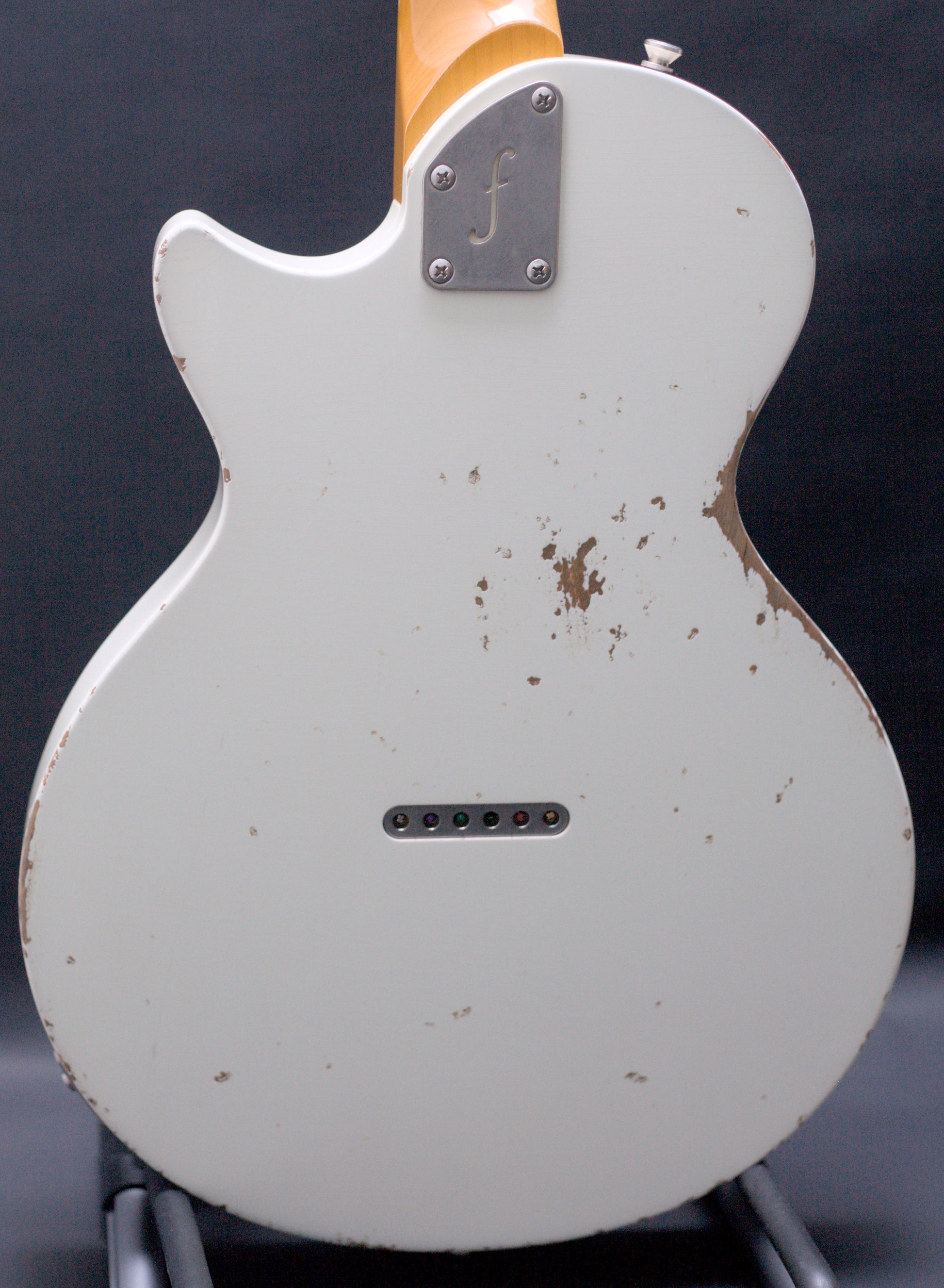 The Fano SP6 combines elements of a Les Paul Special and a Telecaster into one cunning and effective instrument. It features a full Gibson-inspired neck with 24.75” scale length, and a custom T-style bridge loaded with a slightly overwound Tele pickup to deliver plenty of snap and grunt. The string-thru bridge utilizes a solid block in the back of the body rather than individual string ferrules, giving a bit more punch and sustain than your standard fare T-style build.
