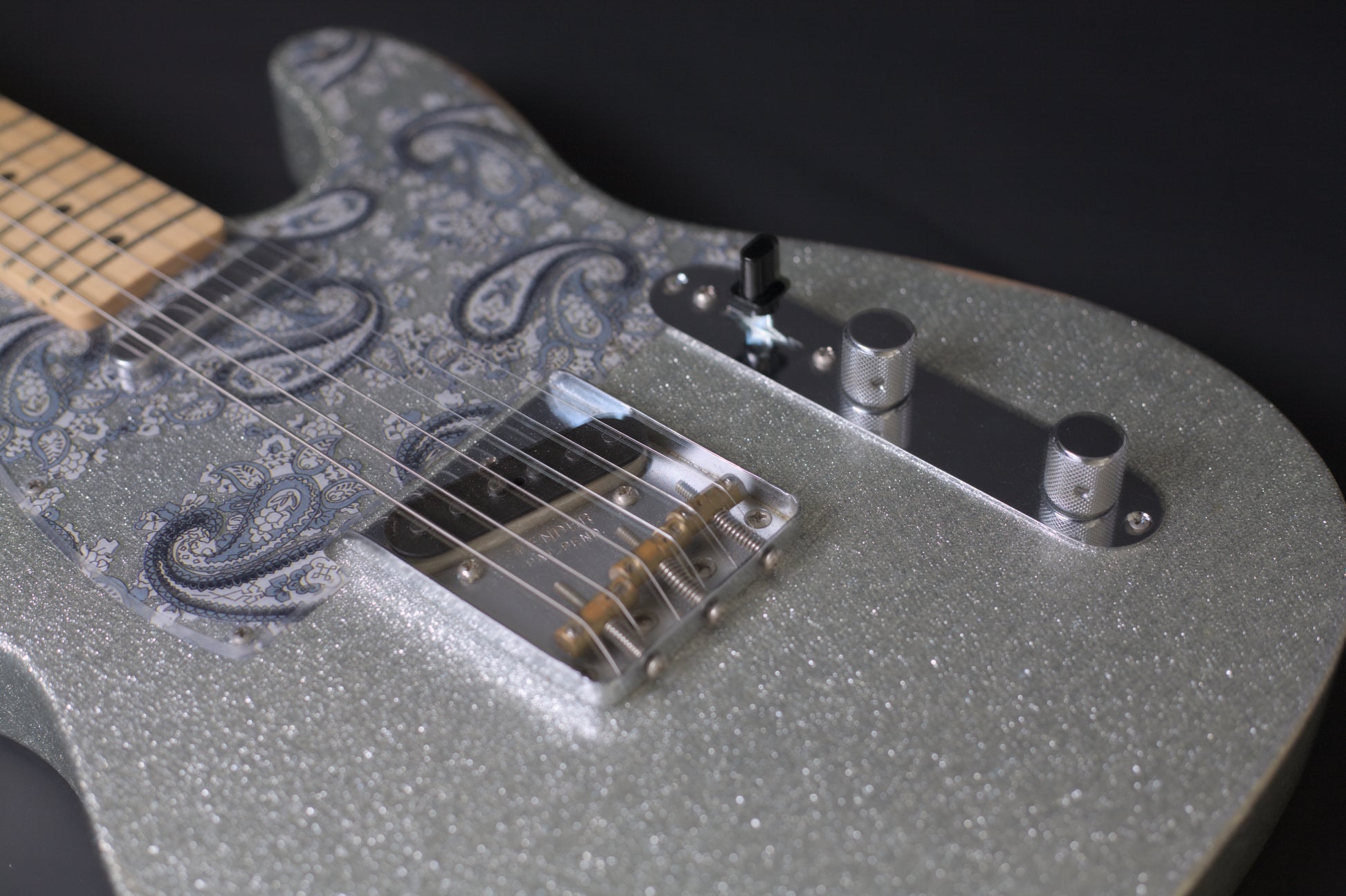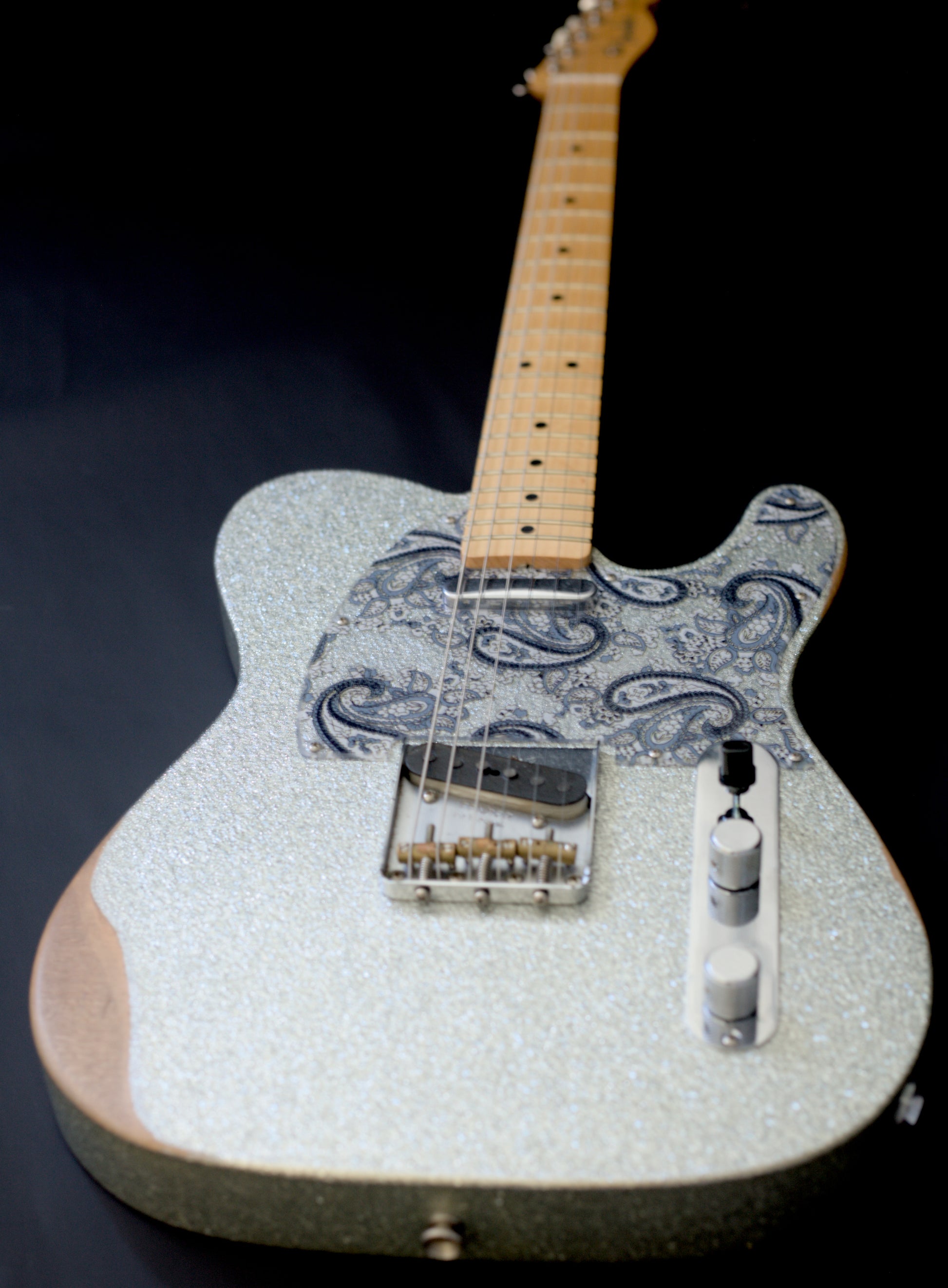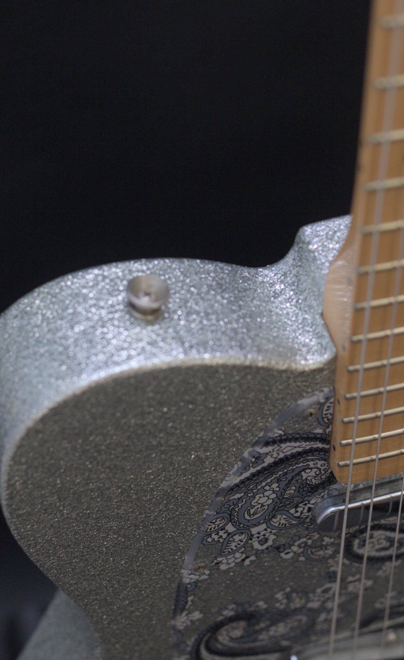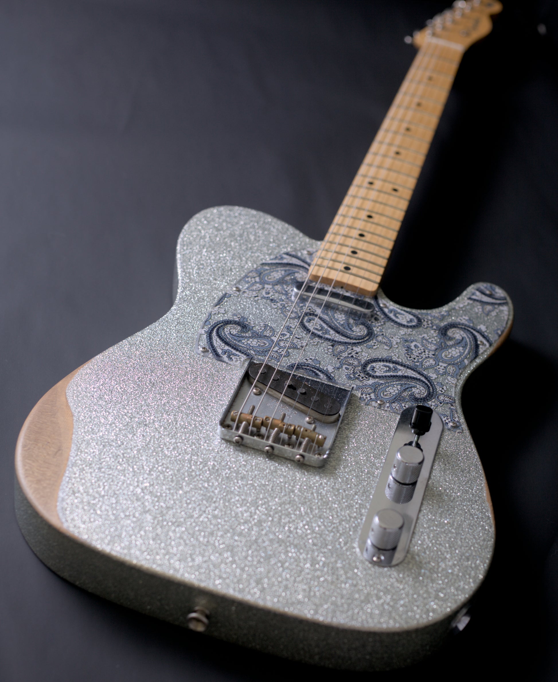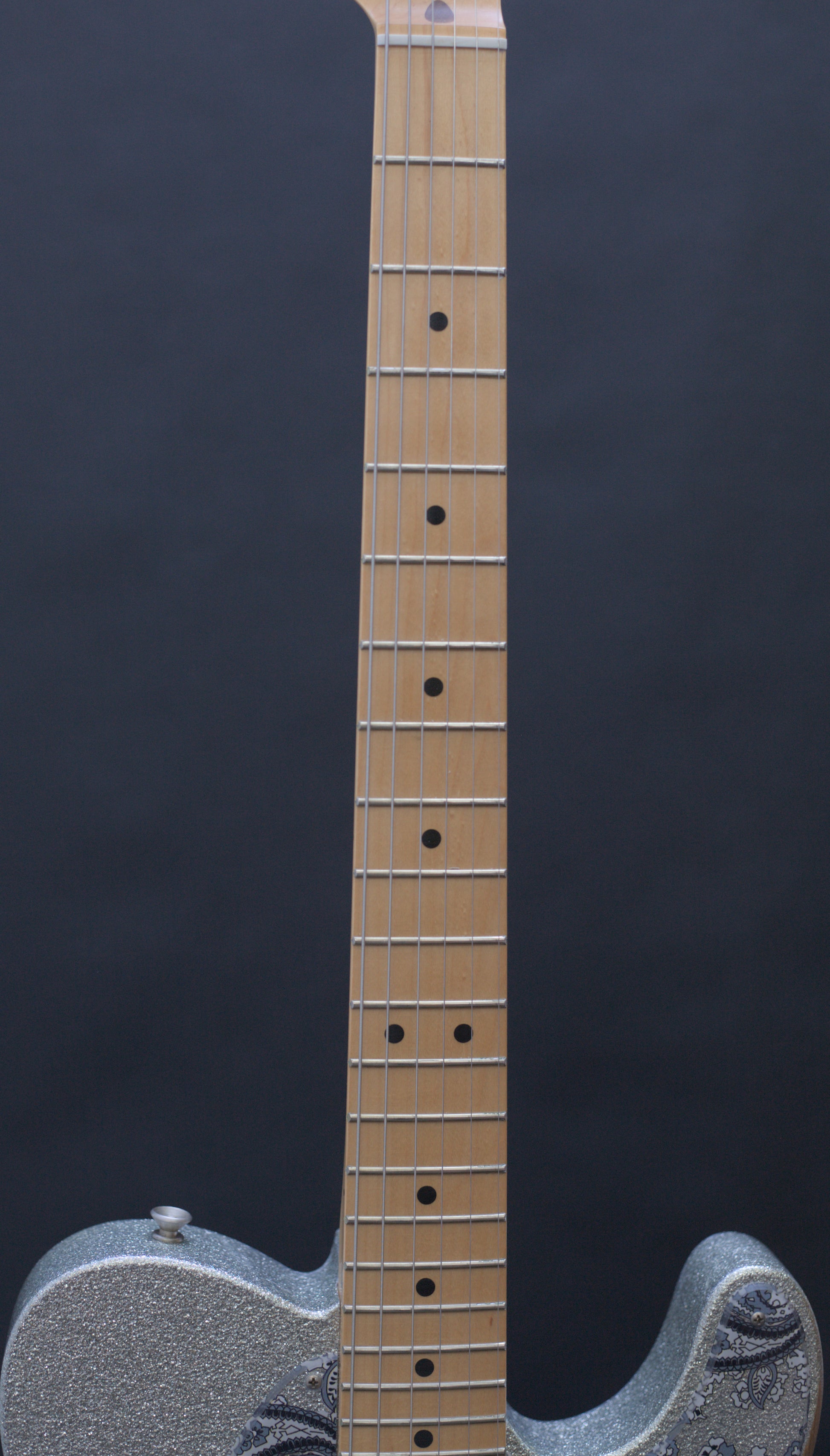 This Tele wears a sparkle Road Worn lacquer finish and aged hardware, inspired by many years on the touring trail. Elegant signature touches include a custom clear pickguard with black and silver paisleys and a cowboy hat insignia on the headstock. Simply put, this easy-playing music machine is a must for Tele lovers and belongs center-stage in any country collection.