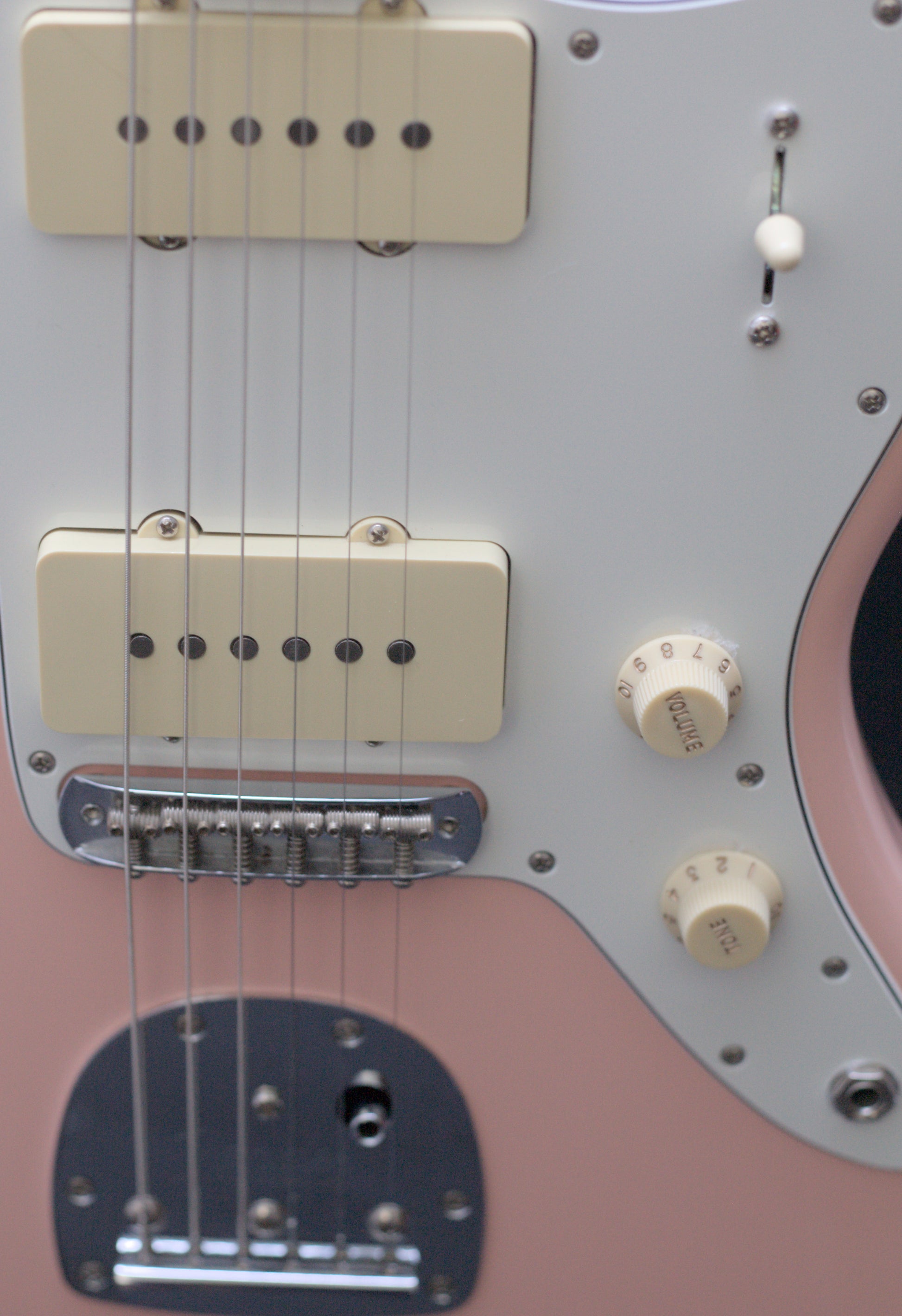 It features a C shaped neck which uses Fender’s standard 9.5” ‘in-between’ fingerboard radius and 22 Medium Jumbo frets for a feel that’s contemporary without trying to be inappropriately cutting edge. The bridge, always a bugbear/labour of love for Jazzmaster owners, has been upgraded to an improved six-saddle model, along with the famous Jazzmaster tremolo tailpiece,