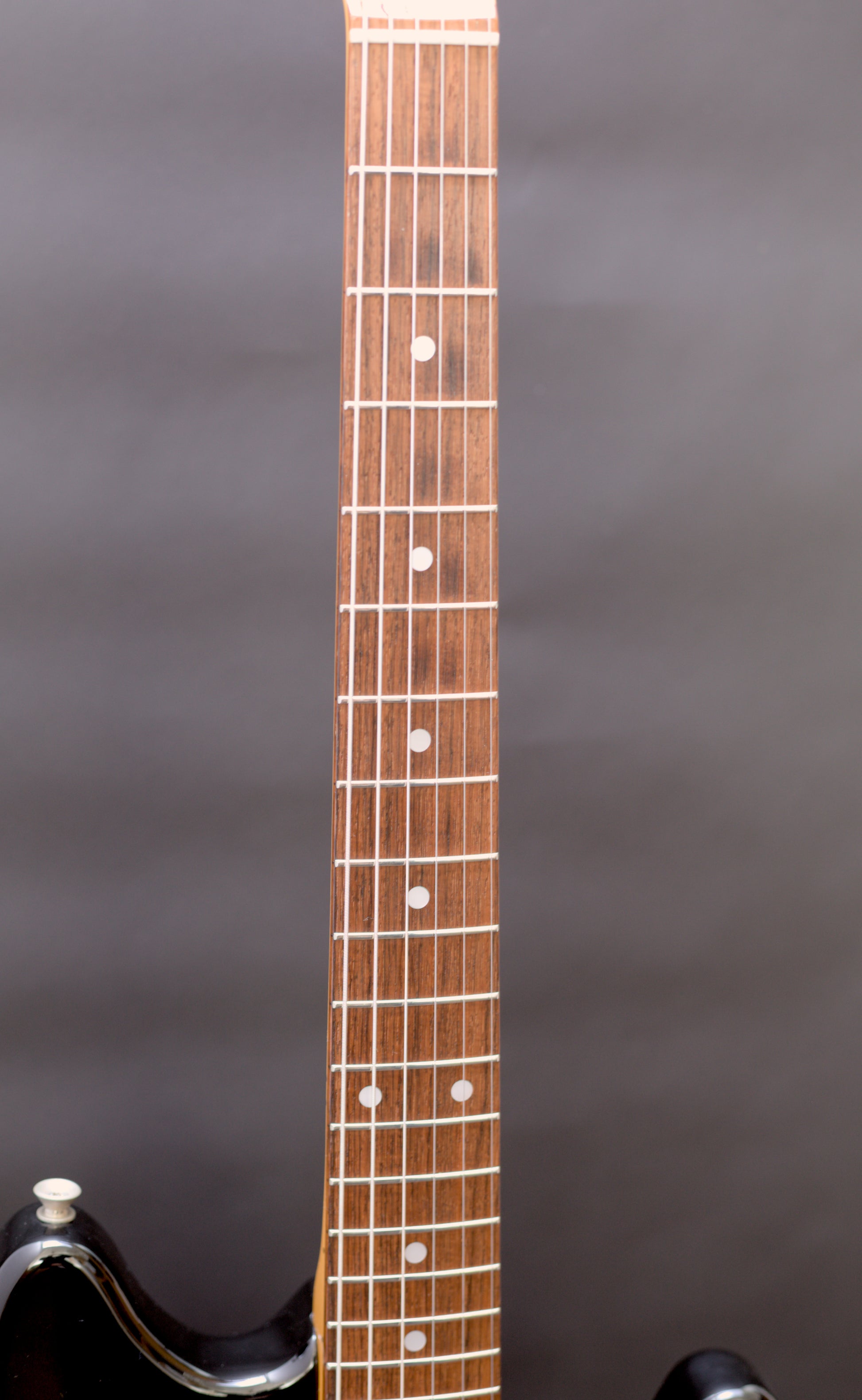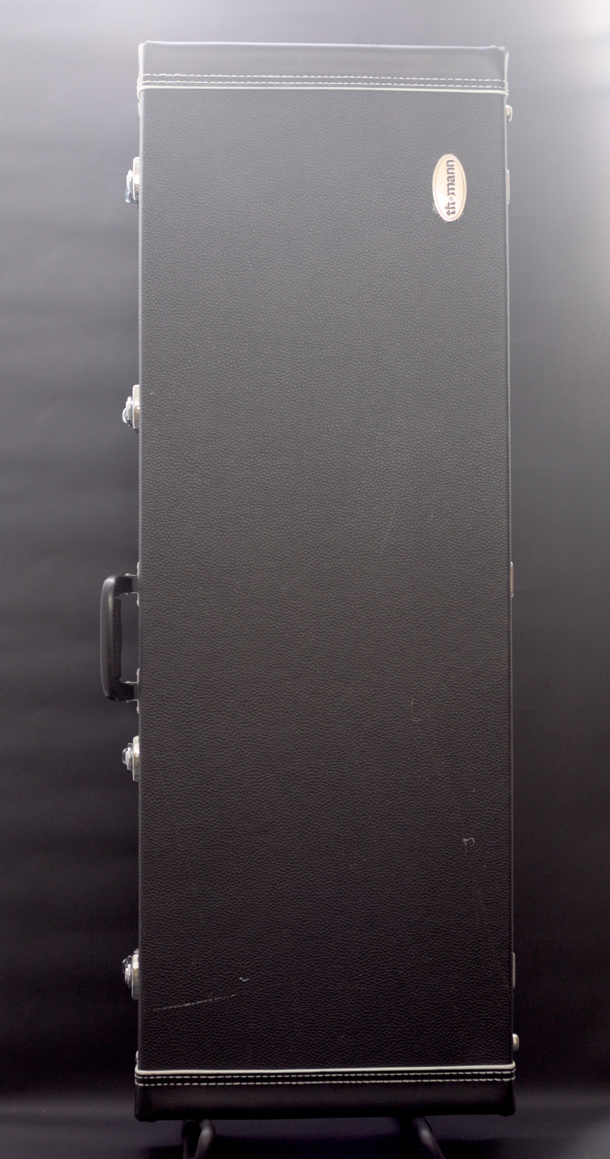 It is currently set up with Seymour Duncan Hotrail pickups and as a hardtail, but all the original parts are in the case, as is the tremolo arm.