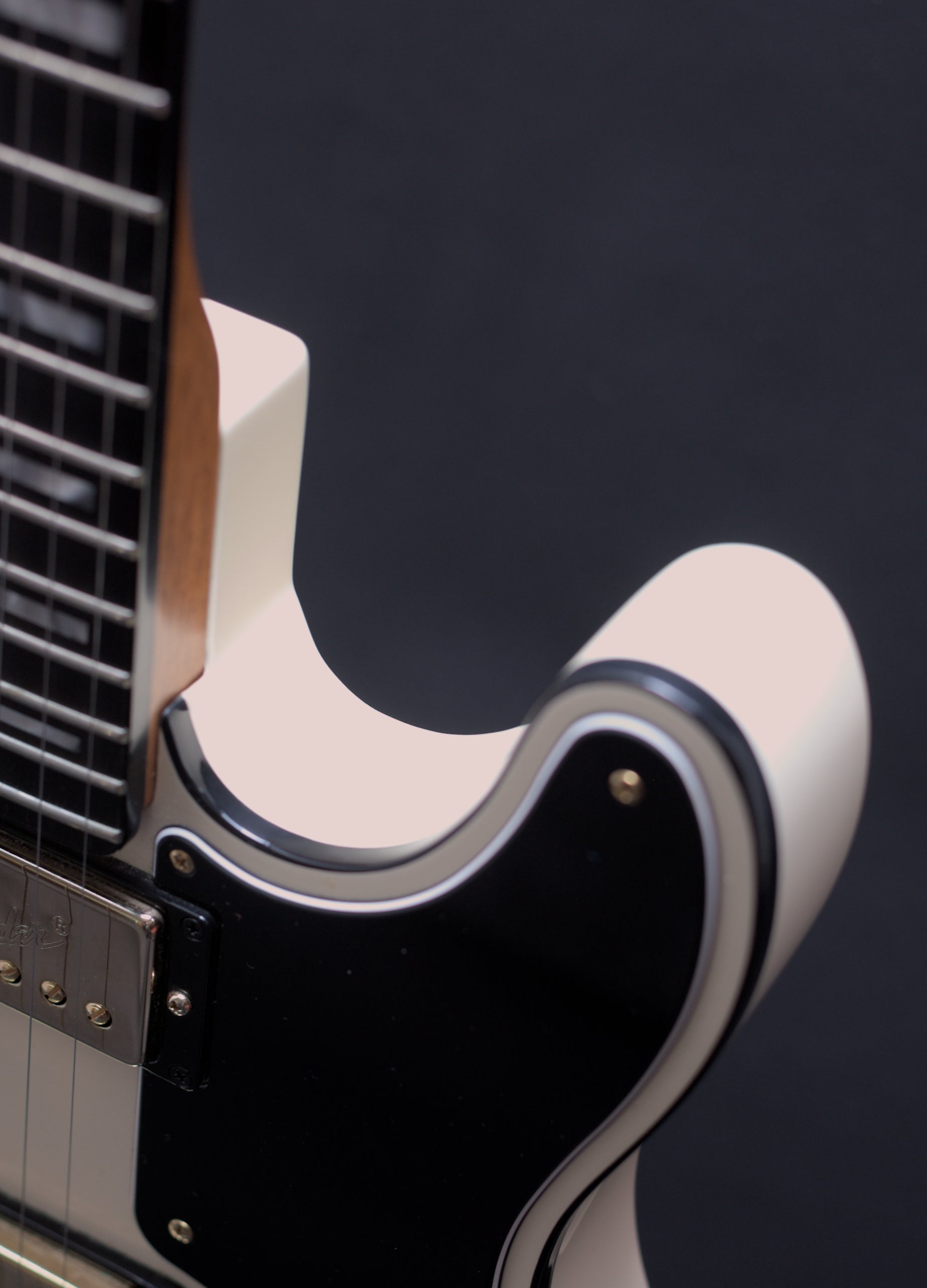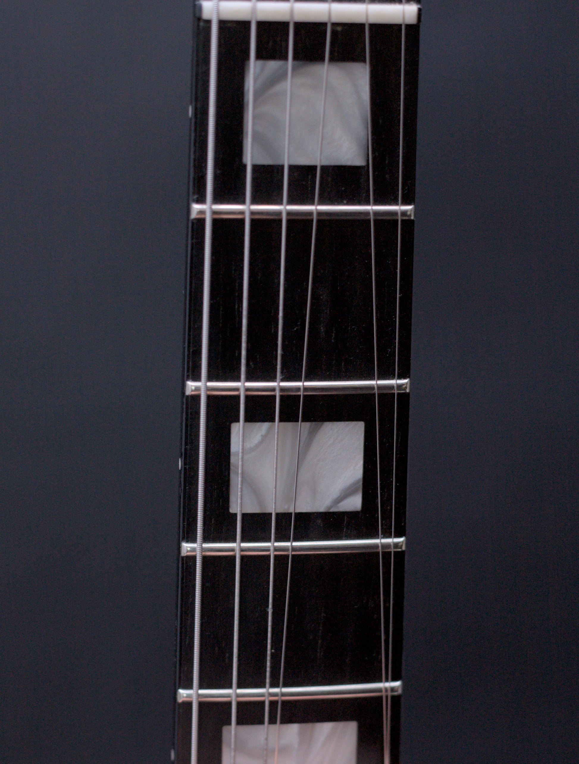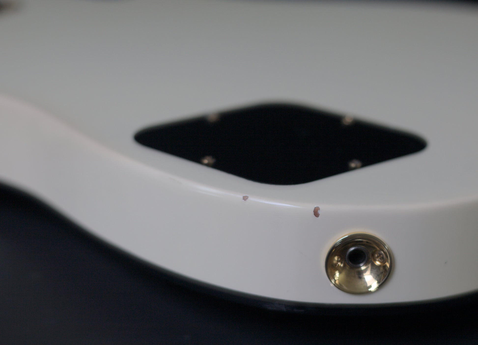 It is in very good condition throughout with no breaks, cracks or repairs. It has seen little use, and does not show much in the way of play wear at all. There are 2 dings to the reverse edge, near the input jack, and a light scratch and further less noticeable ding to the reverse of the body. It is otherwise in excellent condition. The gold hardware looks great with no real signs of aging. The frets show little sign of use.