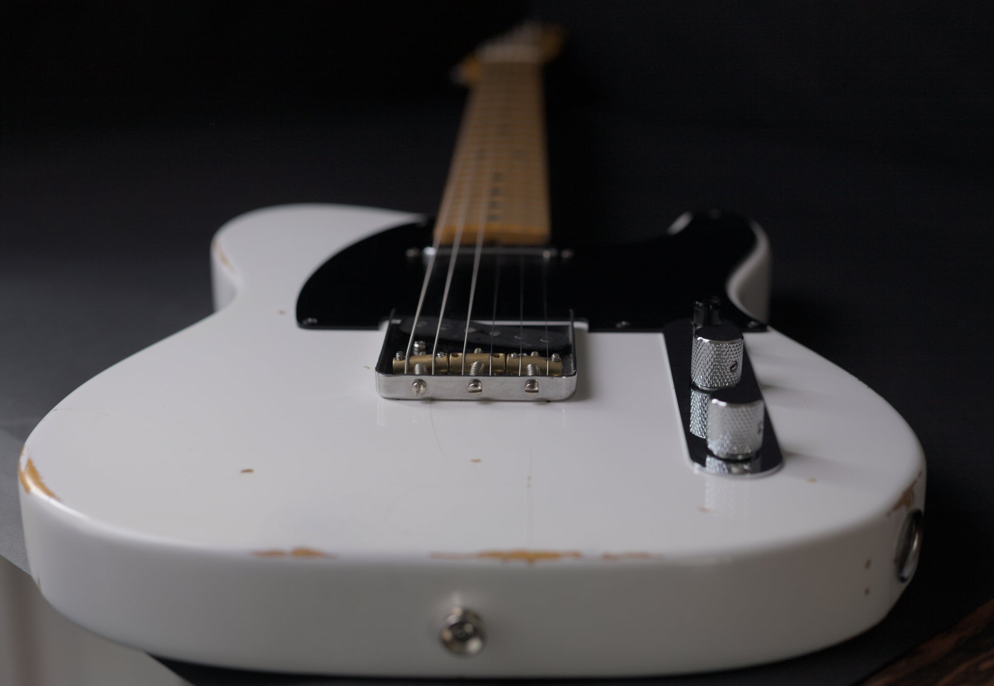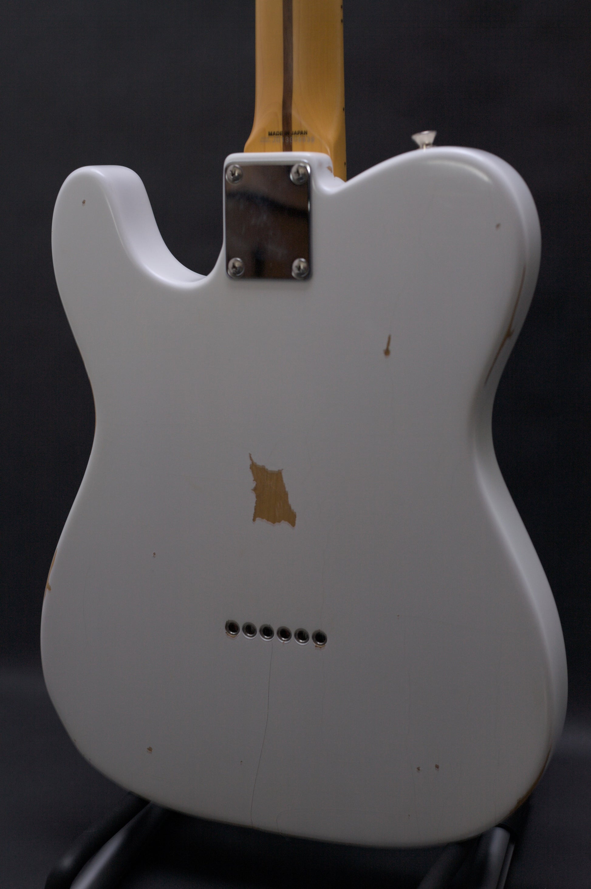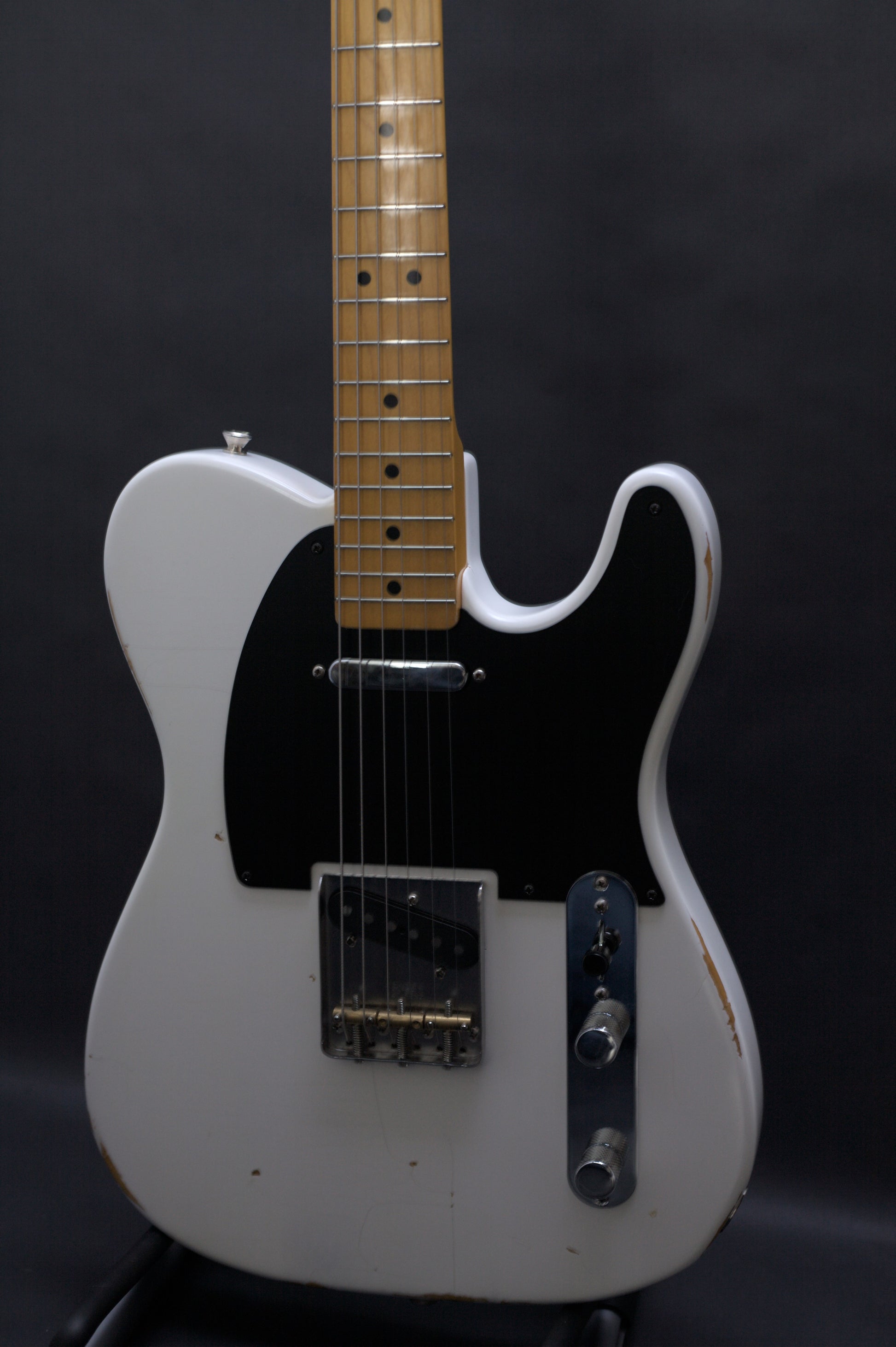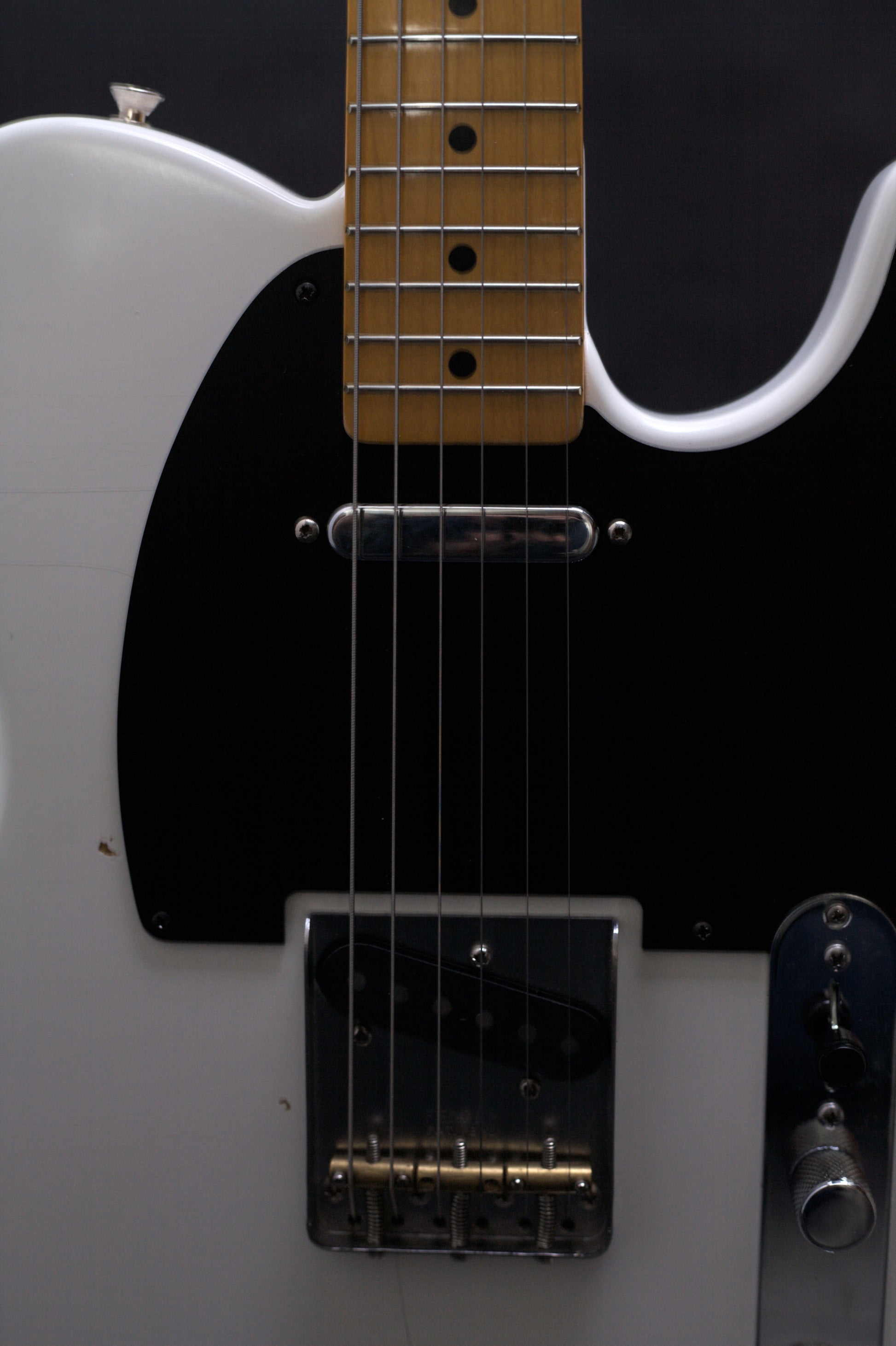 This super cool 2013 Japanese Telecaster has been refinished, reliced and modified. It started life with a natural finish. This has been replaced with a great looking satin white. The electrics have been modified, the pickguard swapped from white to black, the knobs replaced for something a little bit cooler and the bridge saddles upgraded.