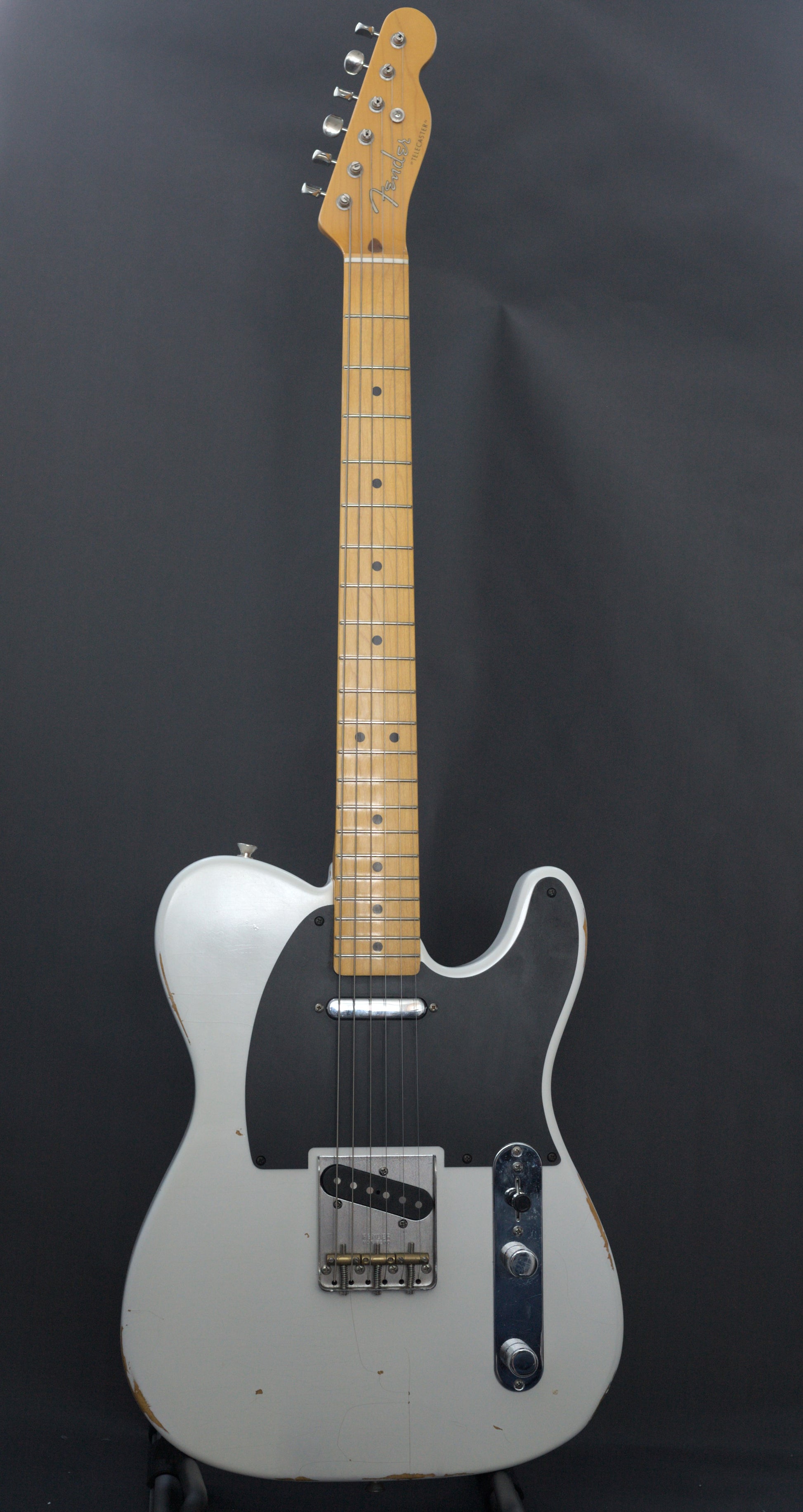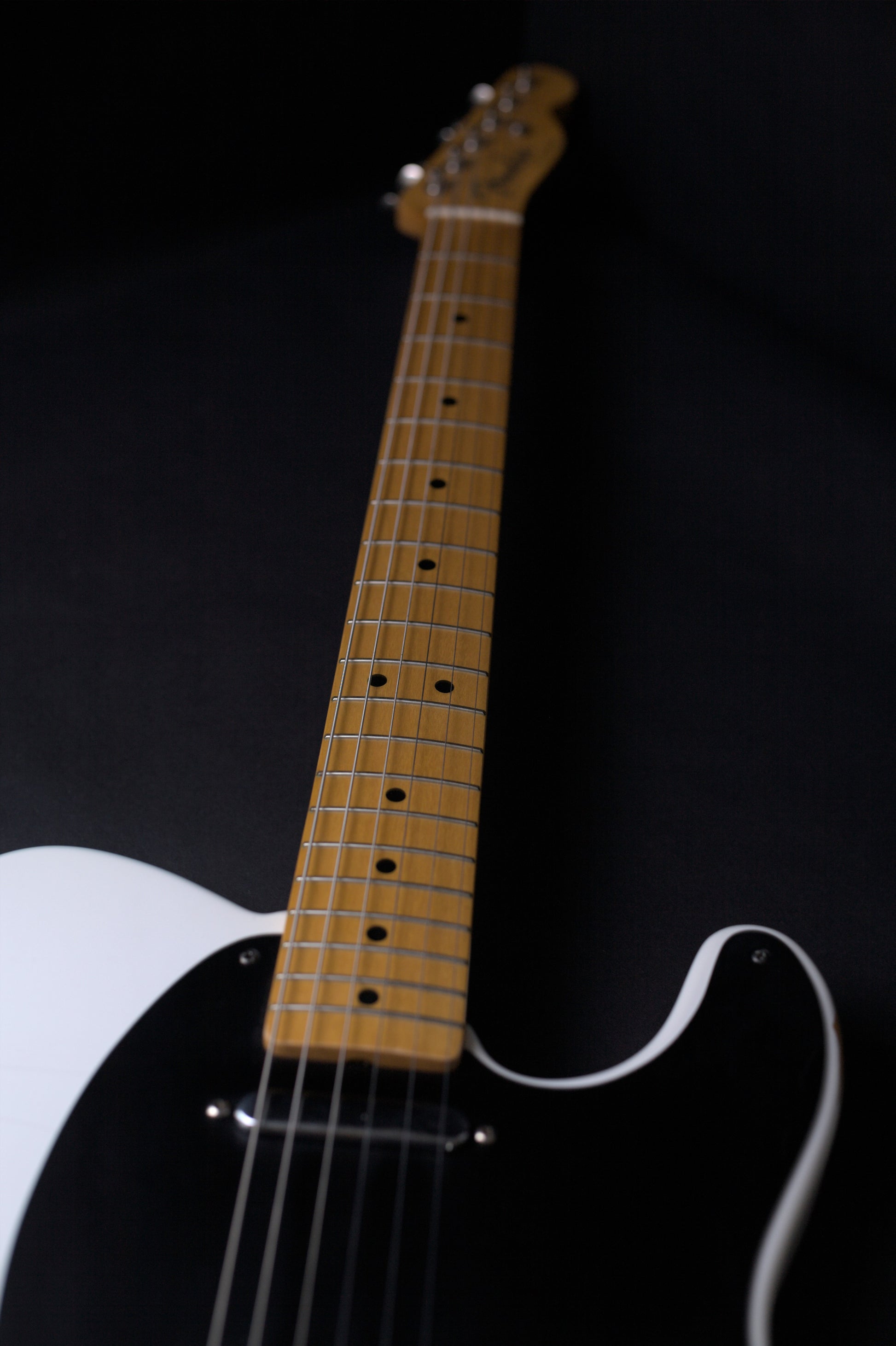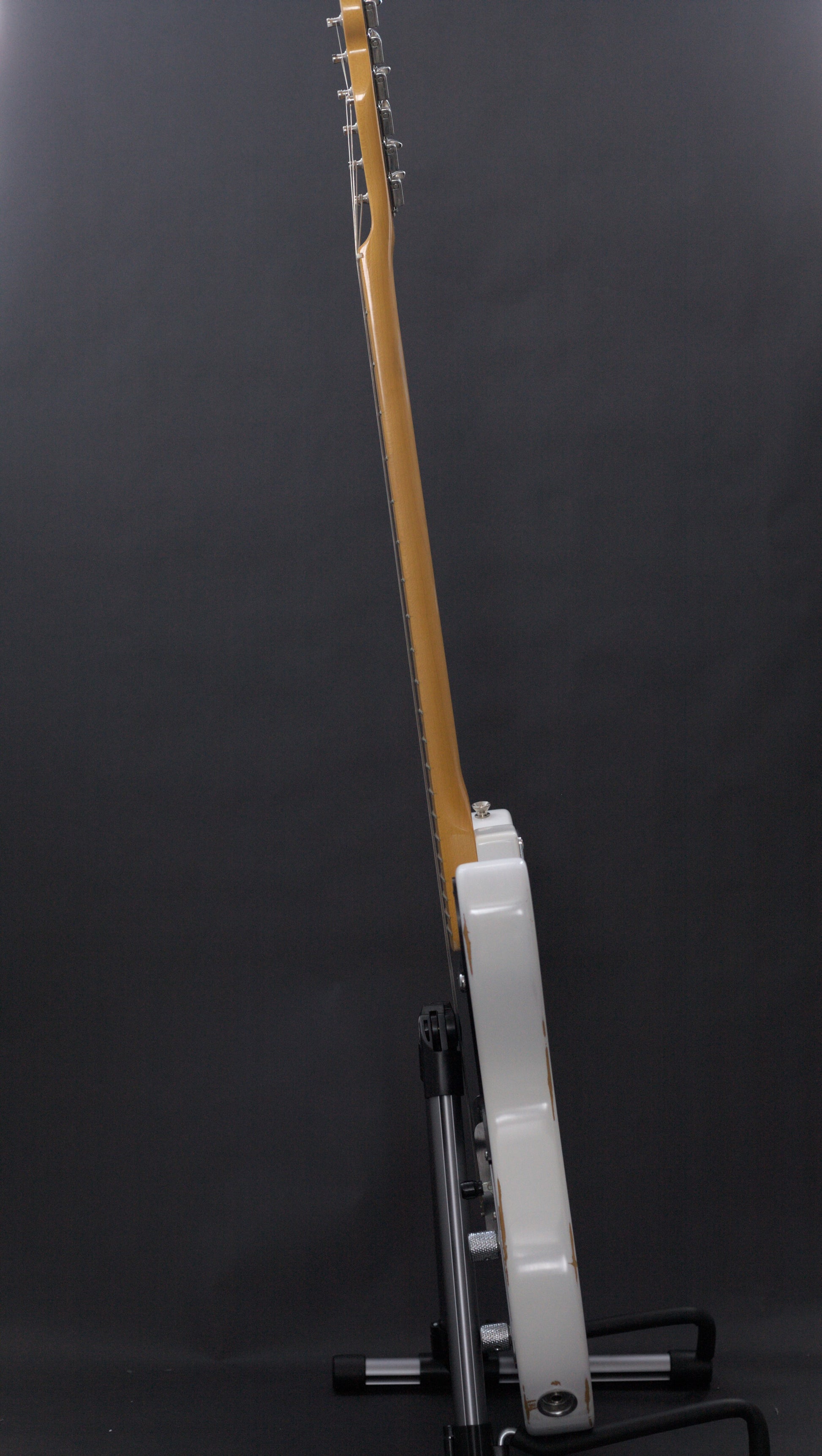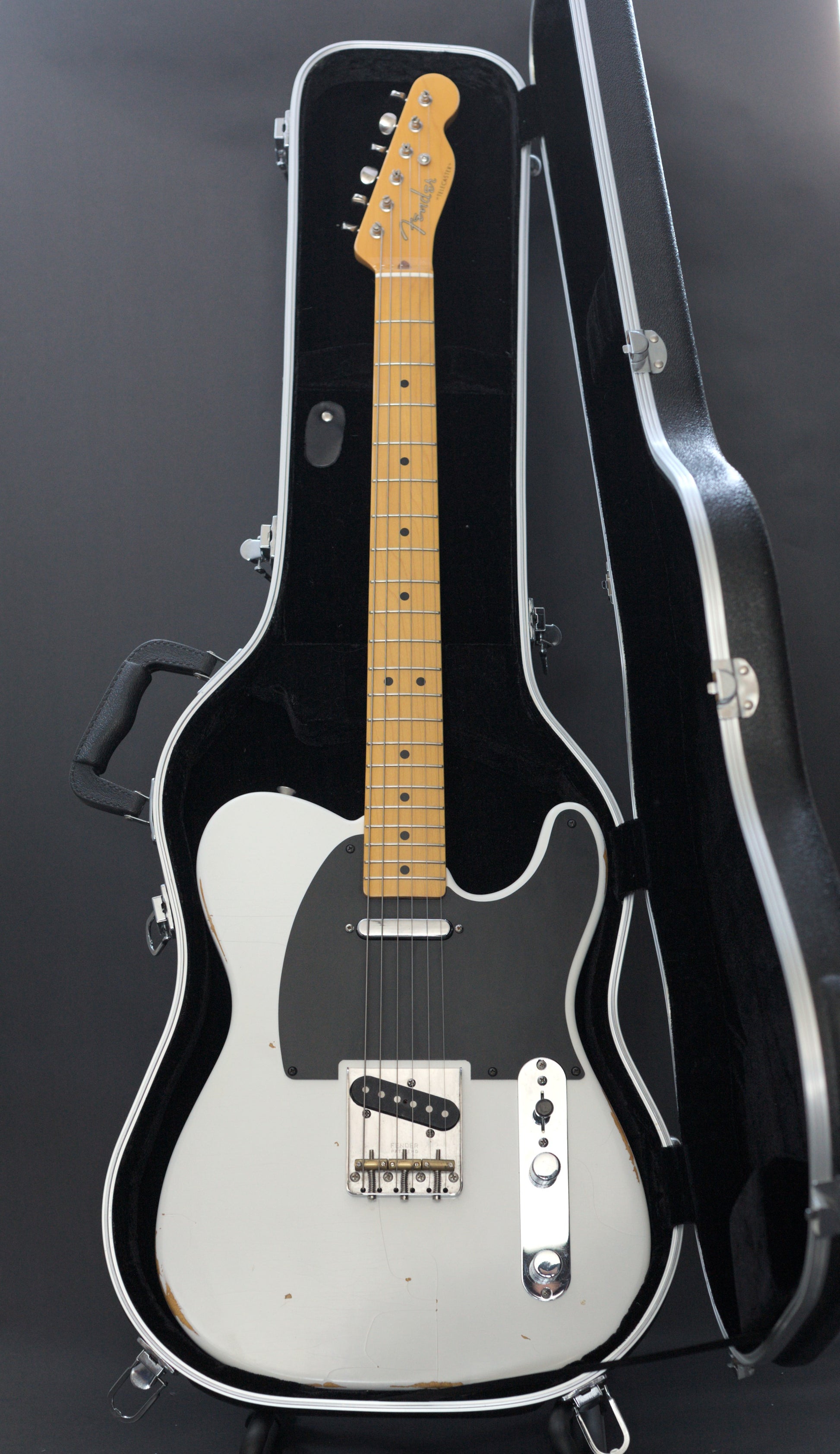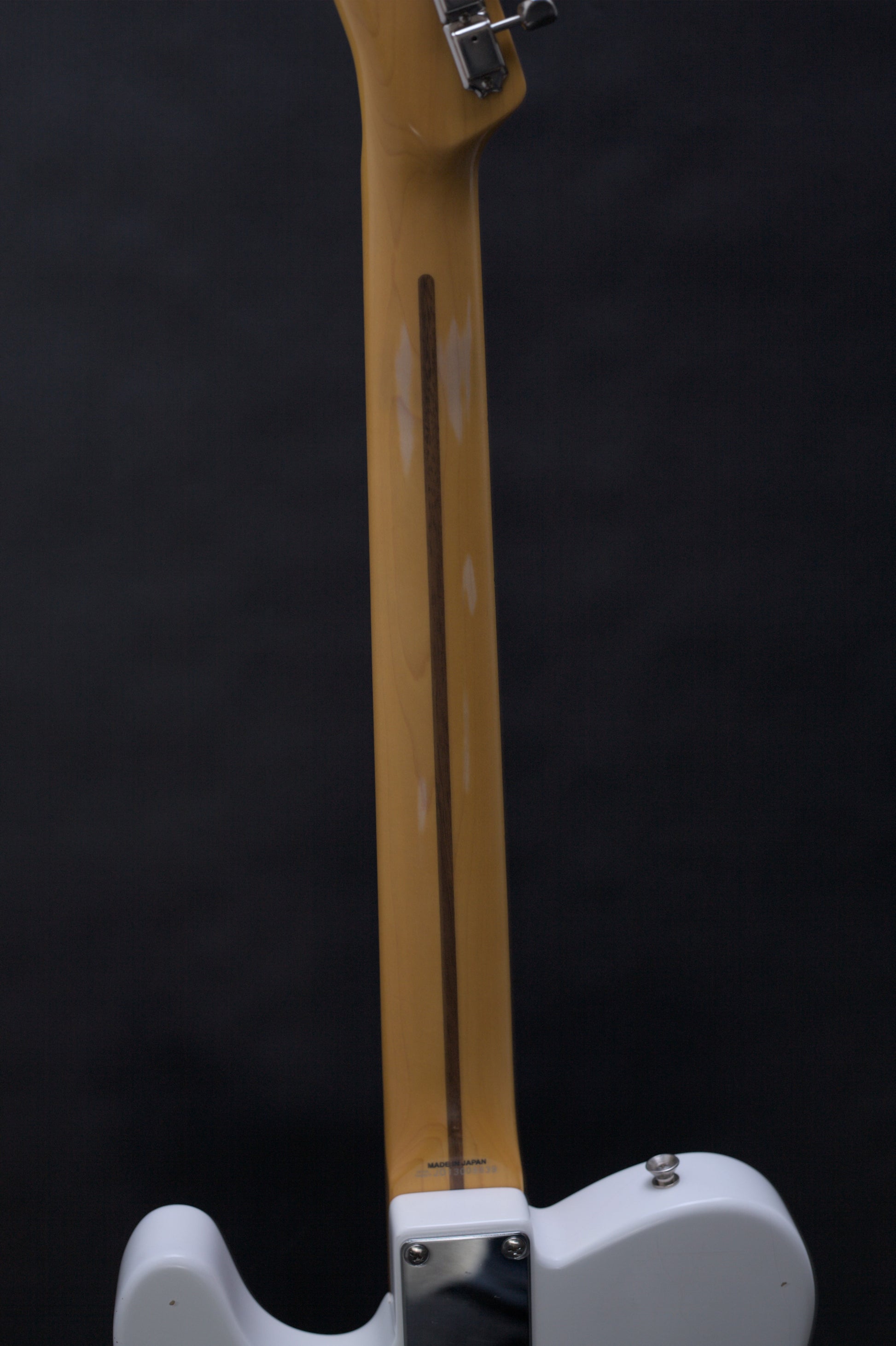 This super cool 2013 Japanese Telecaster has been refinished, reliced and modified. It started life with a natural finish. This has been replaced with a great looking satin white. The electrics have been modified, the pickguard swapped from white to black, the knobs replaced for something a little bit cooler and the bridge saddles upgraded.