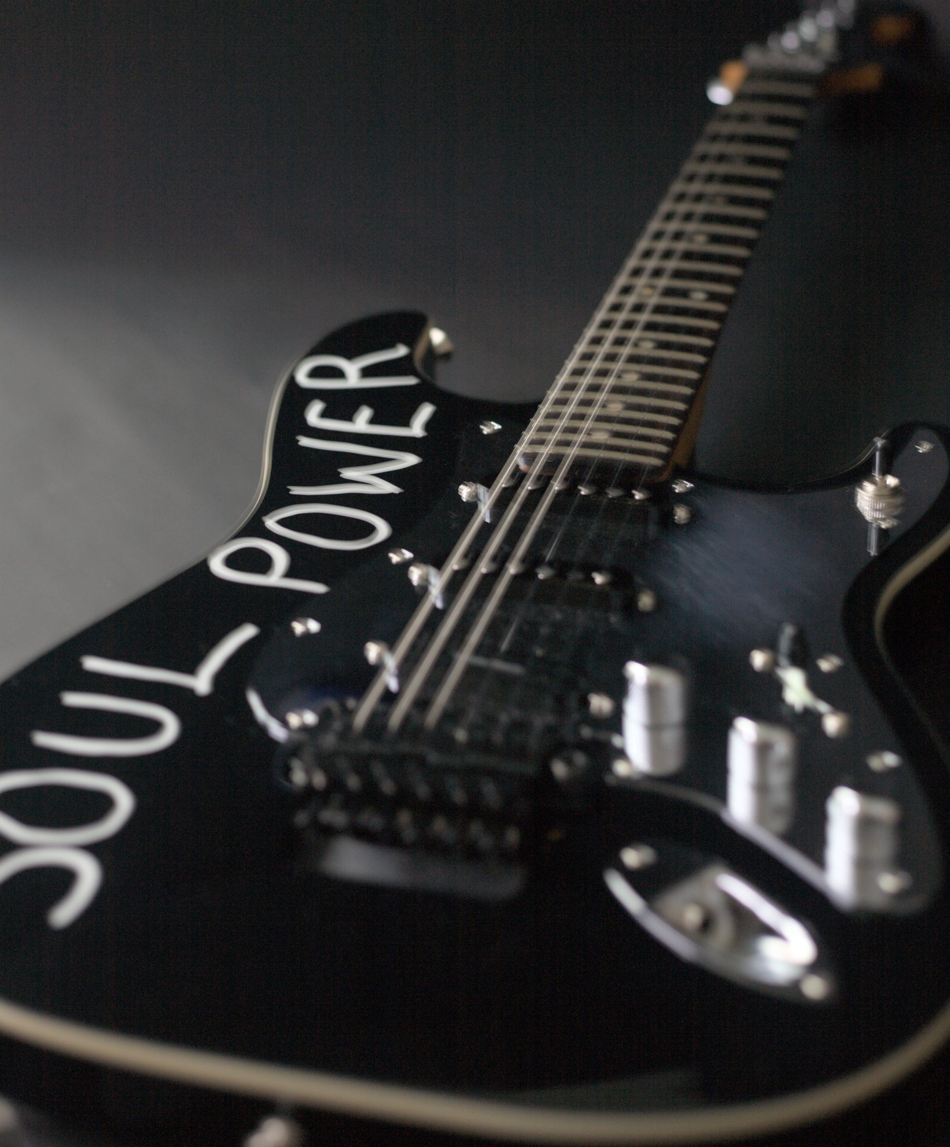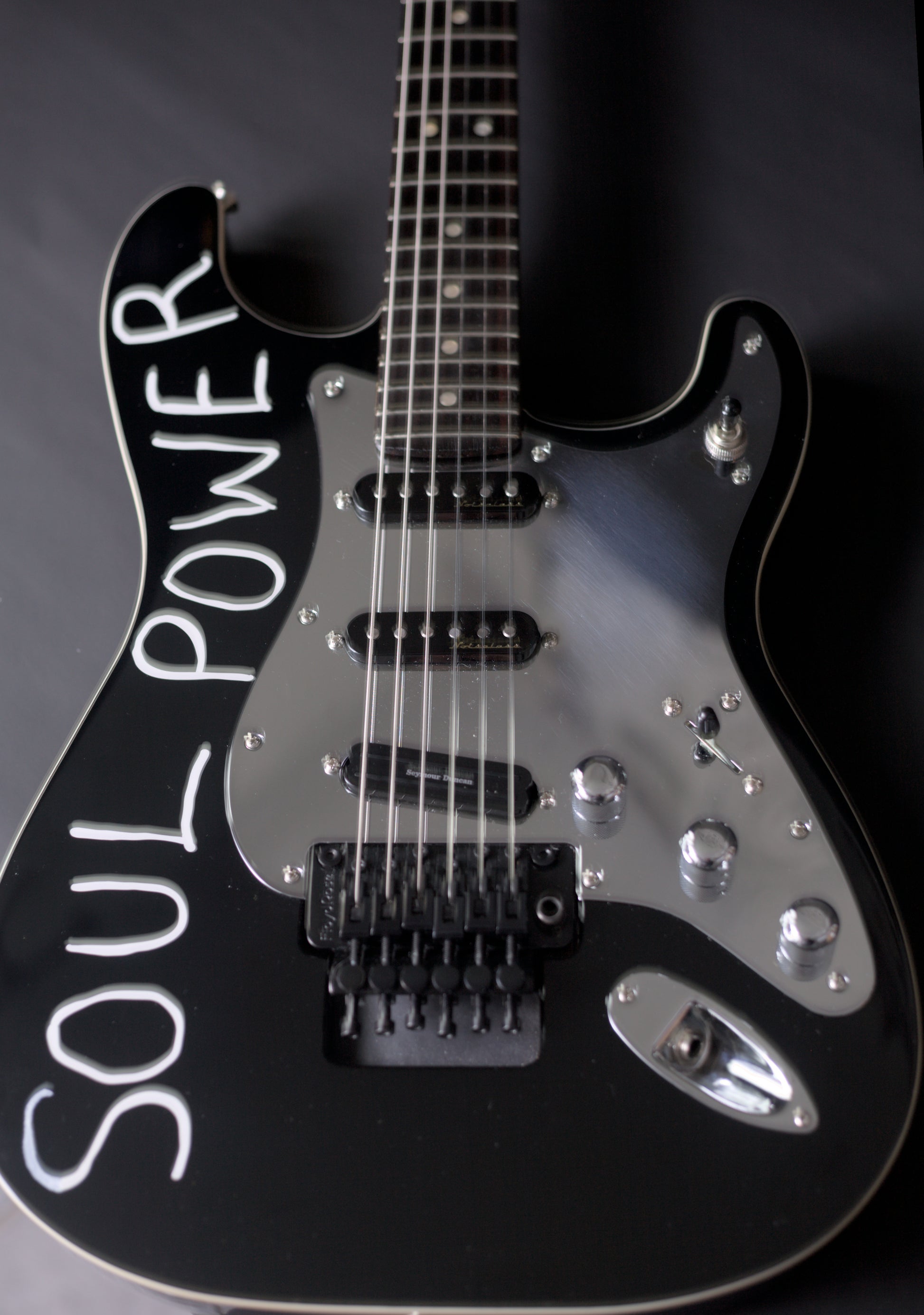 Tom Morello's unique, powerful sounds - from gentle rhythms to screaming feedback, chaotic stutters, and more - require a very special Stratocaster. The Tom Morello "Soul Power" Stratocaster - based on the modified Designer Series Strat used during his time in Audioslave - features an alder slab body with binding and a "Modern C"-shape maple neck with 9.5"-14" compound radius rosewood fingerboard and 22 medium-jumbo frets. Other features include a recessed Floyd Rose locking tremolo system, Seymour Duncan Hot Rails bridge humbucker, two Fender Noiseless pickups in the neck and middle positions, chrome pickguard, kill-switch toggle, locking tuners, matching painted headcap and iconic "Soul Power" body decal.