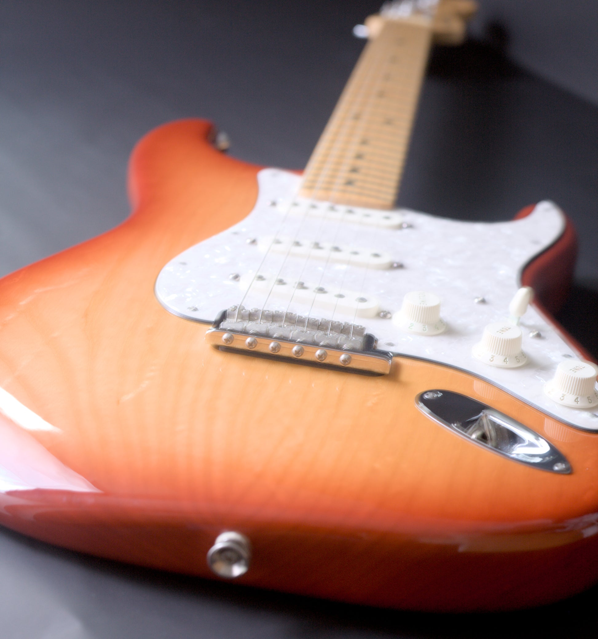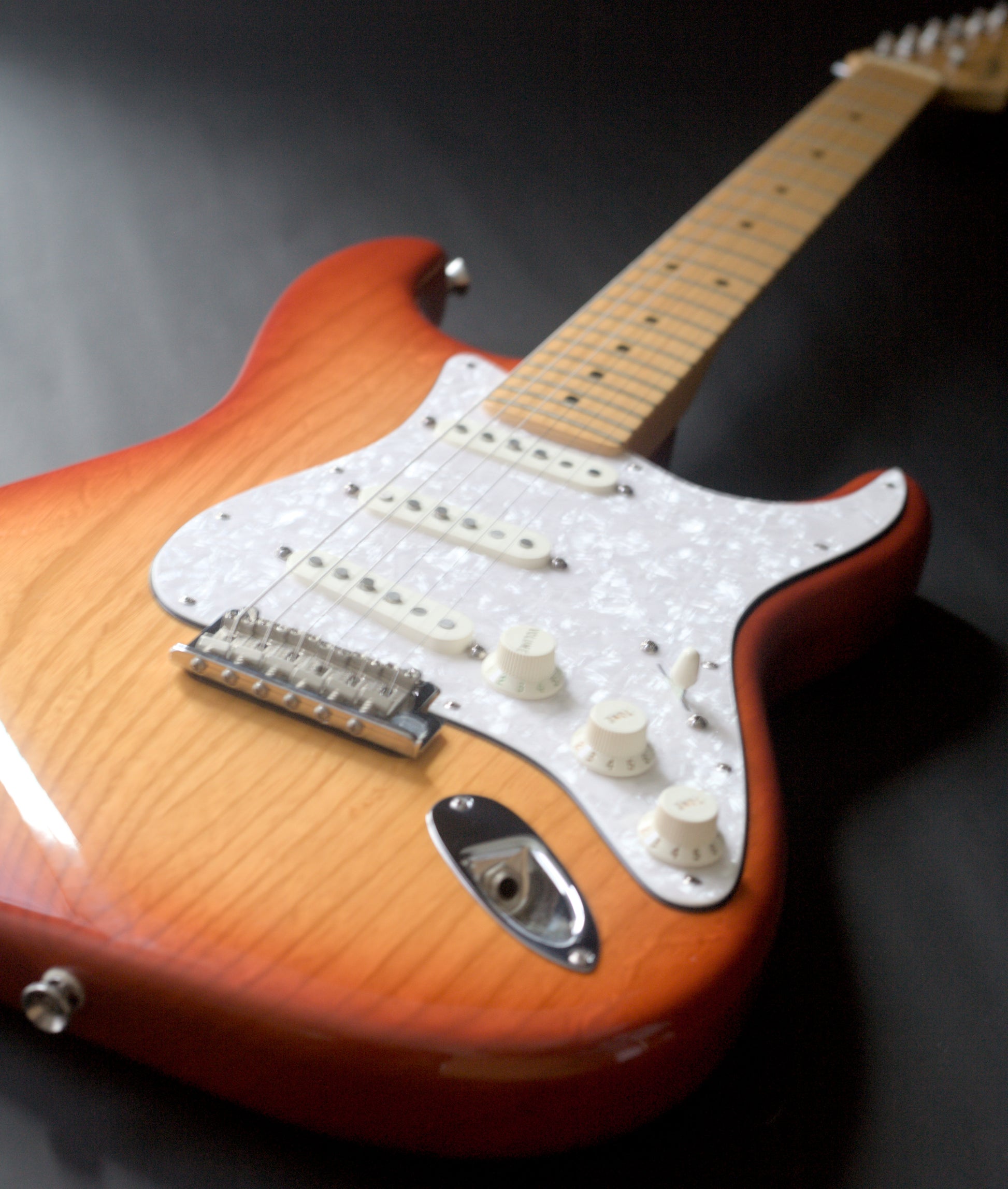 This American beauty has an ash body, a comfortable 9.5" radius maple neck and maple fretboard. It has medium jumbo frets, which we just love (if you want anything other than tall frets on your Strat these days you have to shell out for an Elite). It is loaded with Fat 50 pickups, which are probably Fender's best pickups and sound just like those in the Strats of the early 60's, and are great for rock, blues, funk or even jazz.