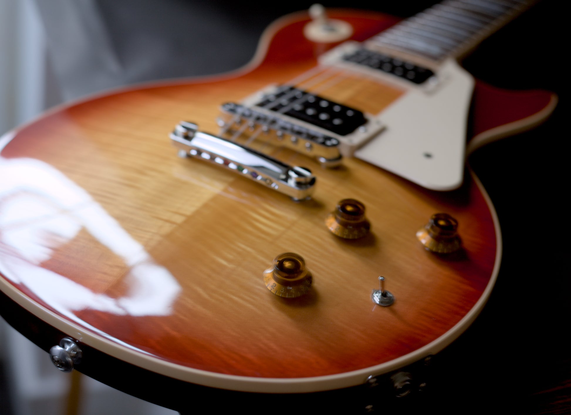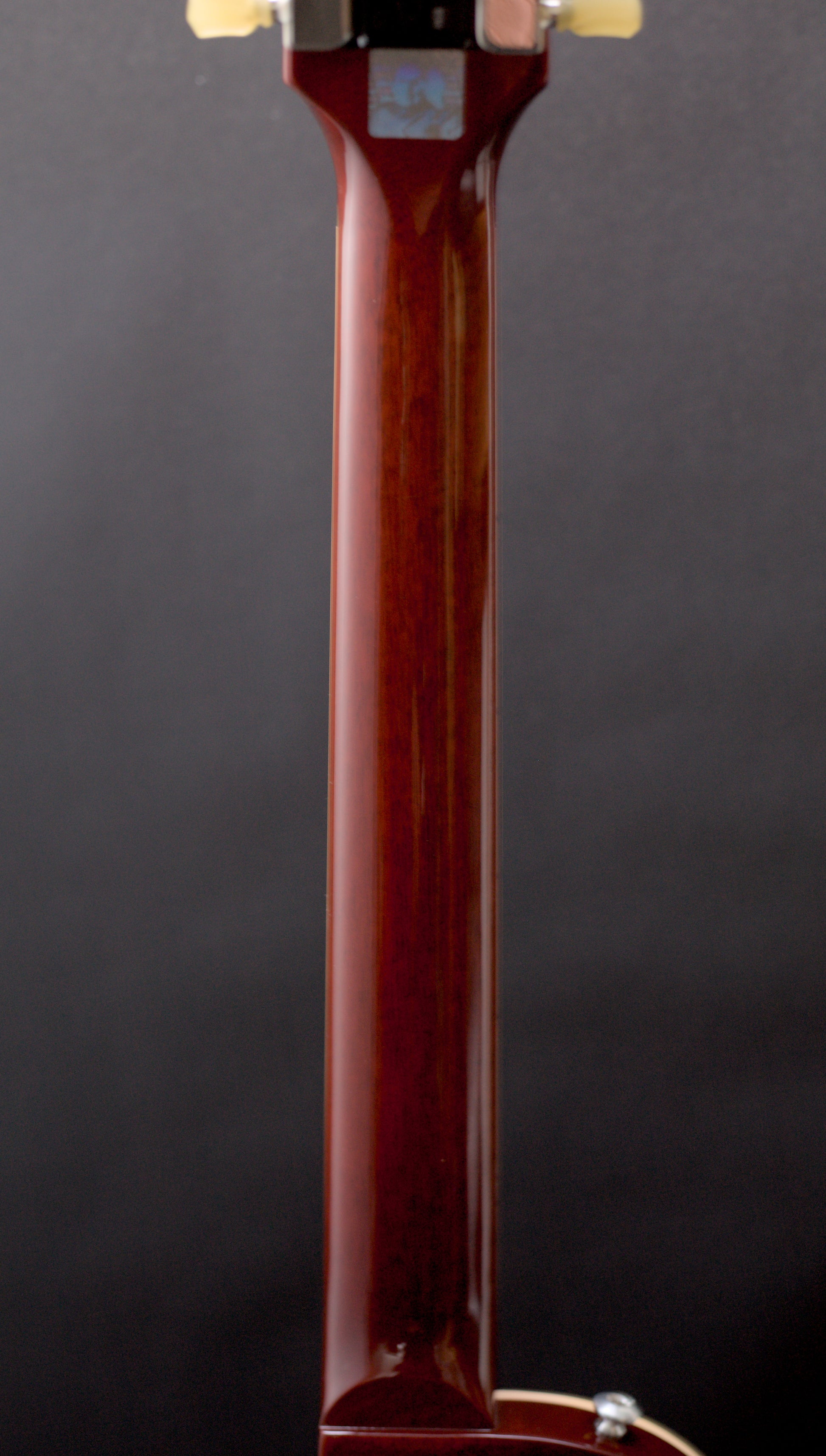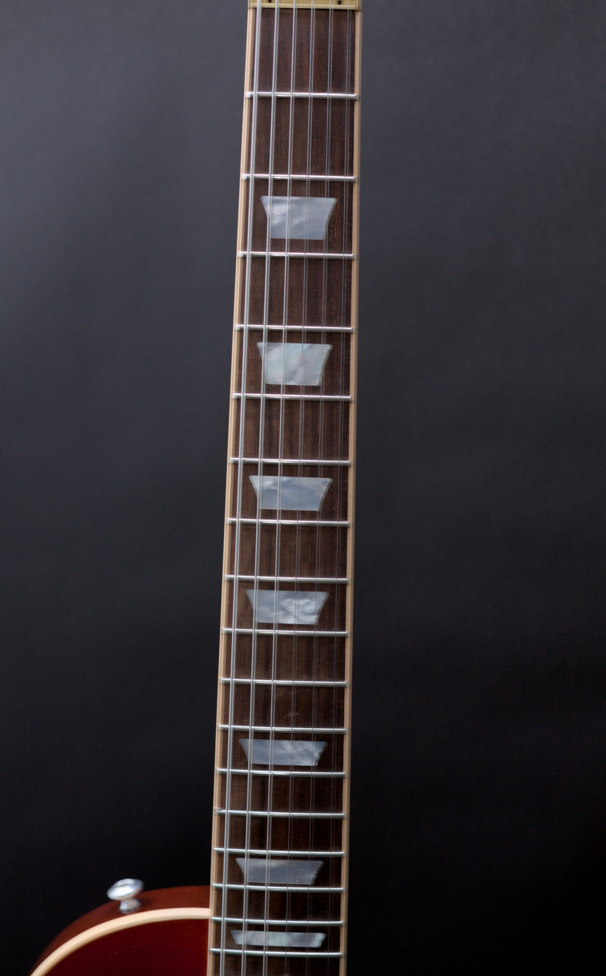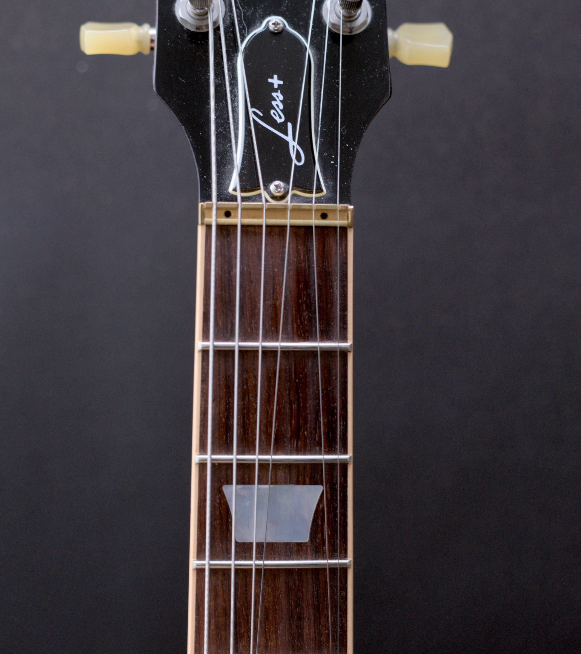 Design Elements: Two humbucker pickups, trapezoid inlays, three control knobs, mini toggle-activated active boost, three-way pickup selector, white pickguard, bound fingerboard, brass nut, electronic tuners, tune-o-matic bridge
