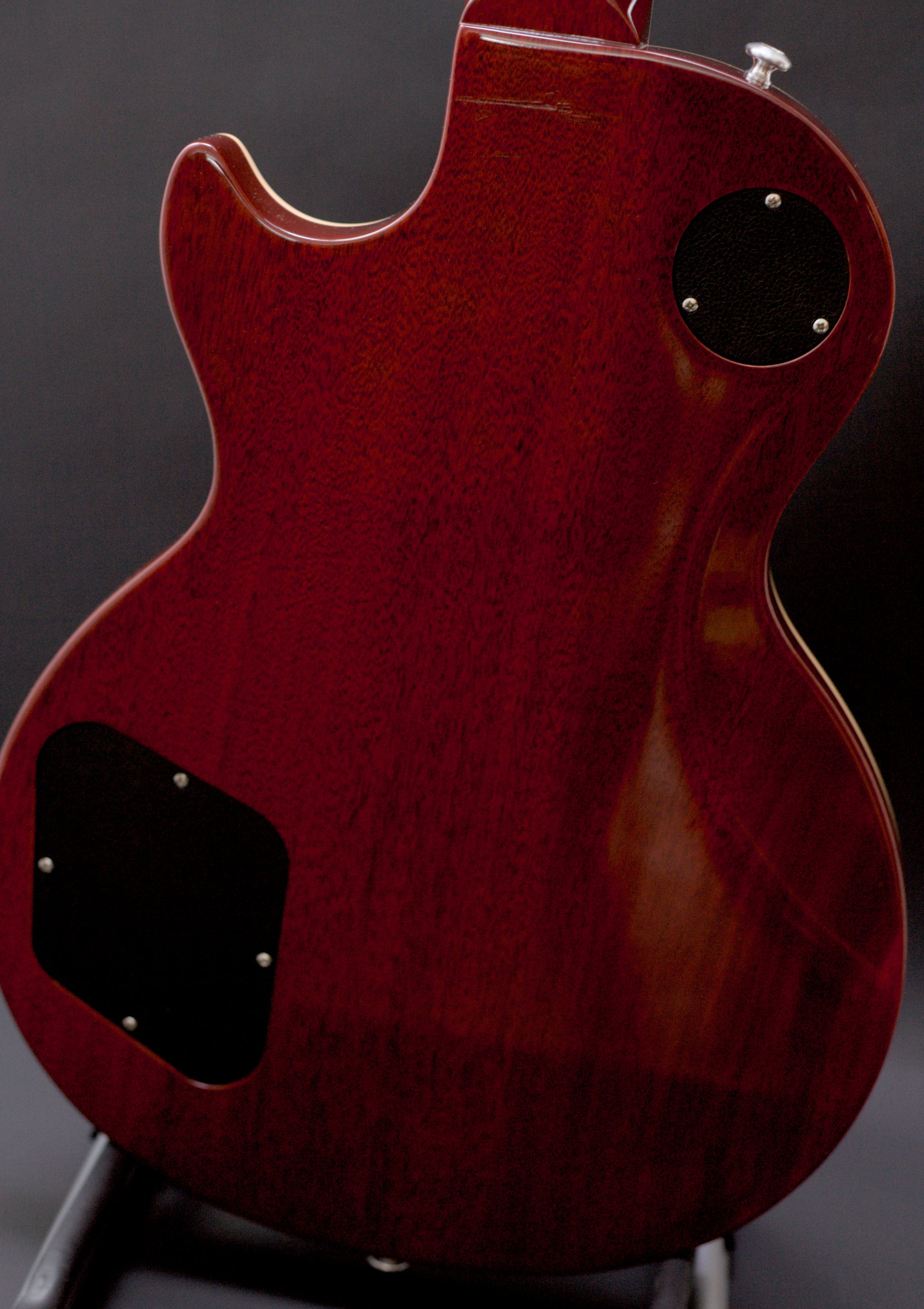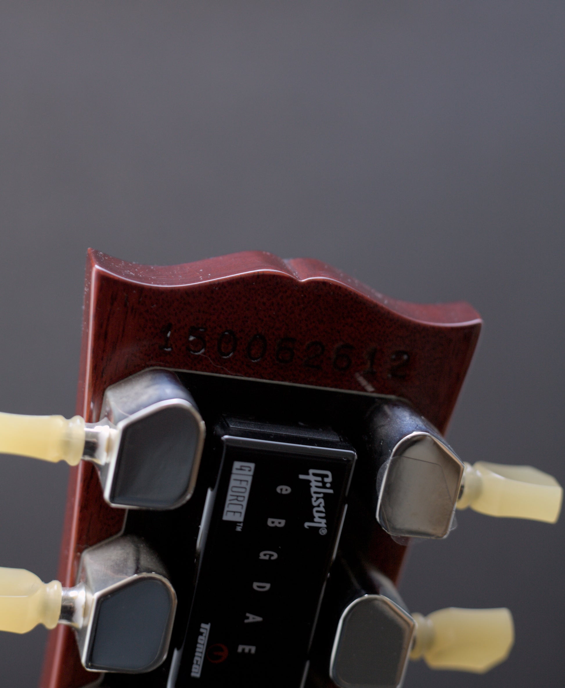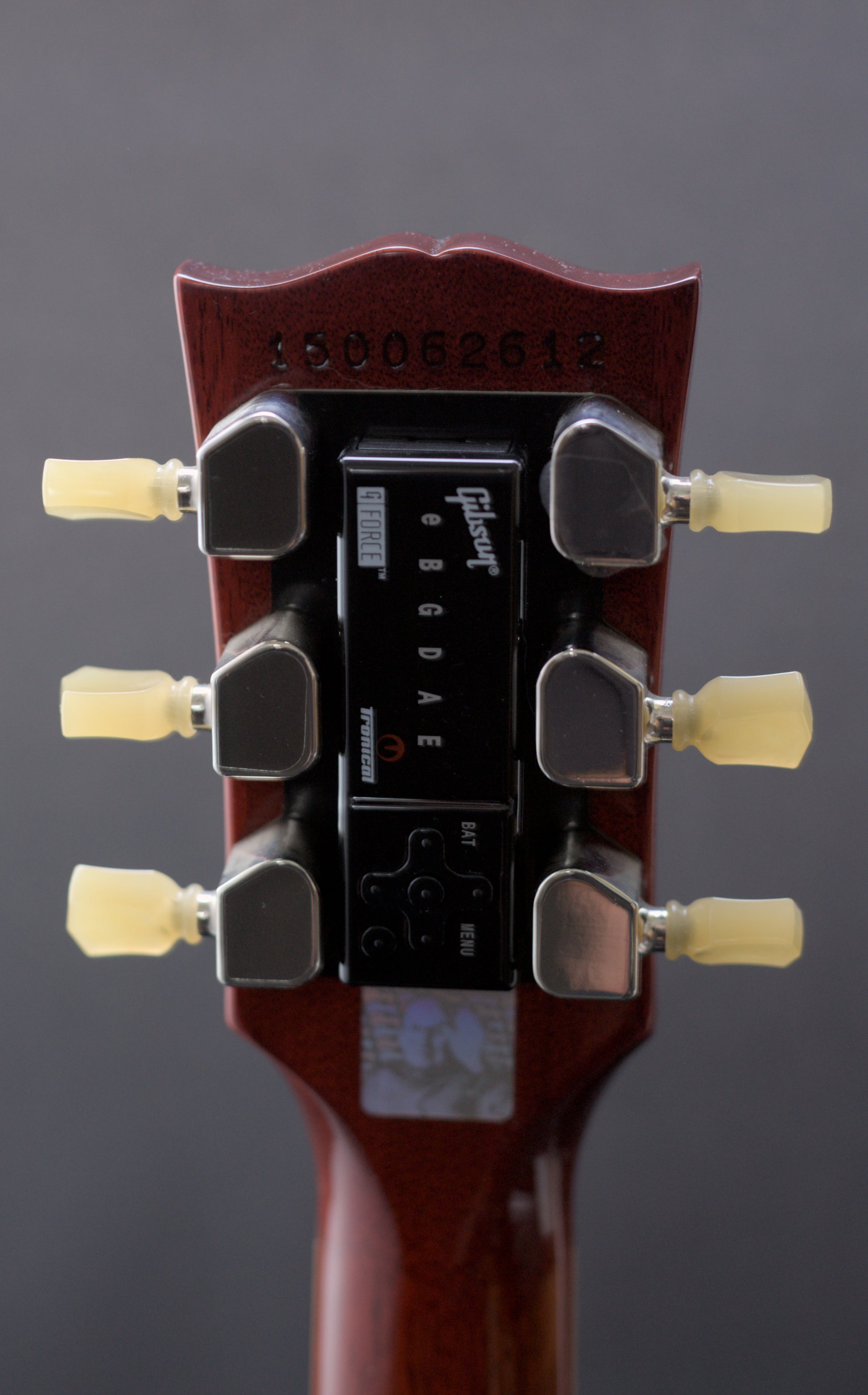It features a pair of uncovered vintage-voiced humbuckers and an active boost circuit, as well as the G-Force tuning system, removable pickguard, zero-fret brass nut, and wider neck that most 2015 Les Pauls received.
