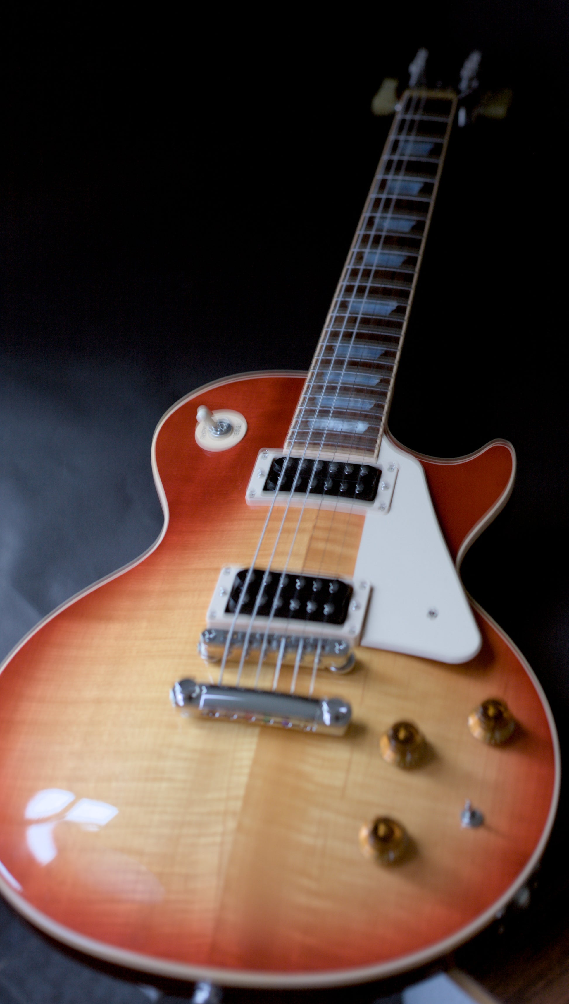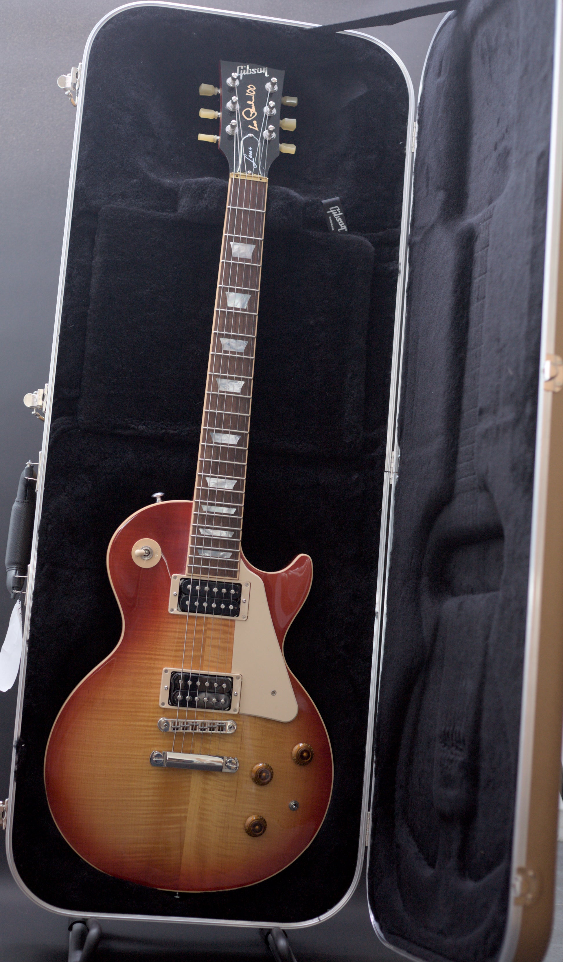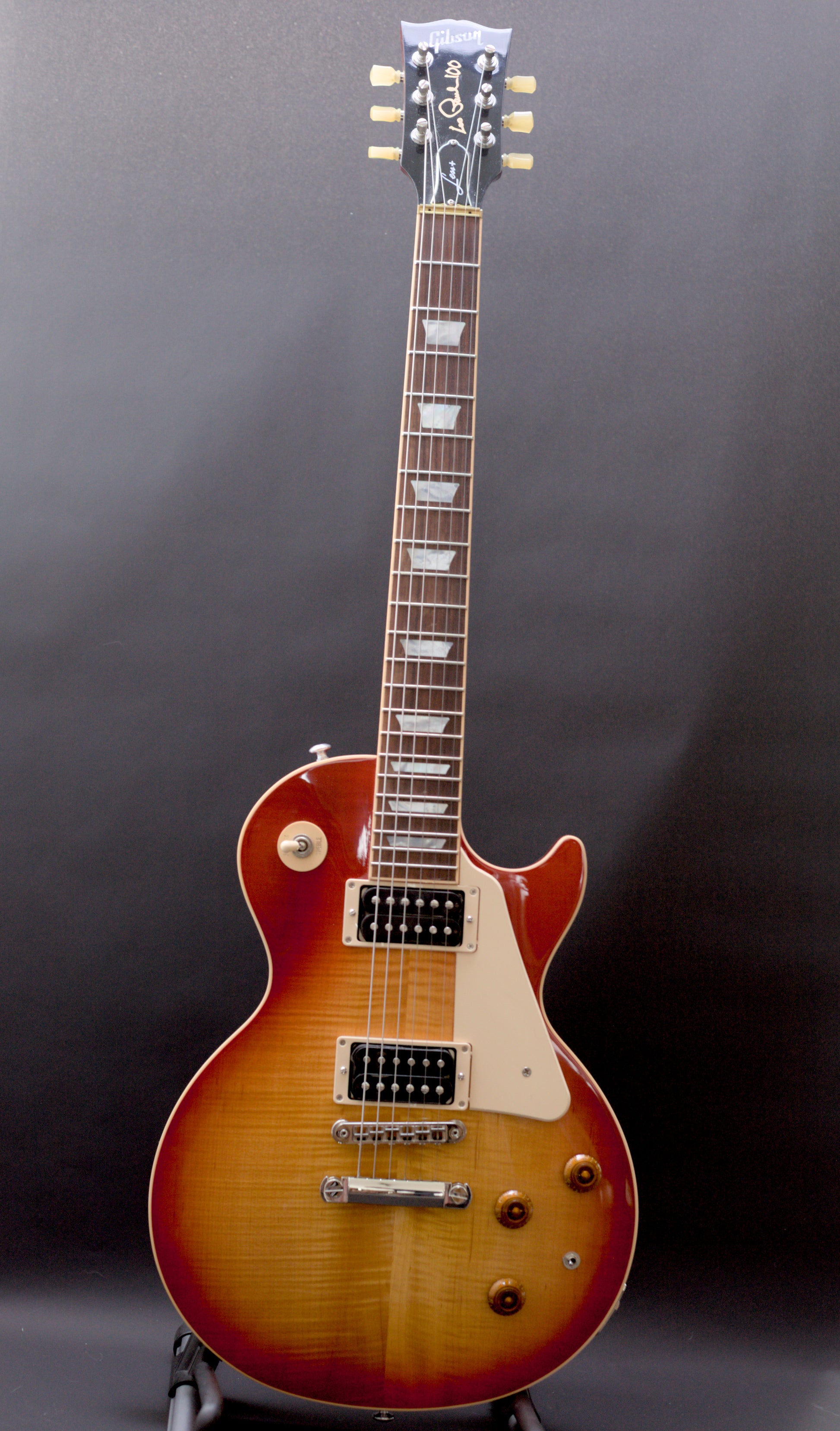 It features a pair of uncovered vintage-voiced humbuckers and an active boost circuit, as well as the G-Force tuning system, removable pickguard, zero-fret brass nut, and wider neck that most 2015 Les Pauls received.
