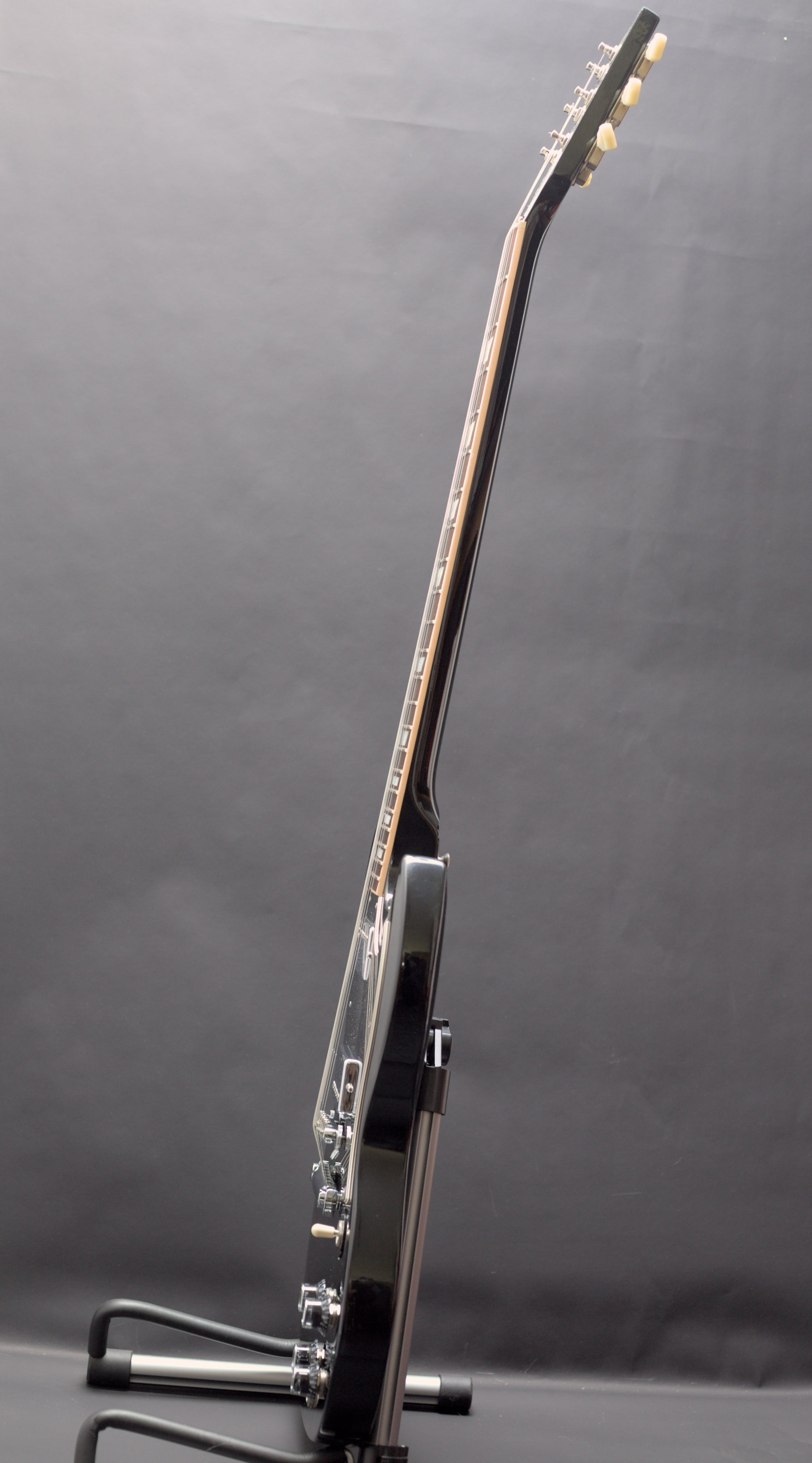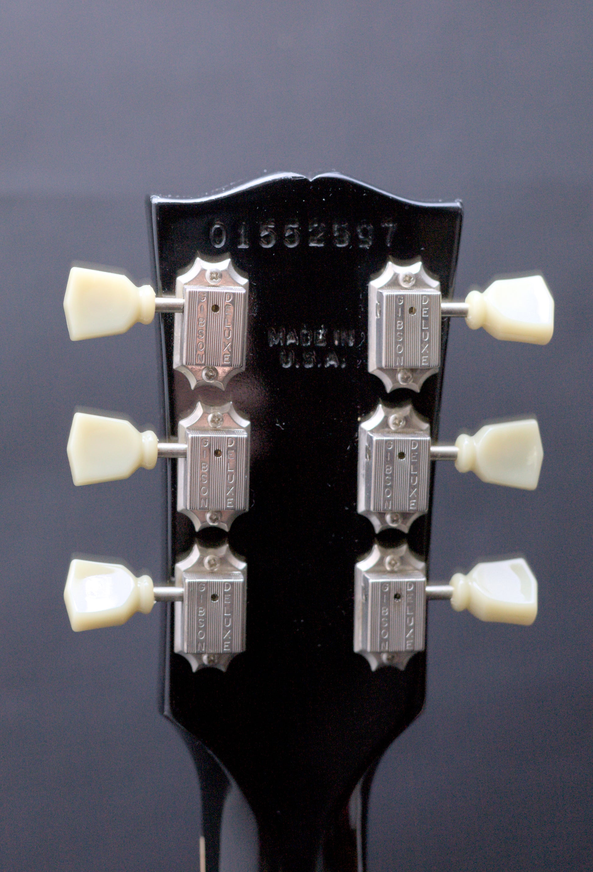 It features an all-mahogany construction finished in gloss Ebony lacquer, solid quarter-sawn mahogany neck, rosewood fretboard with 12″ radius, trapezoid inlays, Corian nut, 1 11/16″ nut width, bound fretboard, 22 medium jumbo frets, Gibson Deluxe tuners with Keystone buttons, holly headstock overlay with mother-of-pearl inlaid logo and crown inlays, black top hat knobs with silver inserts, Tuneomatic ABR-1 bridge and Gibson’s most popular pickups, the 490R/498T Alnico humbuckers.