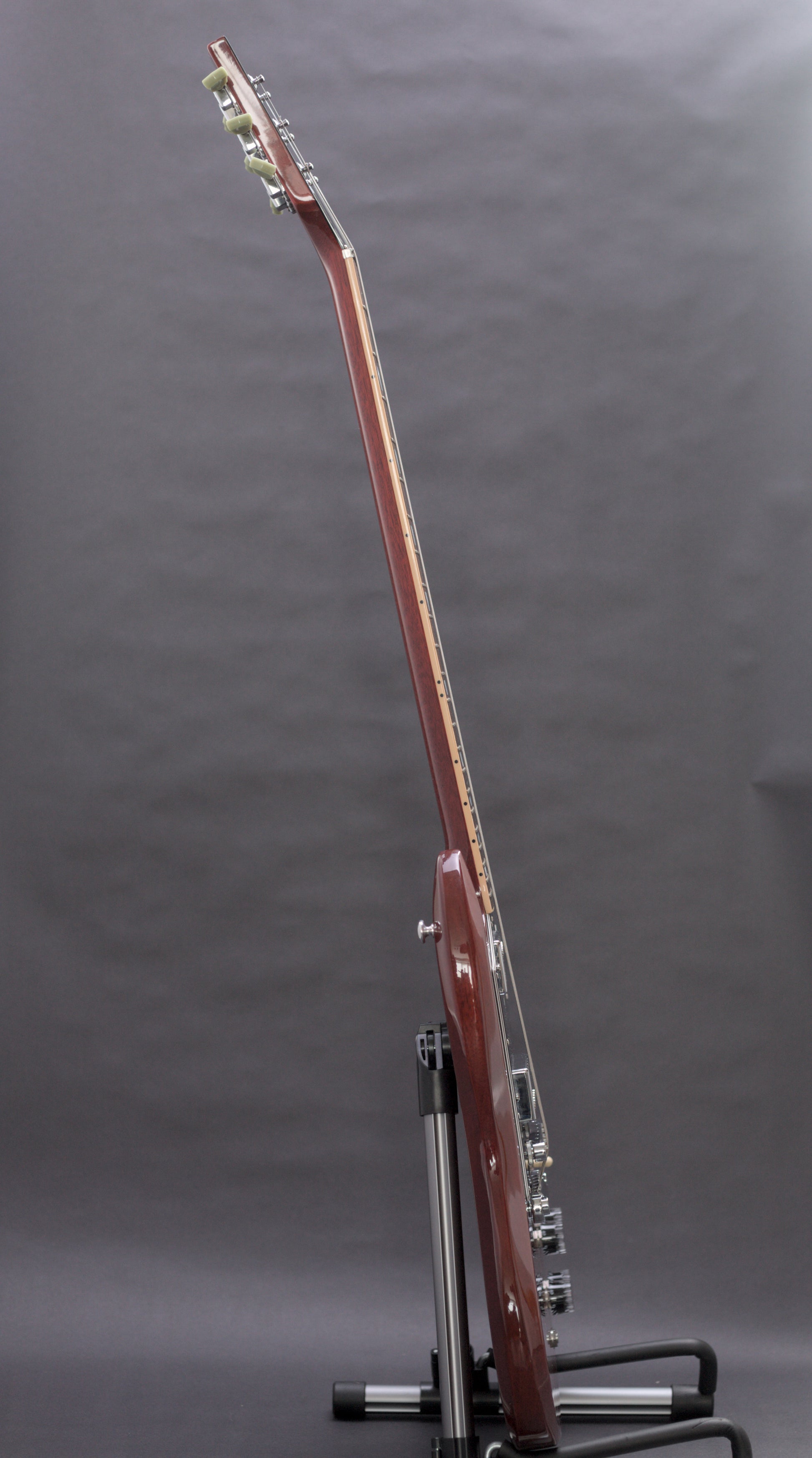 As you would expect from an SG, the body is made entirely of mahogany, it is of lightweight construction with a beveled top and a large (black, of course) pickguard and is paired with a rounded mahogany neck. The HP though features a number of awesome specs for the modern player. It has fast access heel in the back and a rounded, wider soloists neck profile intended to give more room for big bends and tapping than the traditional LP neck width.