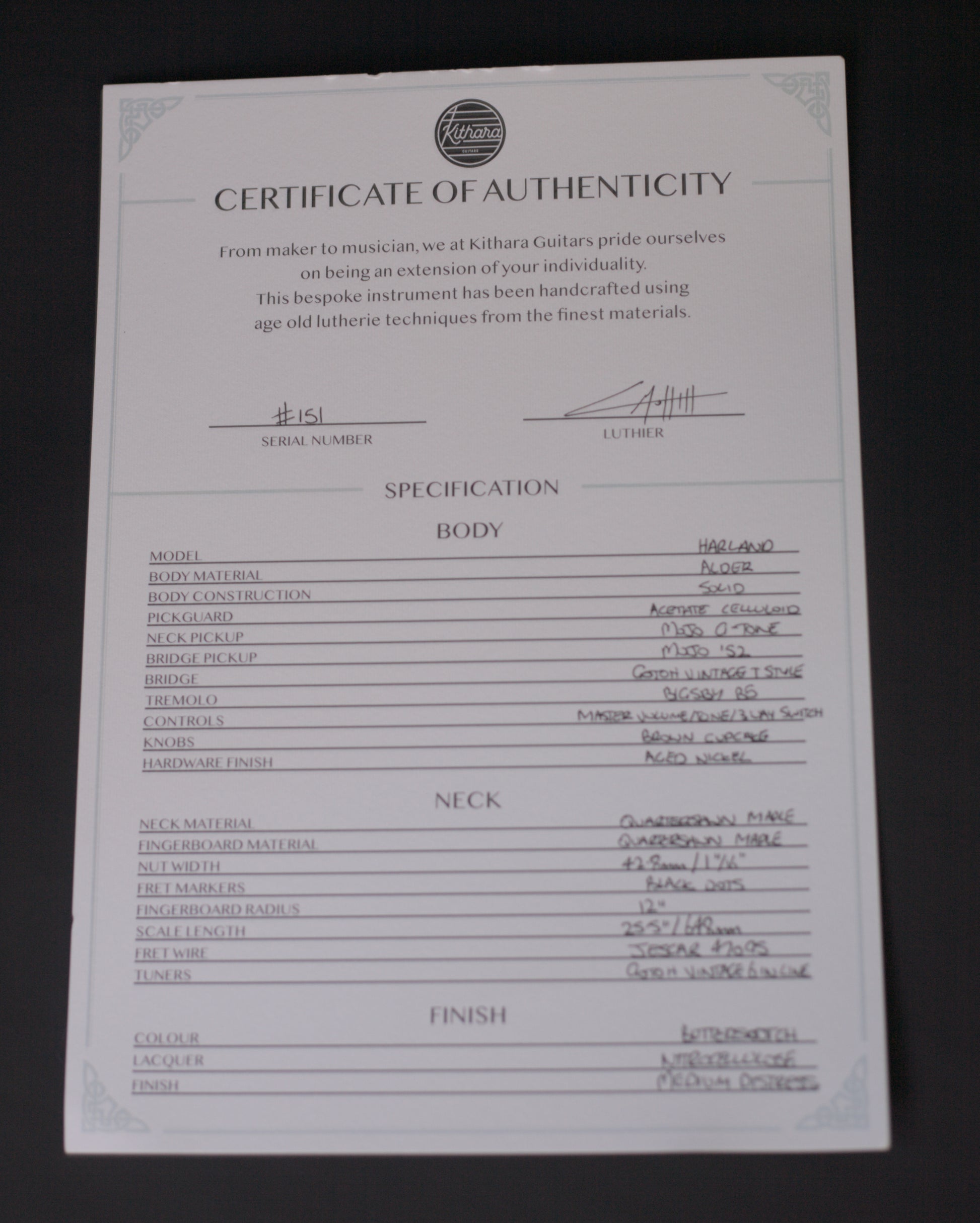 The Harland features a contoured Alder body, adding comfort to the playability. Renowned for the feel of our handcrafted necks, the Harland provides a range of options such as hand selected quarter-sawn maple or mahogany. The fingerboard is Indian rosewood, delivering the classic feel. For the pickguard and cavity plate, we use Acetate cellulose, adding to the vintage vibe." - Kithara Guitars