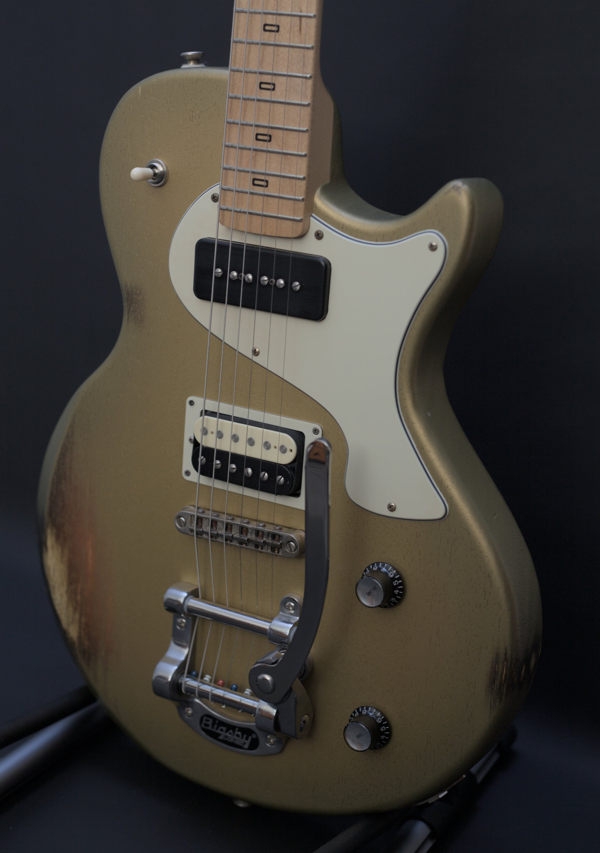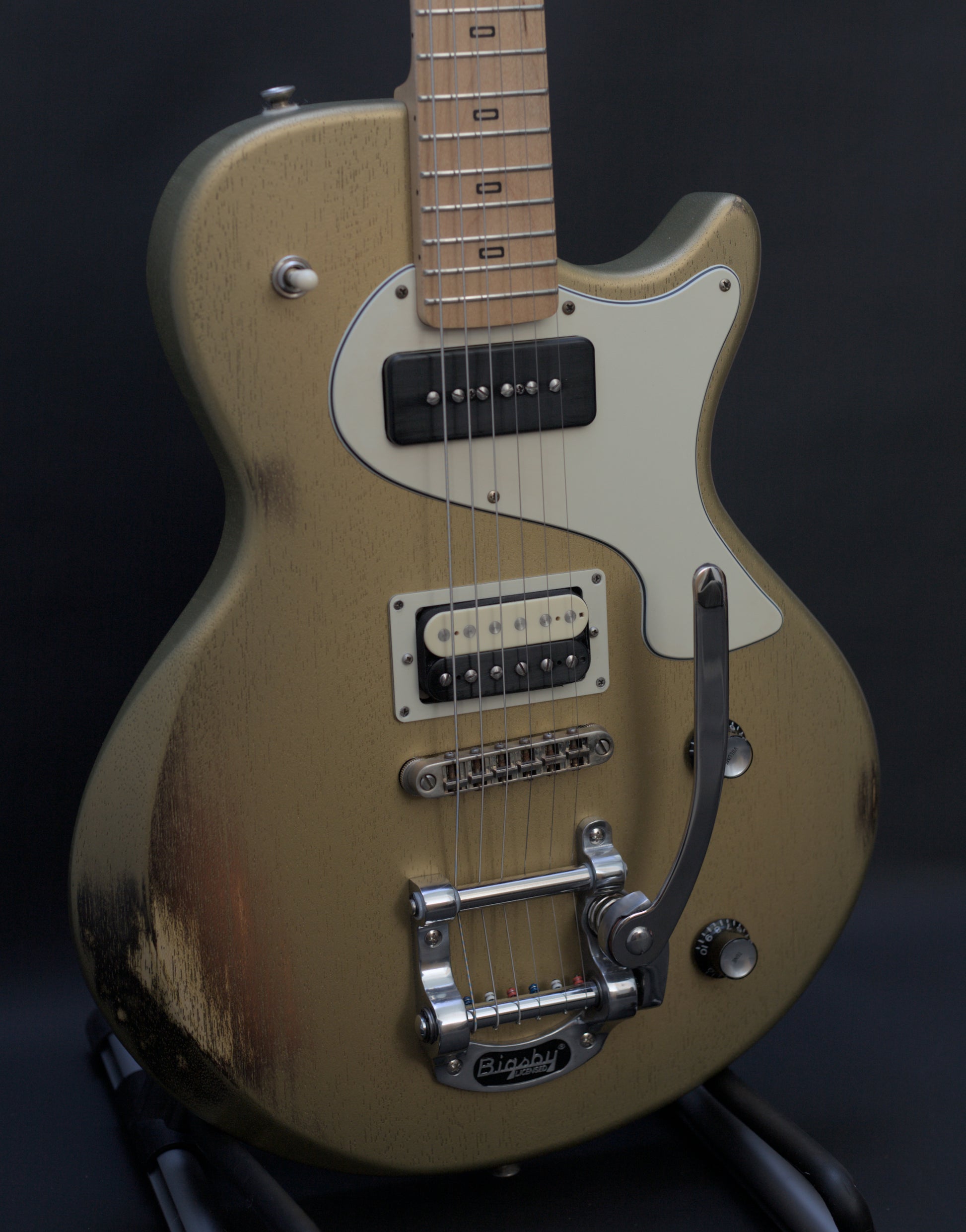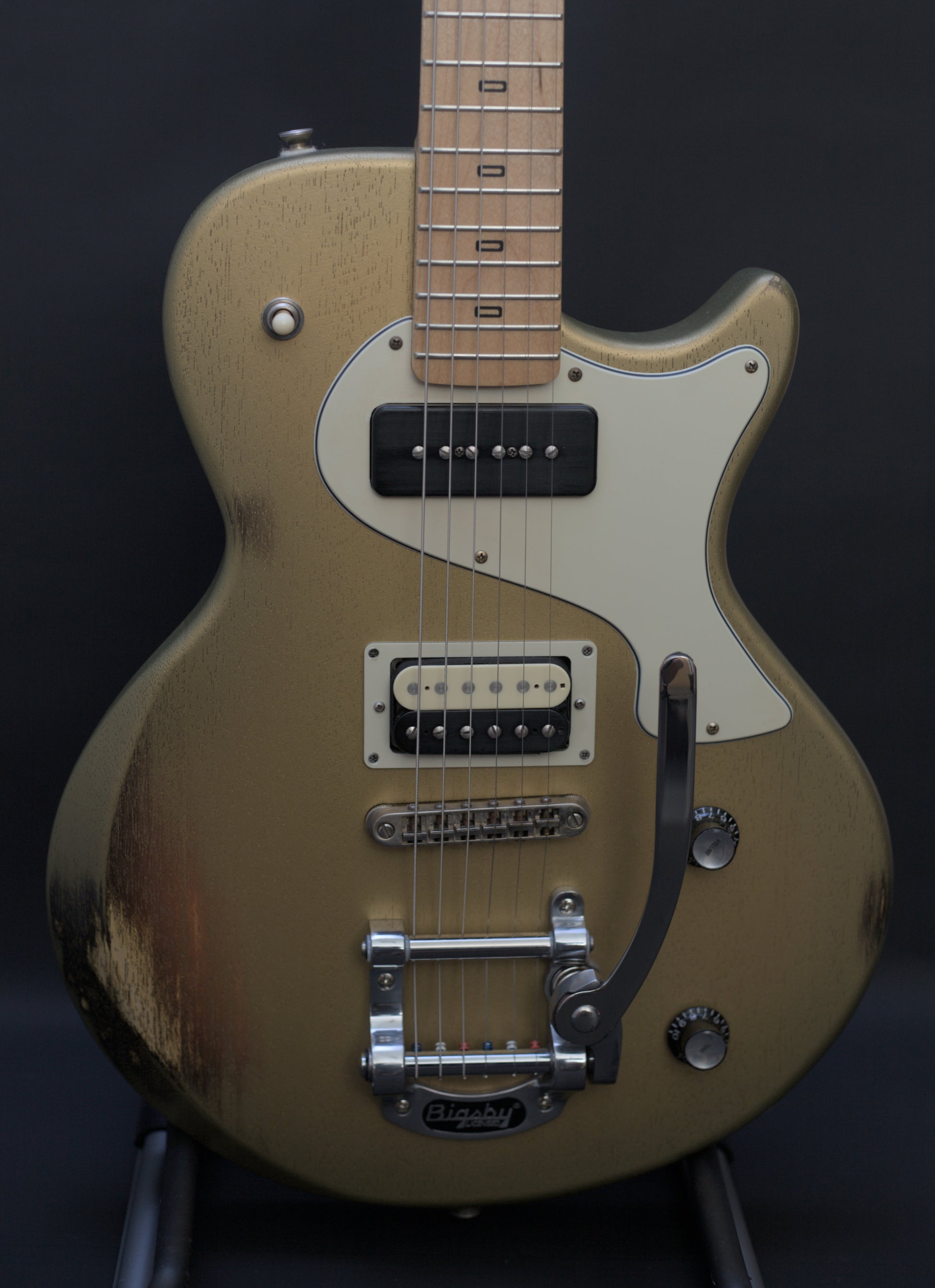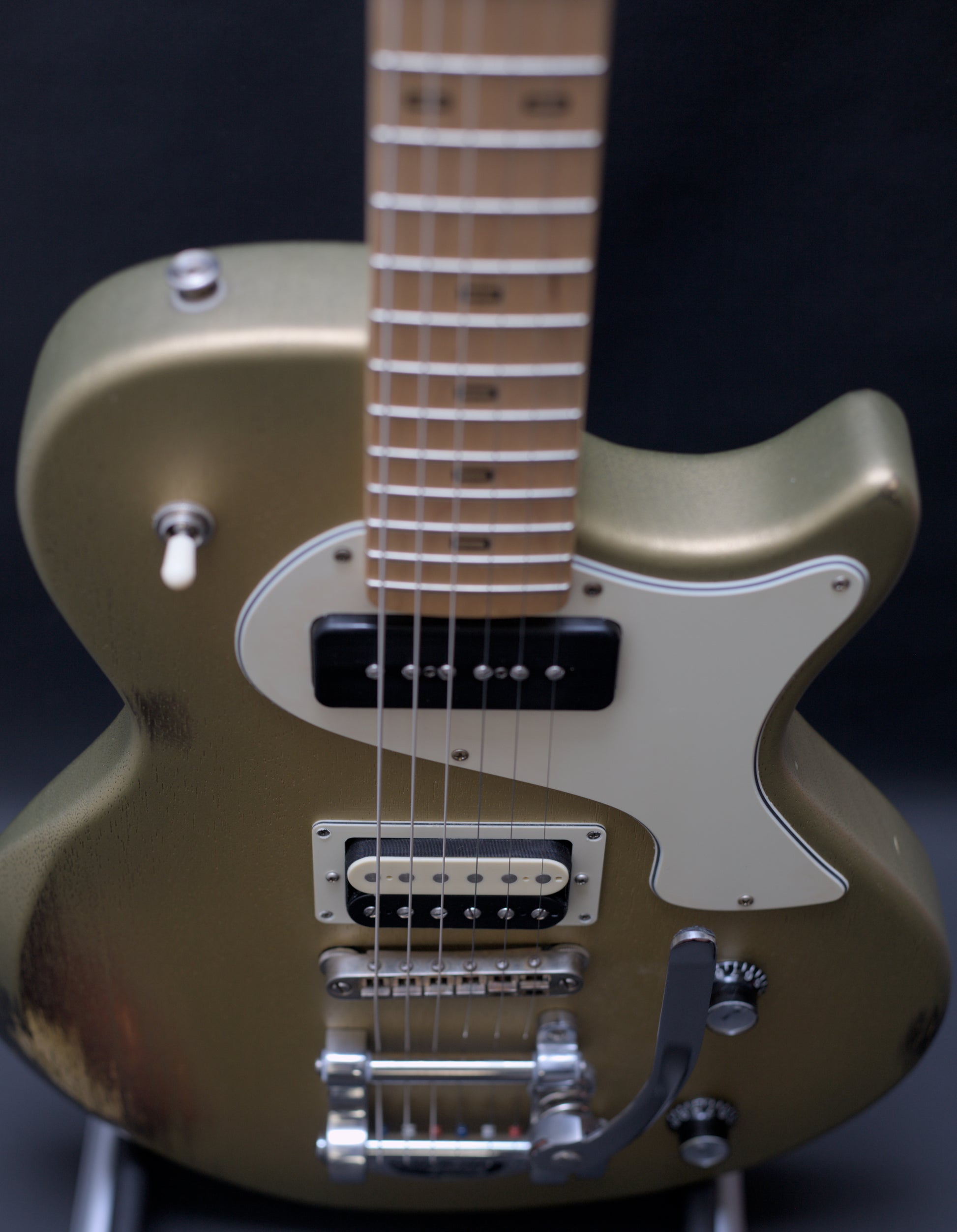 At just 6.25lbs, this lightweight, bolt-on constructed guitar consists of an Obeche body, a Maple neck, and a 22-fret Maple fingerboard. Other appointments include aged Gotoh Vintage Tuners and Tune-O-Matic bridge, a Bigsby B50 tremolo system, a Wadfather Humbucker in the bridge position and a Parkins Cream P90 pickup in the neck position.