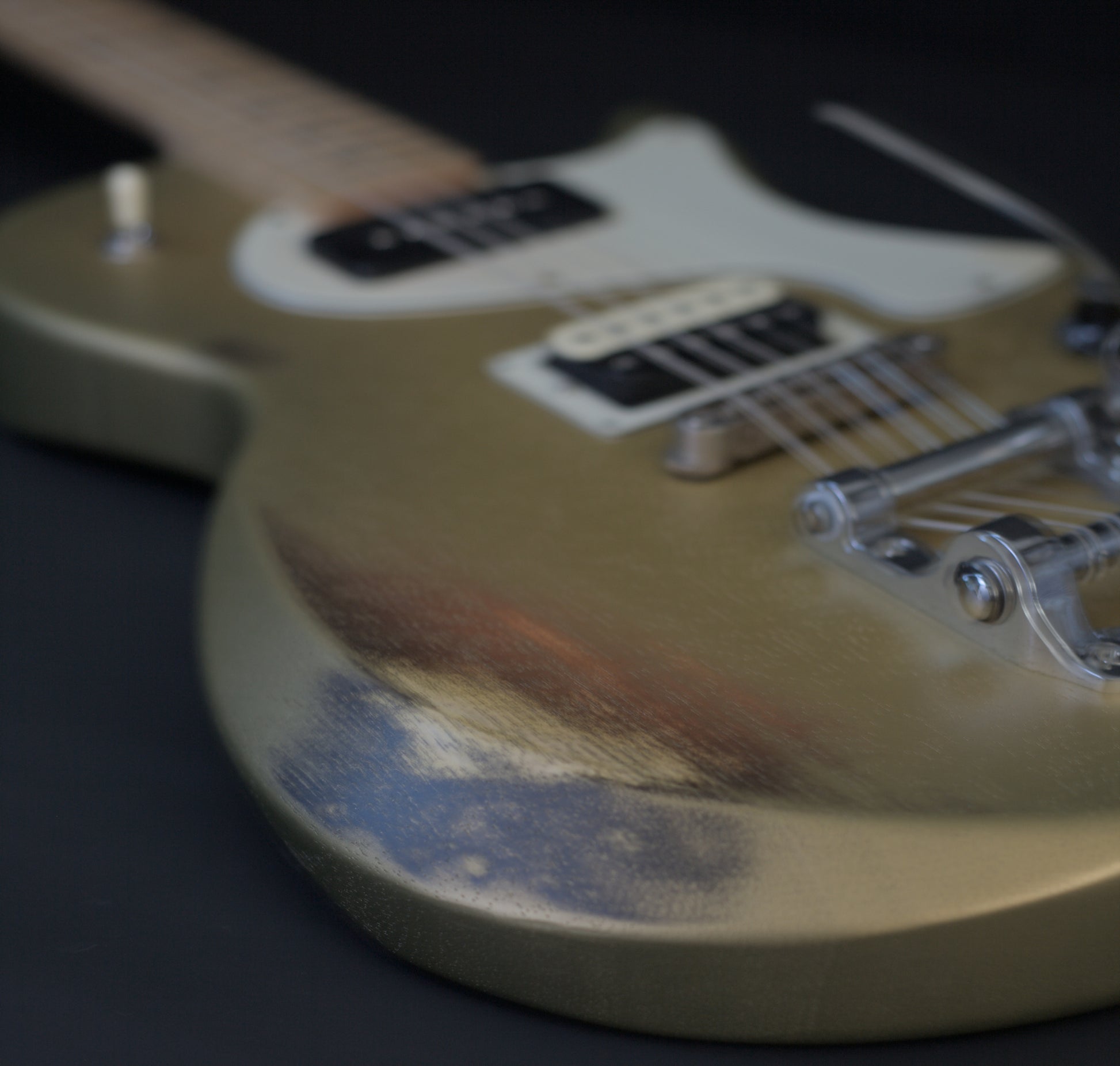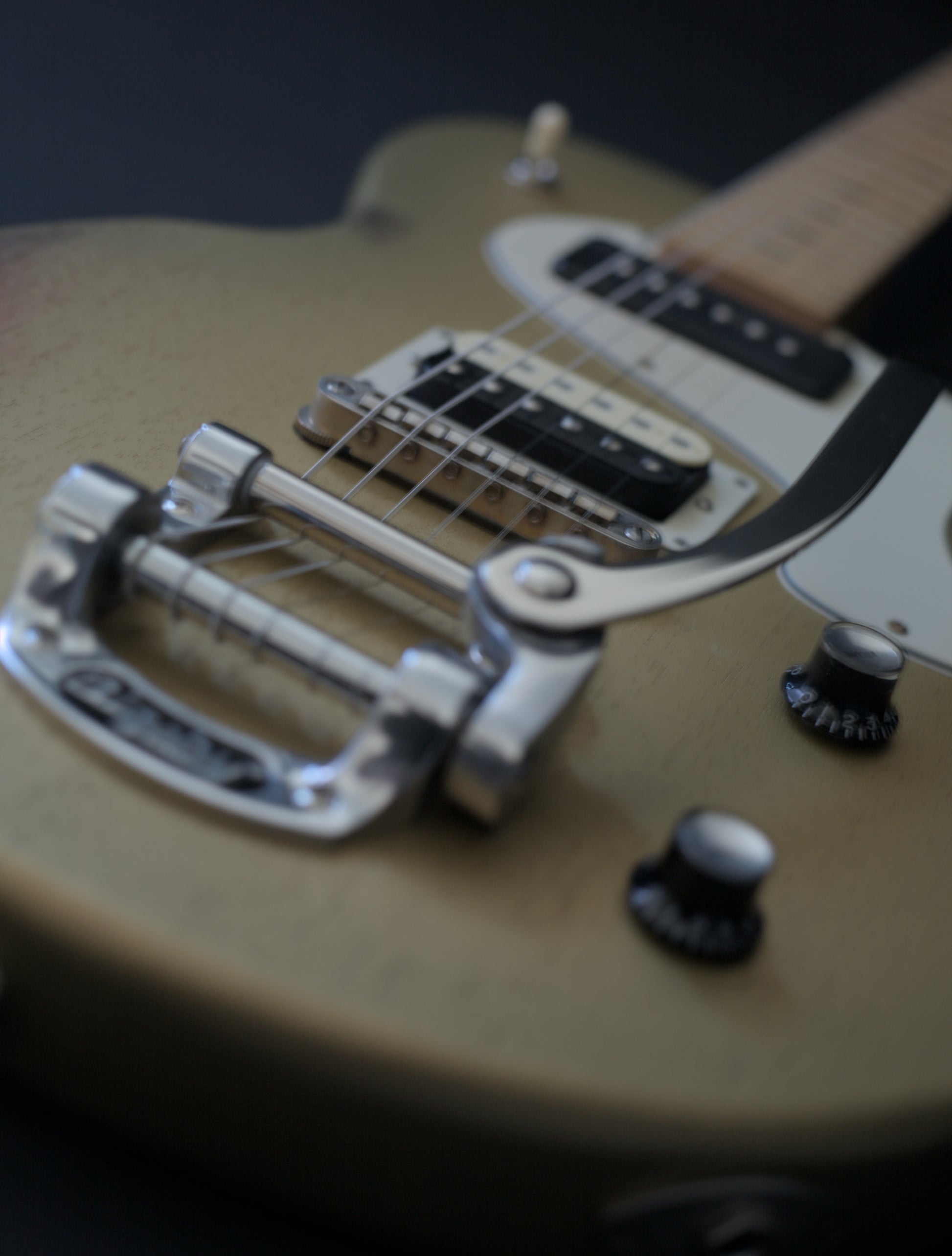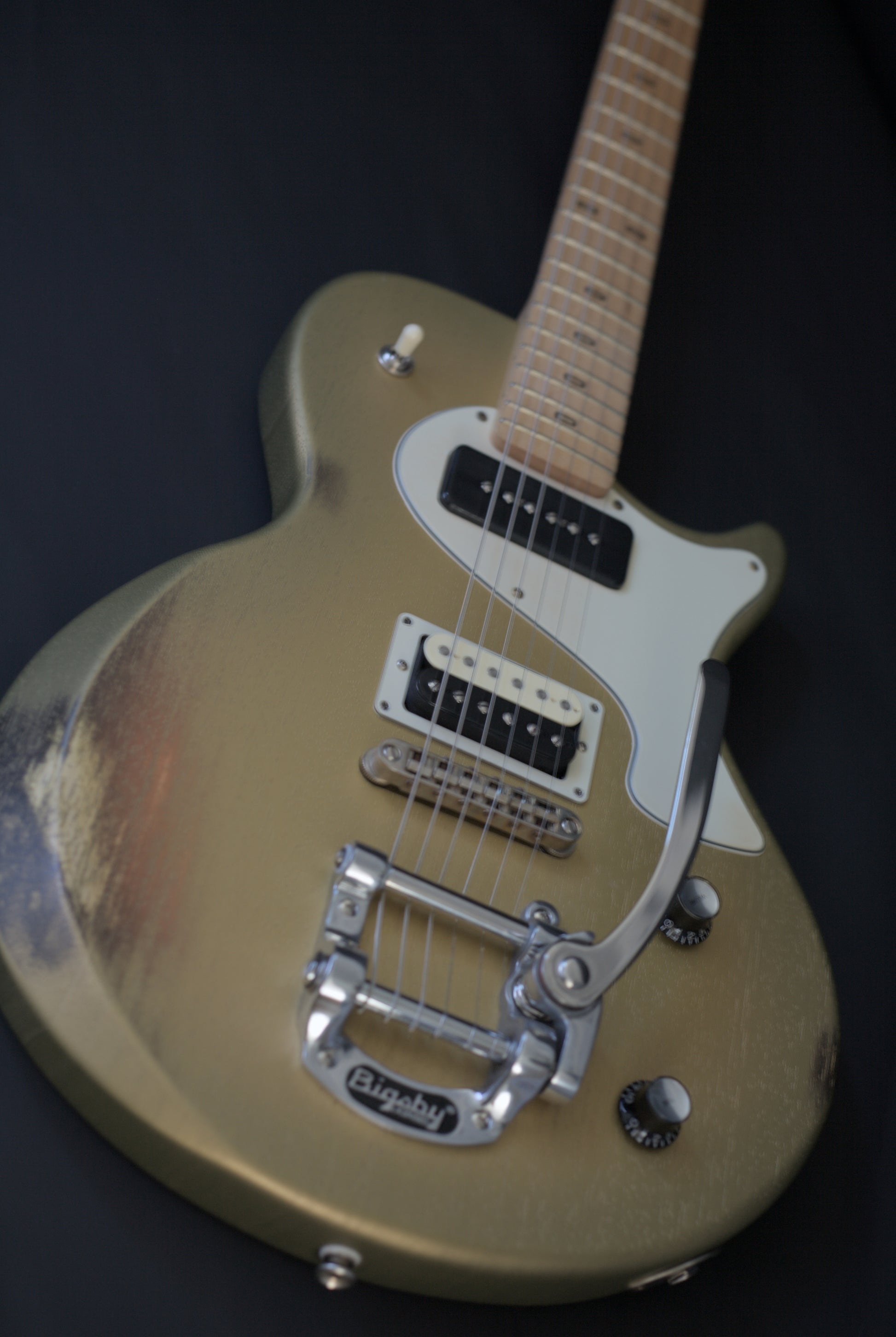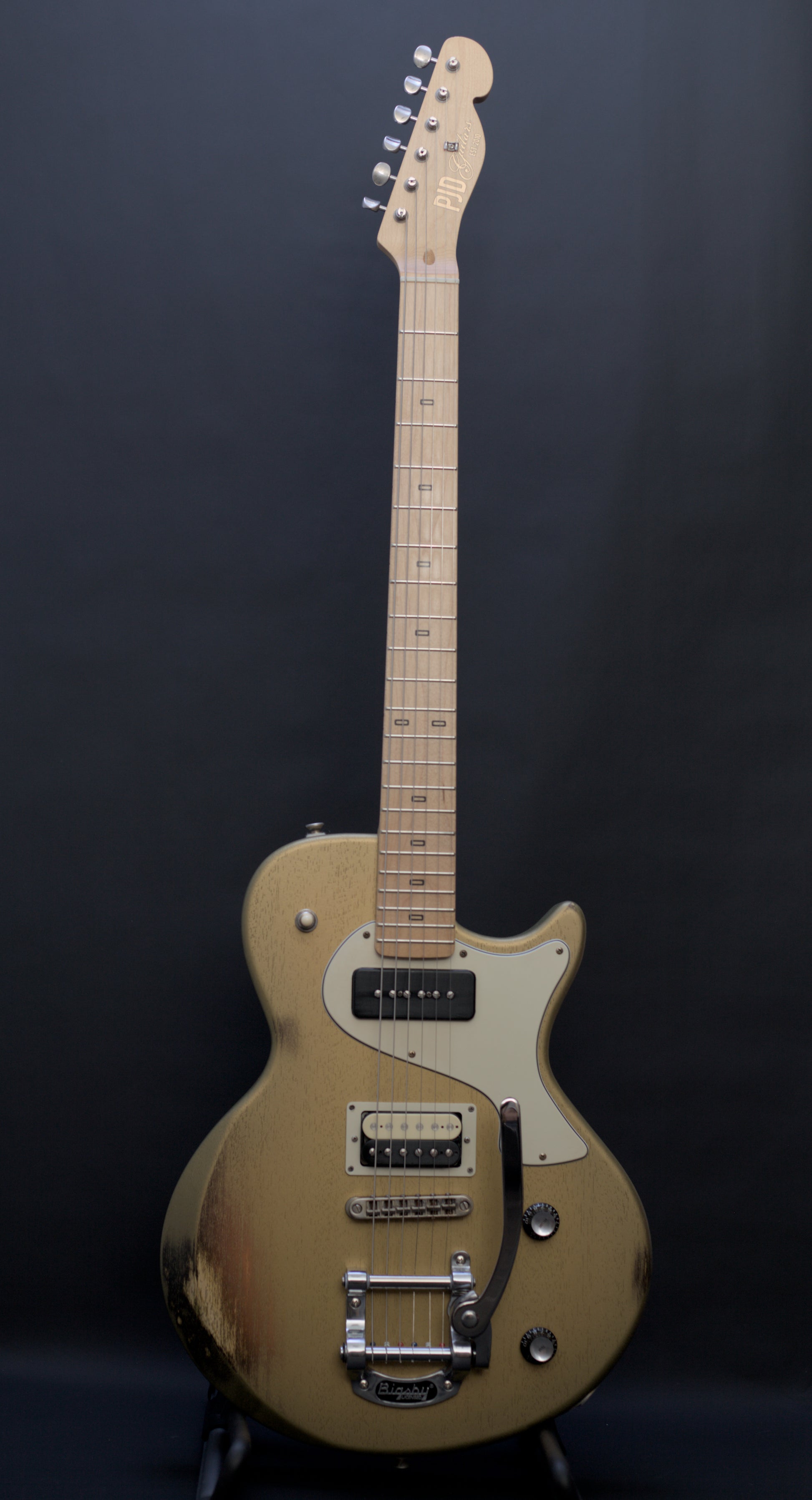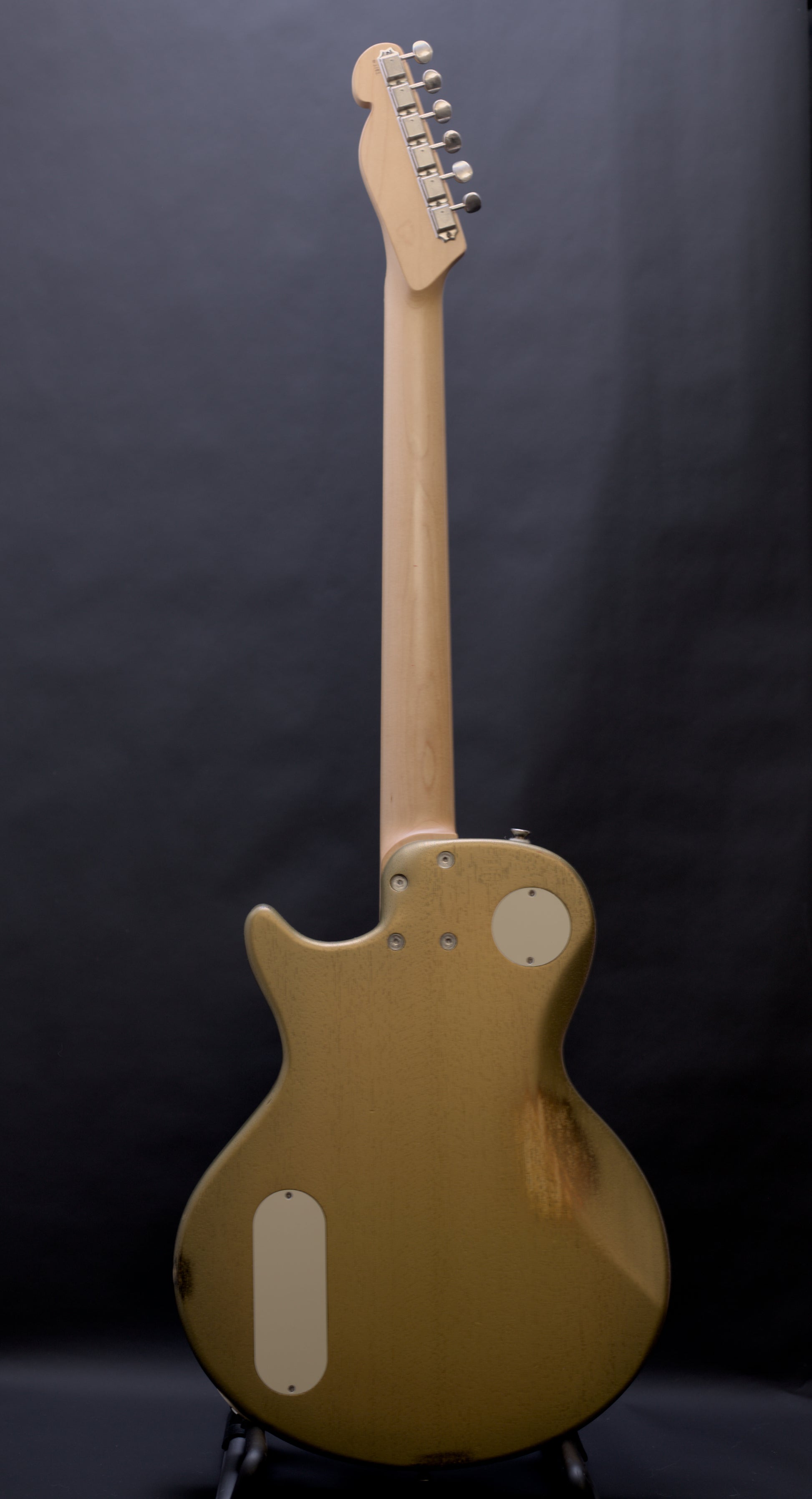 At just 6.25lbs, this lightweight, bolt-on constructed guitar consists of an Obeche body, a Maple neck, and a 22-fret Maple fingerboard. Other appointments include aged Gotoh Vintage Tuners and Tune-O-Matic bridge, a Bigsby B50 tremolo system, a Wadfather Humbucker in the bridge position and a Parkins Cream P90 pickup in the neck position.