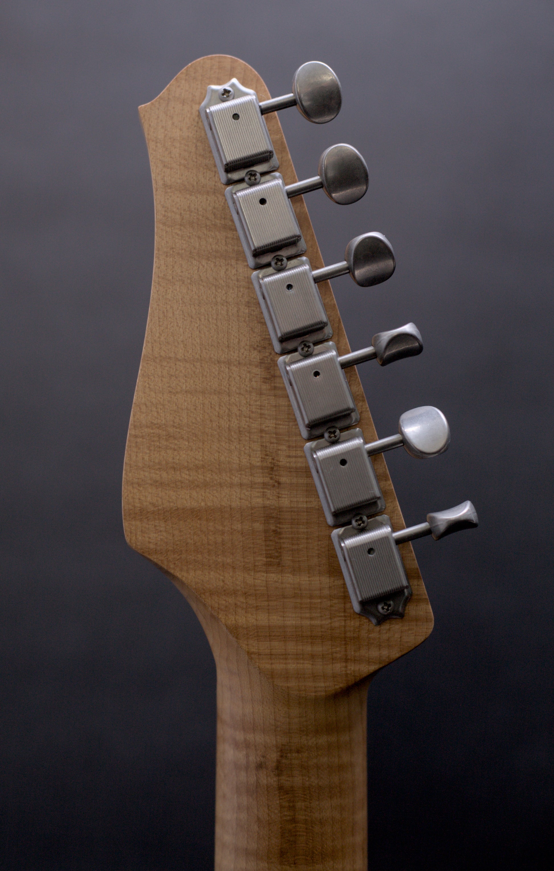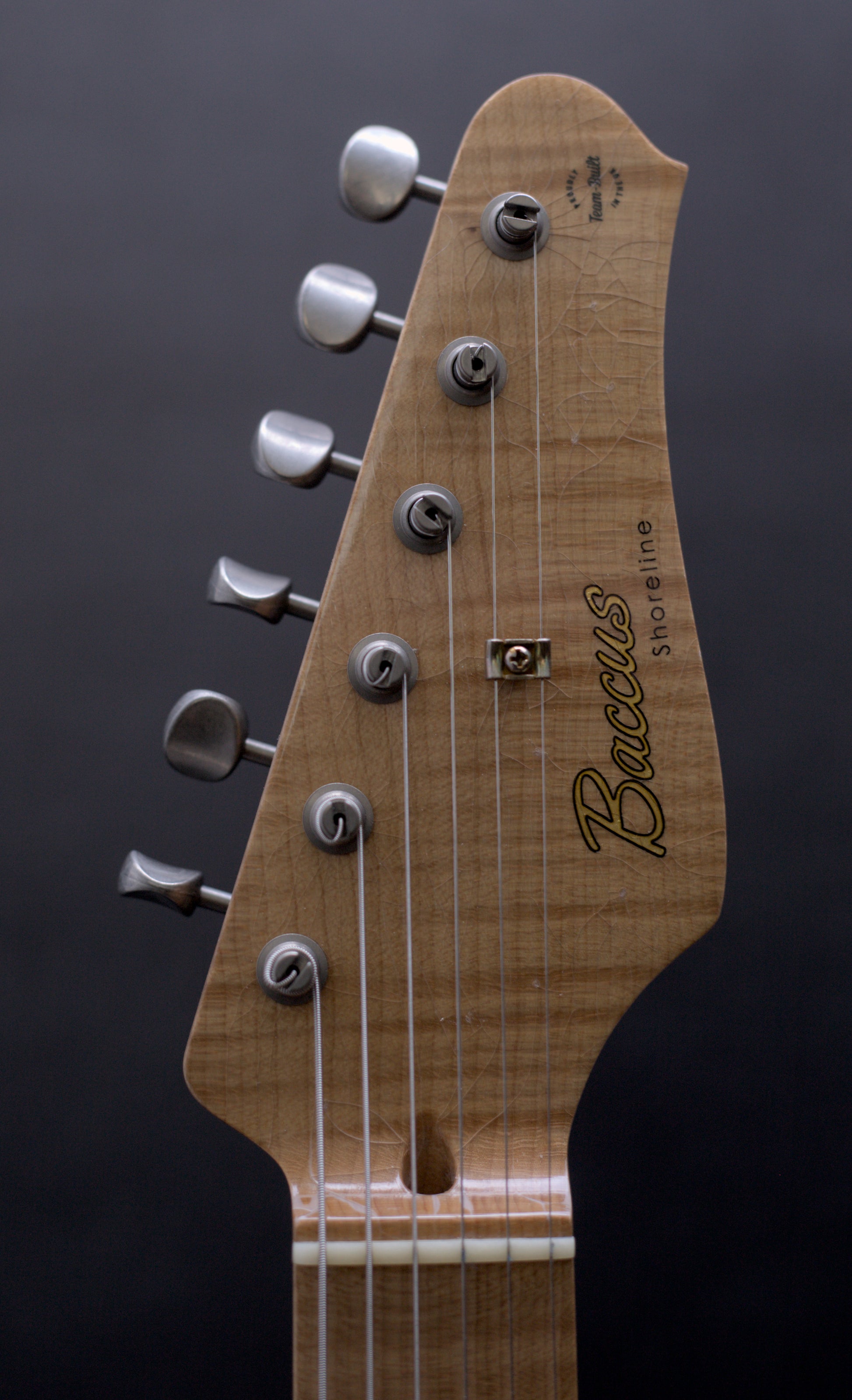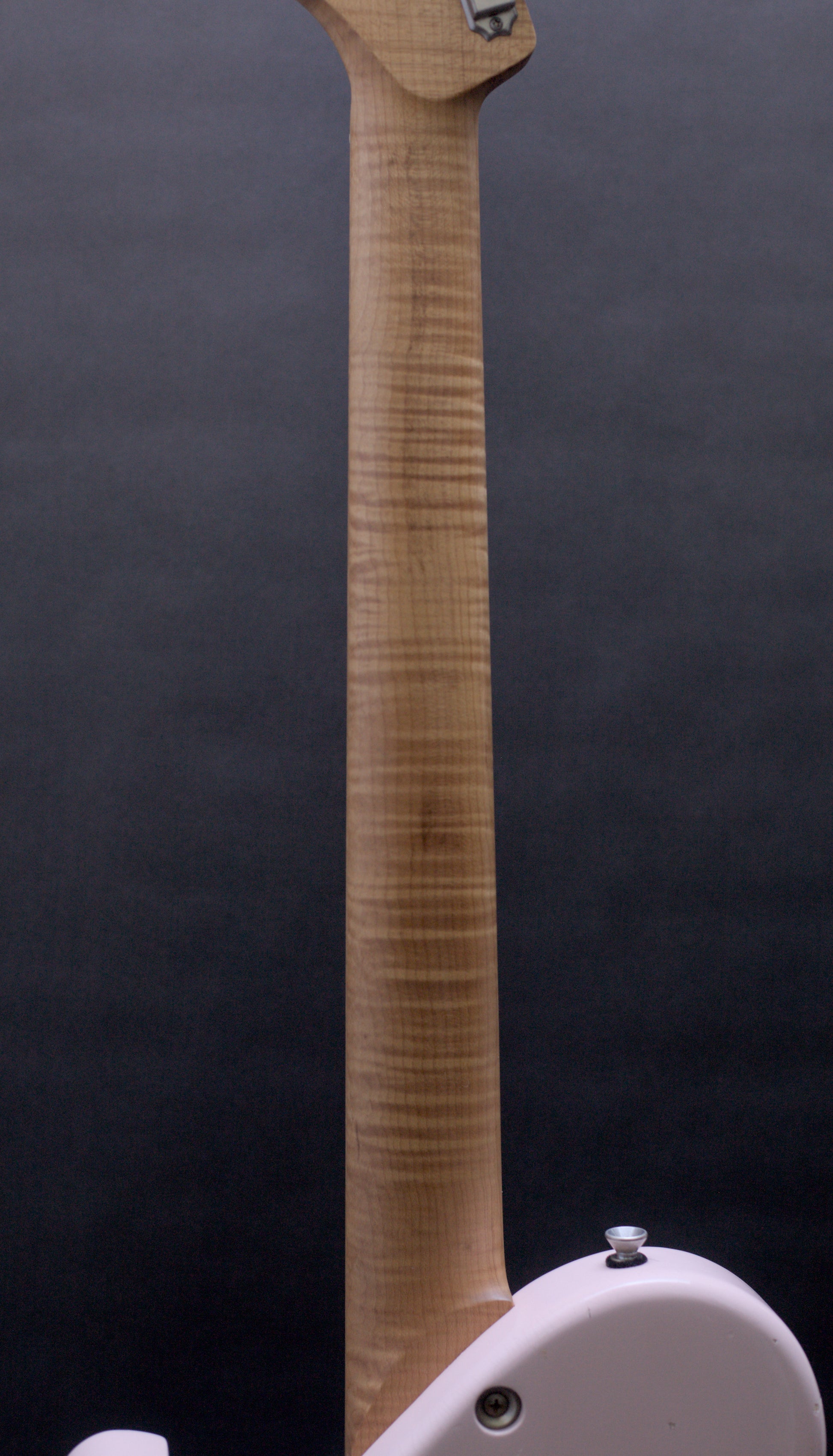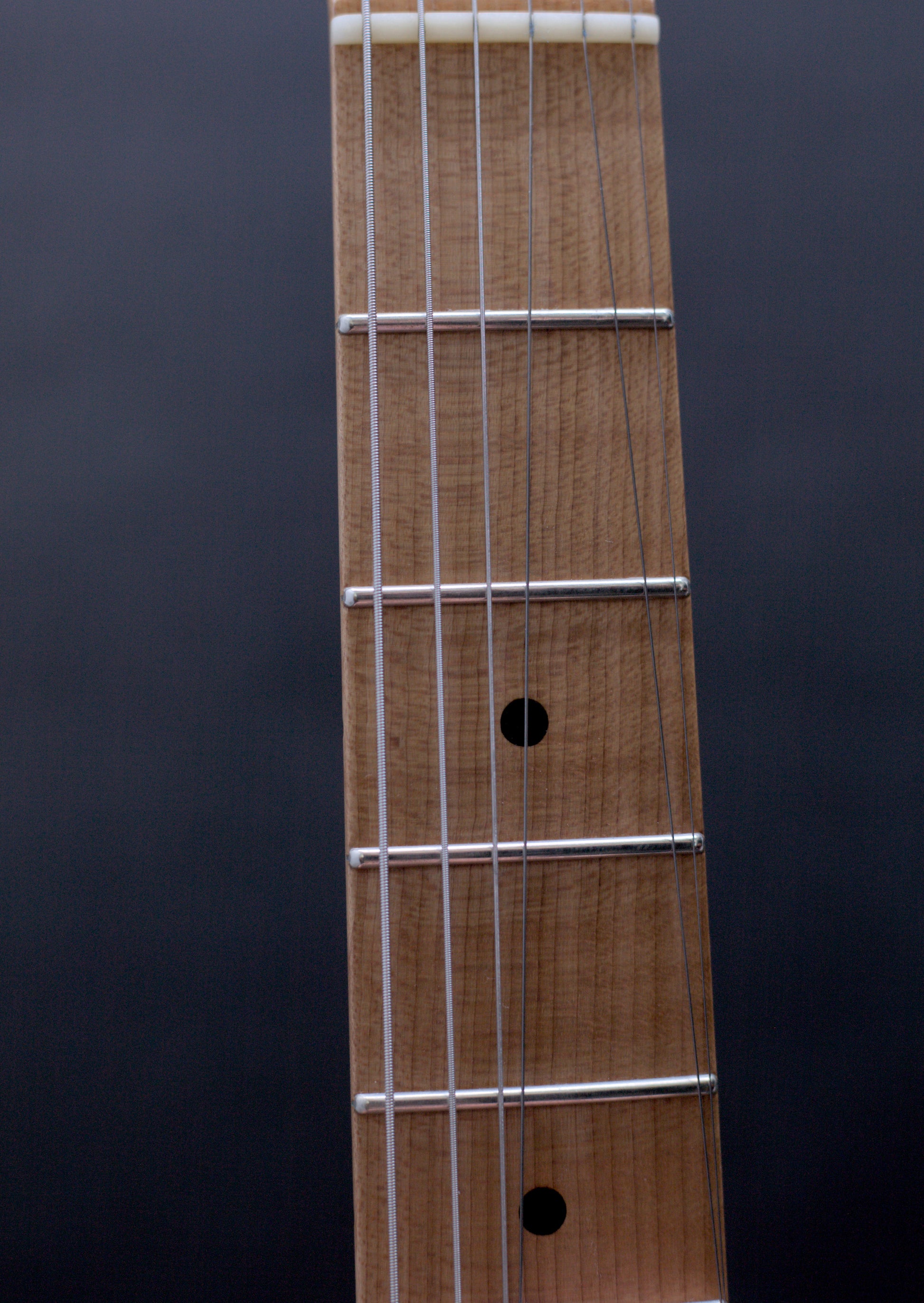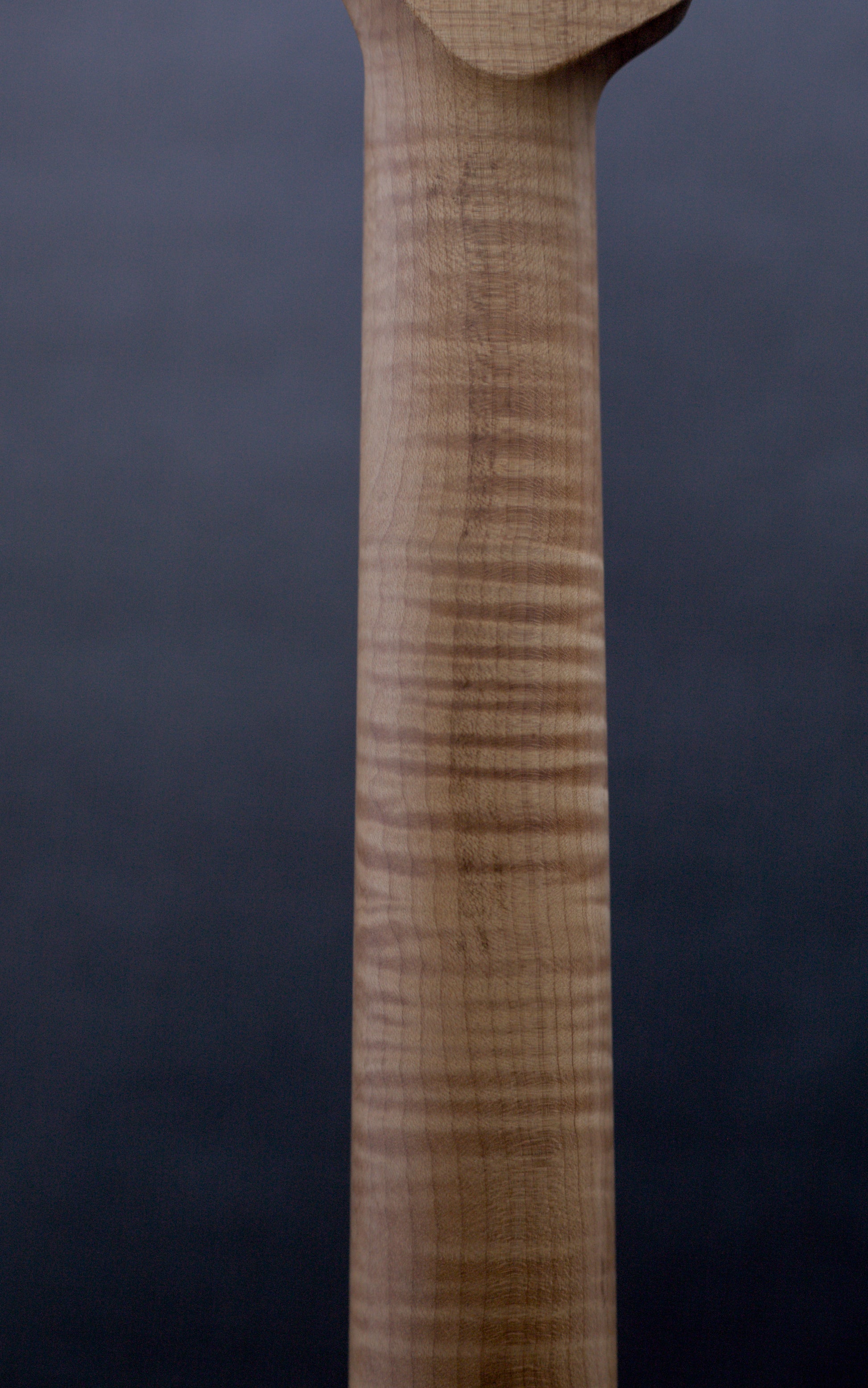 Check out the incredible roasted flamed maple neck on this handmade instrument from Seth Baccus of Cornwall. It feels as good as it looks. One of the best we have ever played.