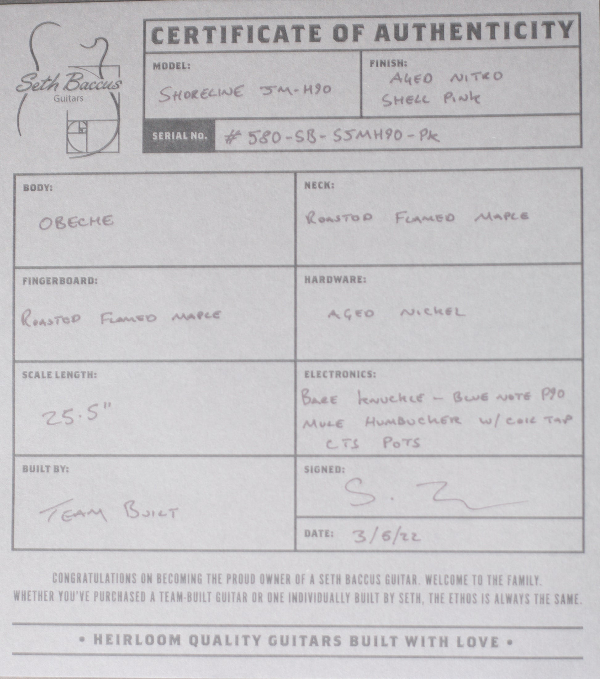 Seth Baccus Shoreline JM H90, Roasted Flame Maple Neck, Aged Nitro Shell Pink