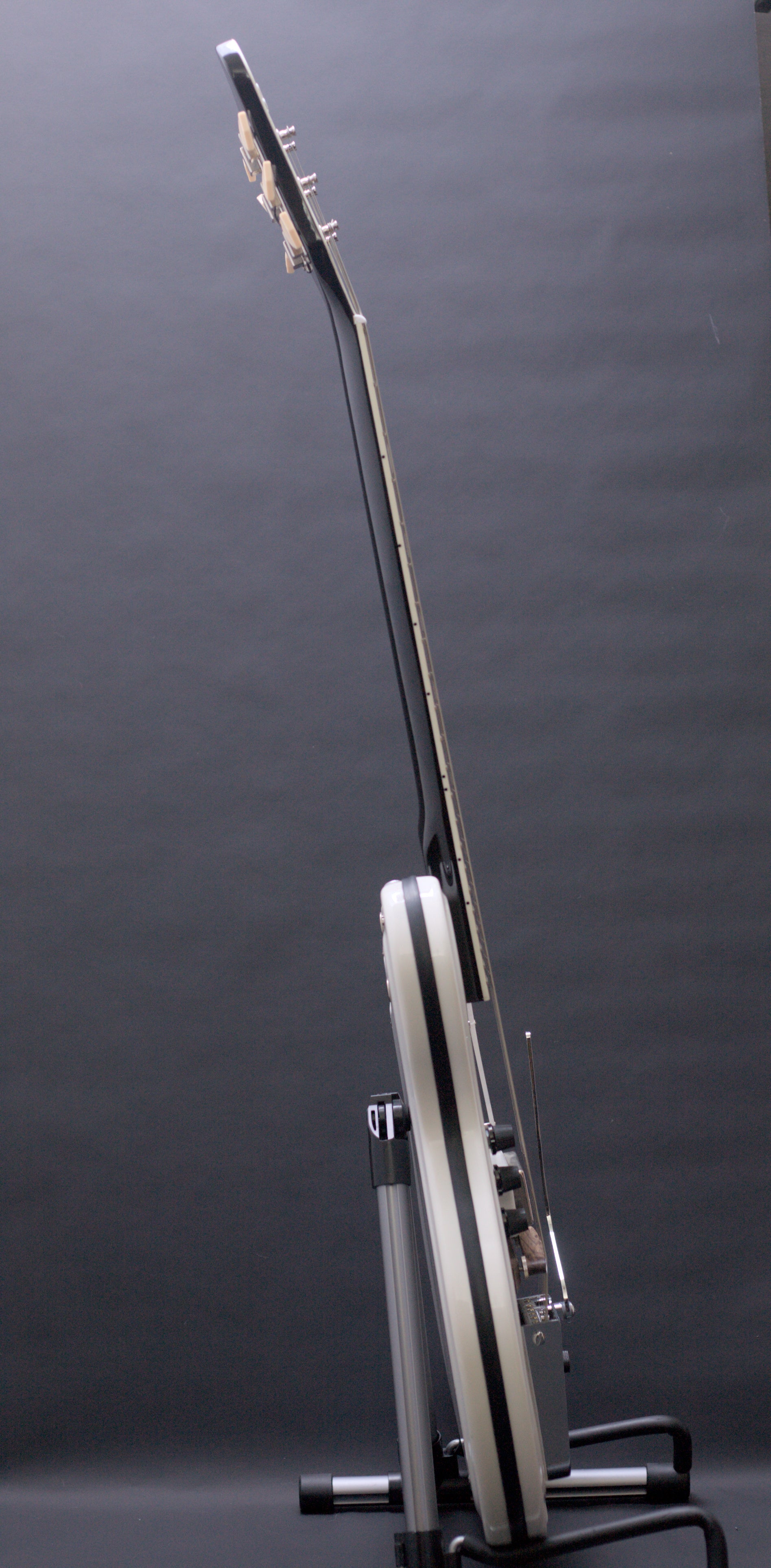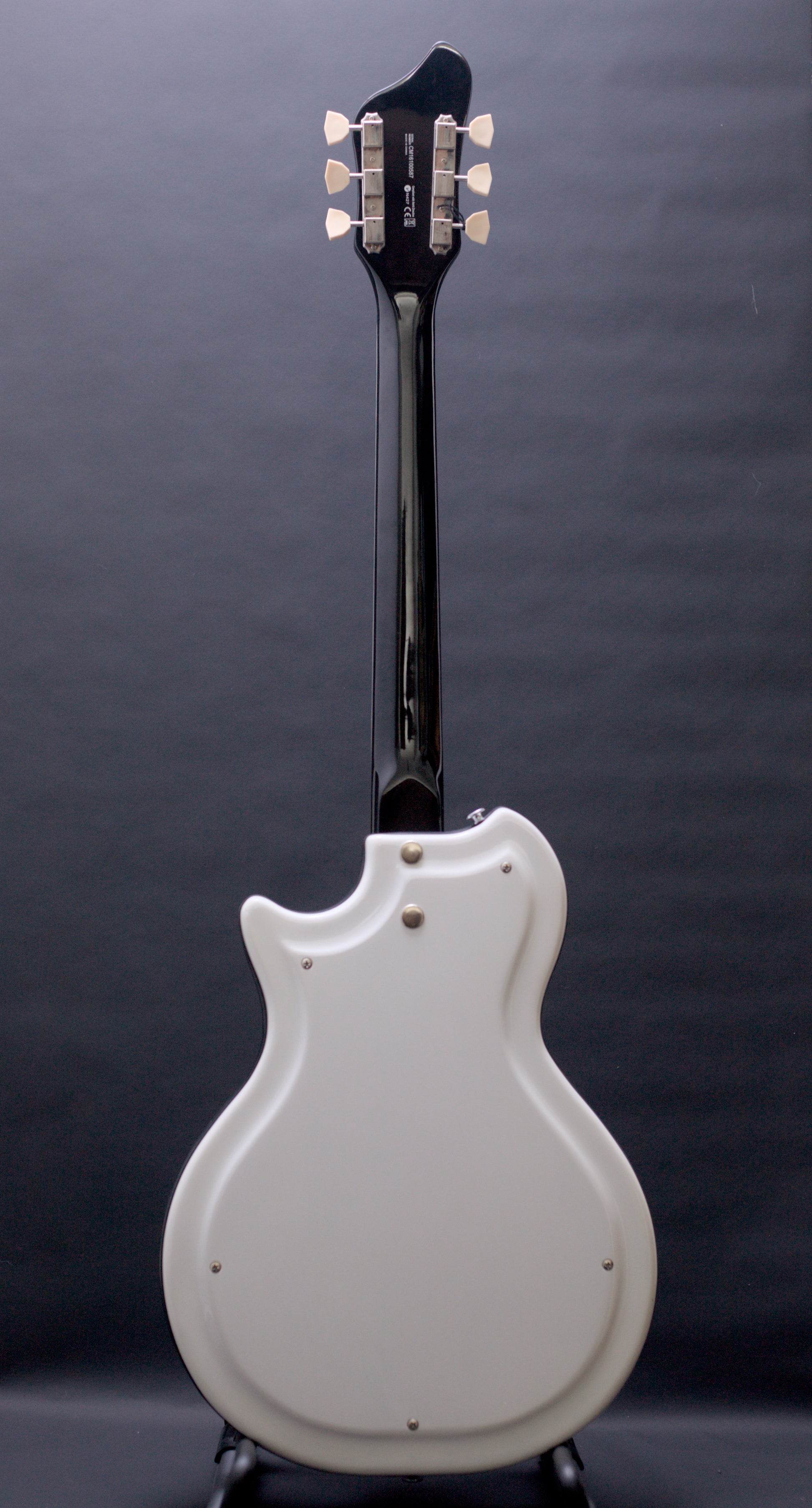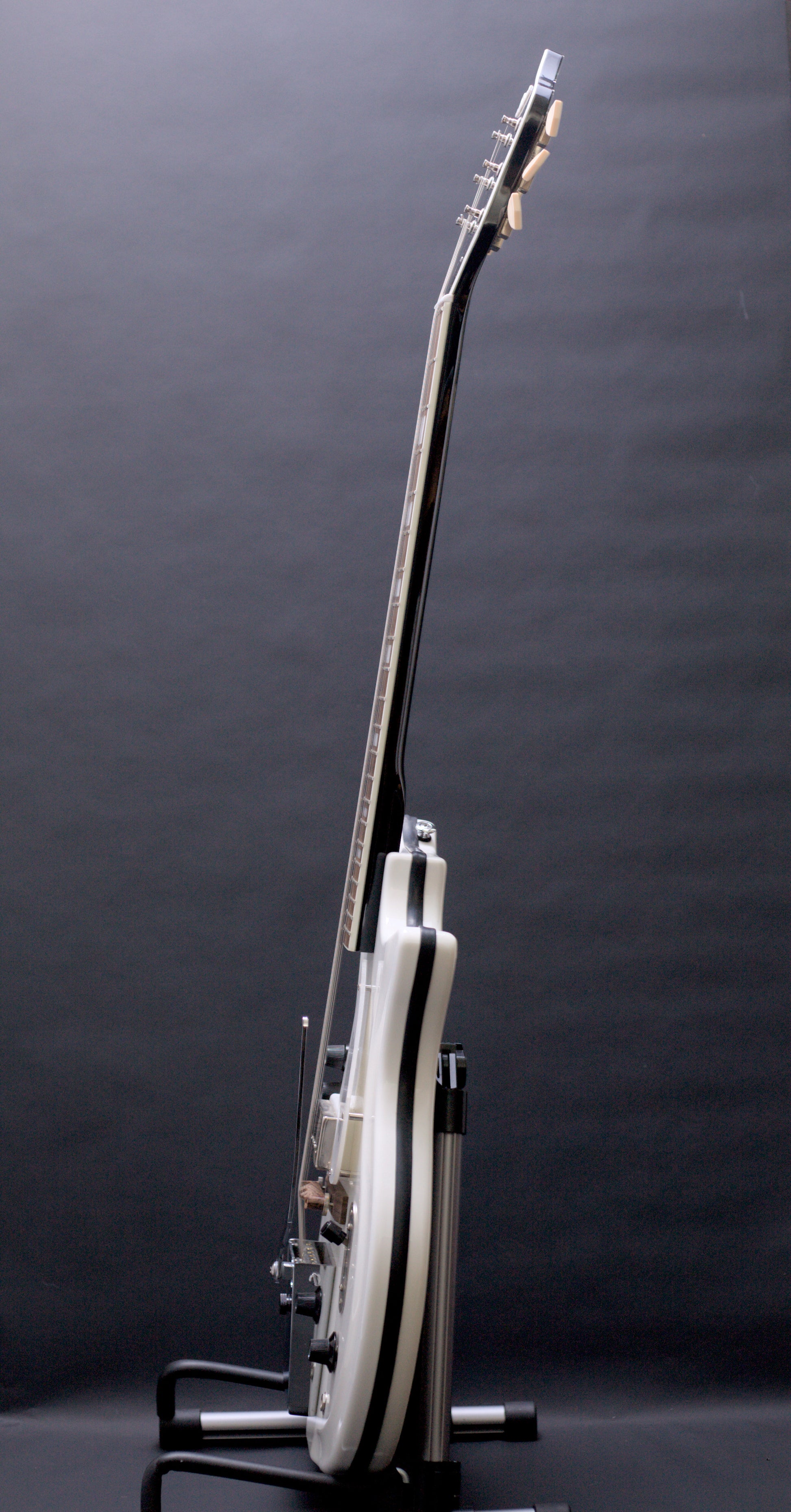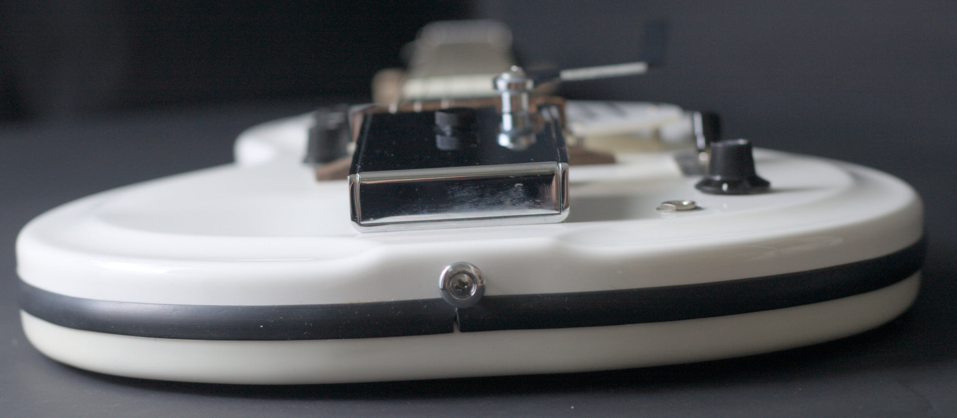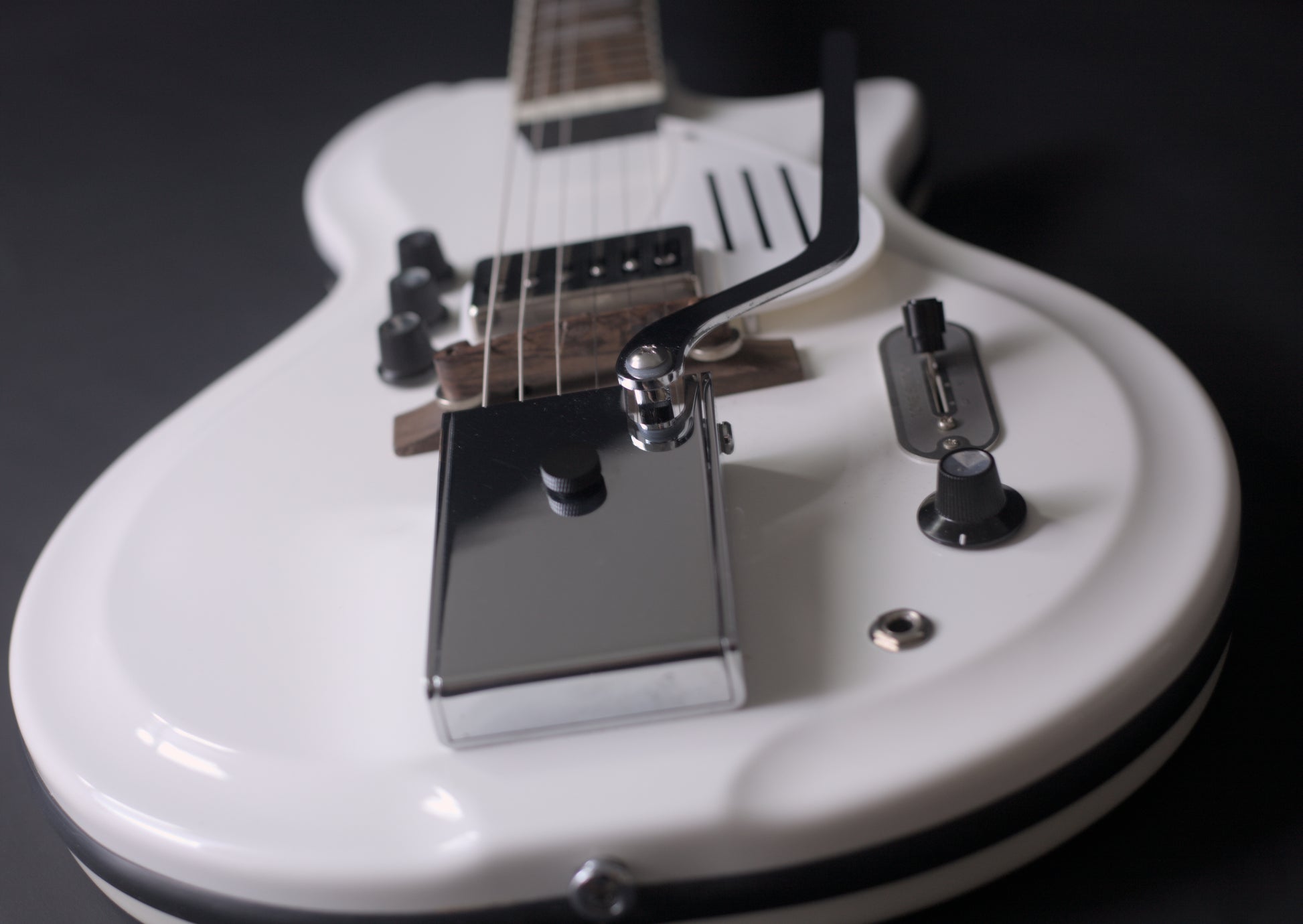 The White Holiday is a reproduction of the piezo- and vibrato bar-equipped fiberglass Supro electric guitar that was first manufactured in the early 1960s.